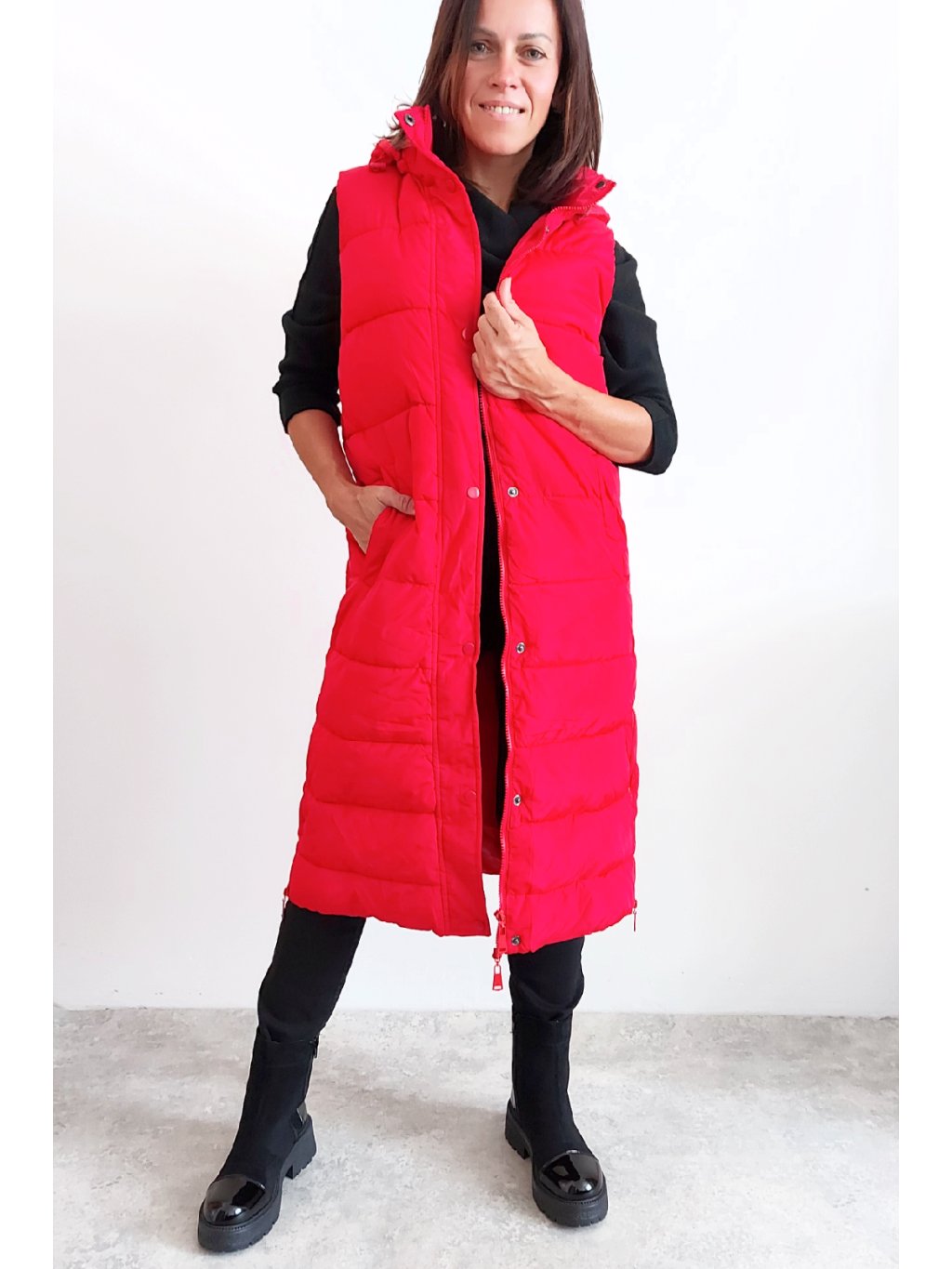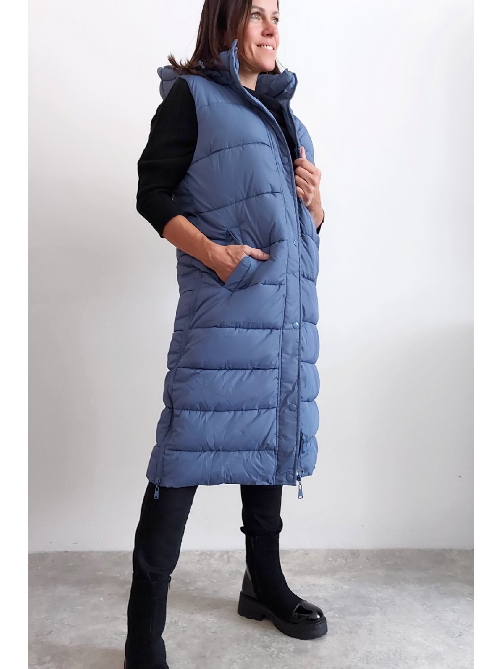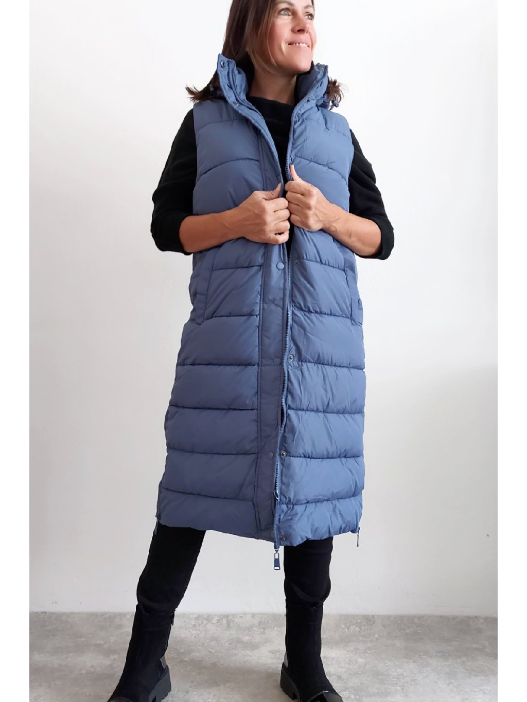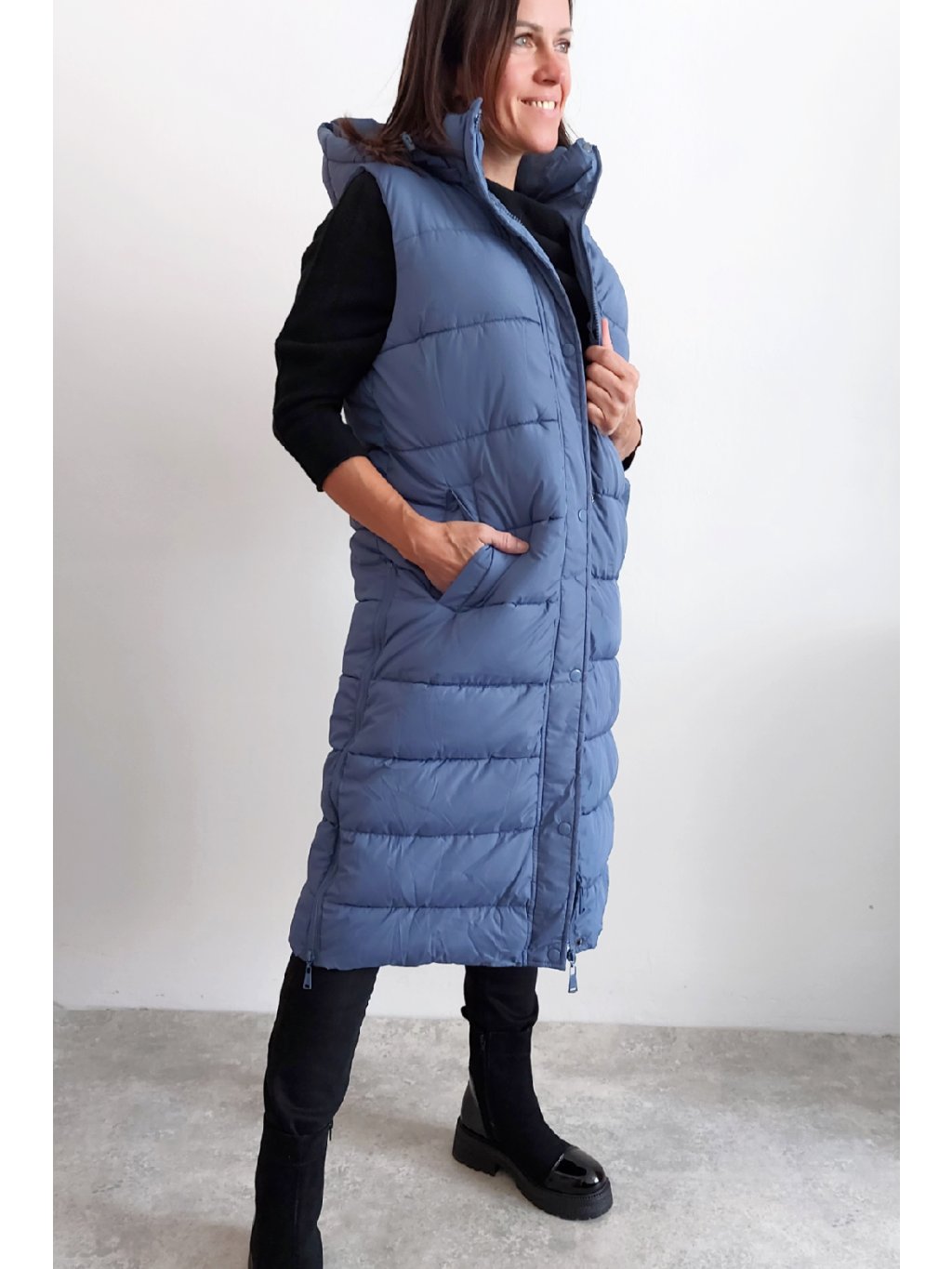 Vysoce kvalitní a trendy vesta. Má kapuci, která je na zip a lze ji tak odepnout. Zapínání na zip, který je schovaný lemem látky se zapínáním na cvoky. Vpředu jsou kapsy. Po stranách jsou zipy, které lze rozepnout. Velikosti odpovídají. Vel. S focena na vel. XS, výška 163cm.