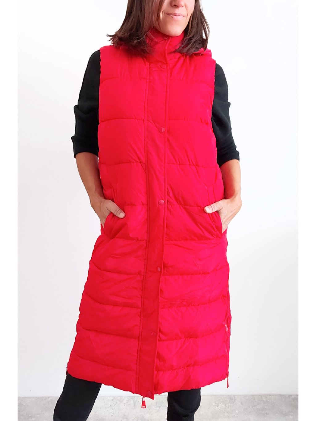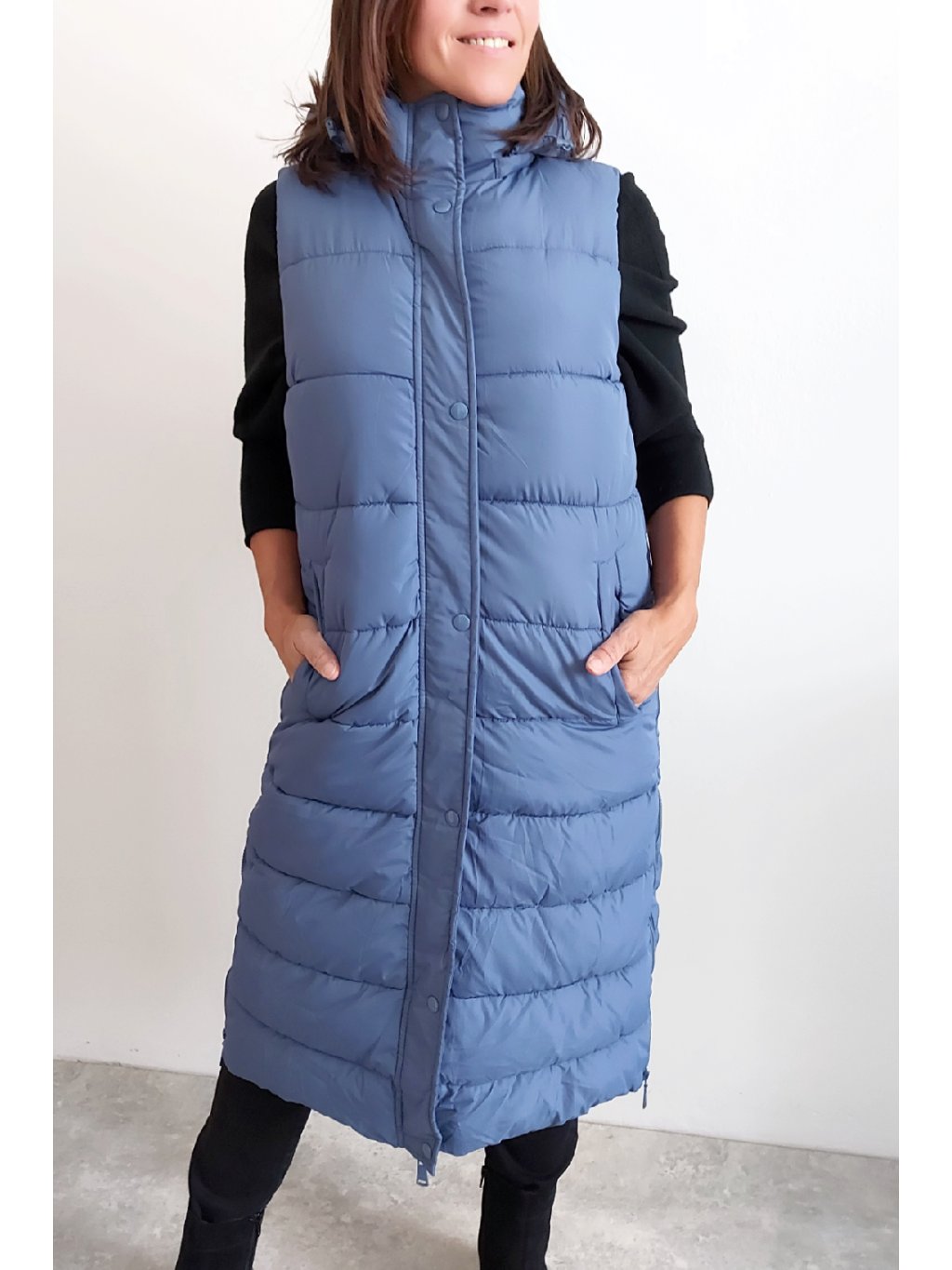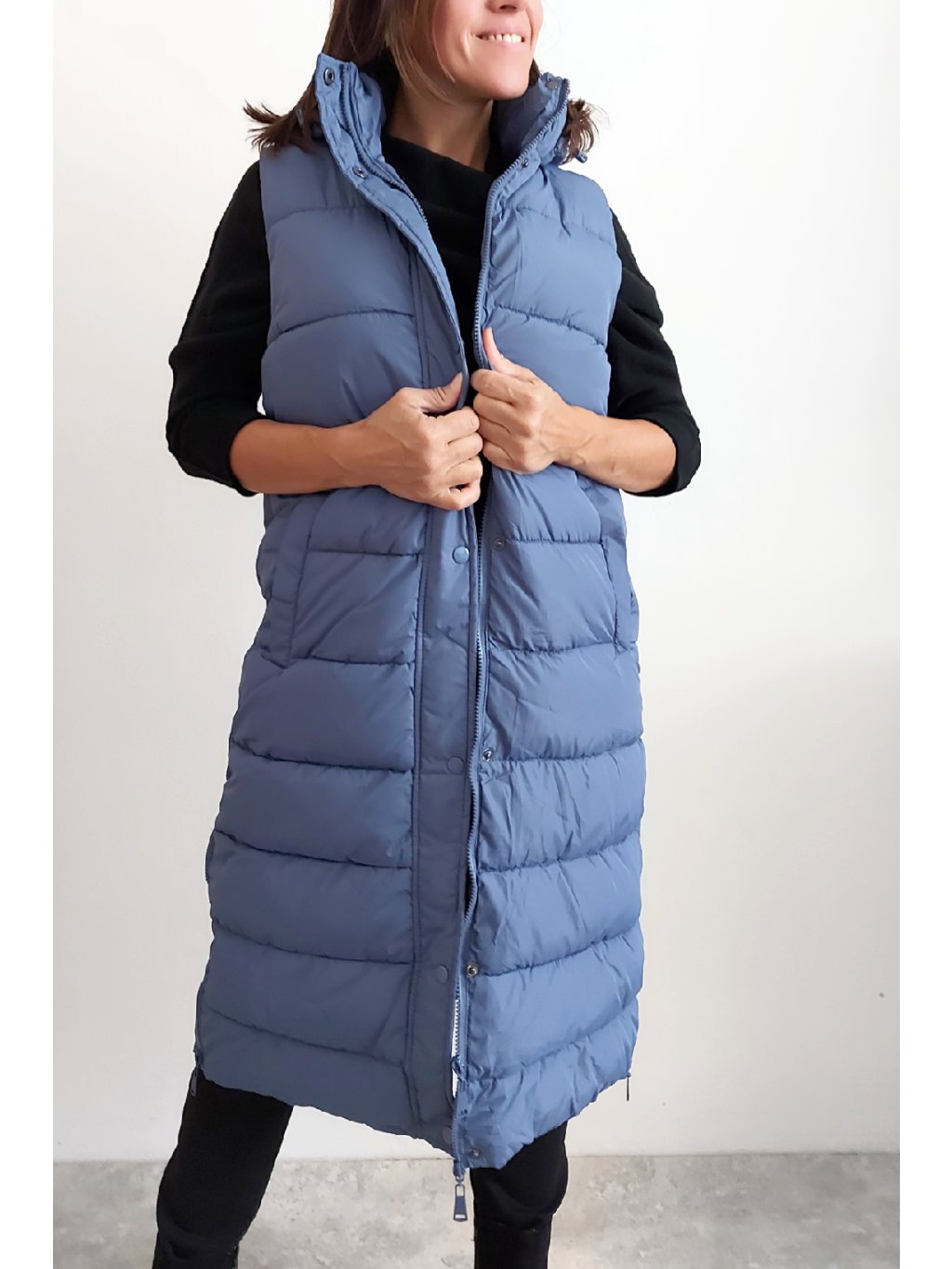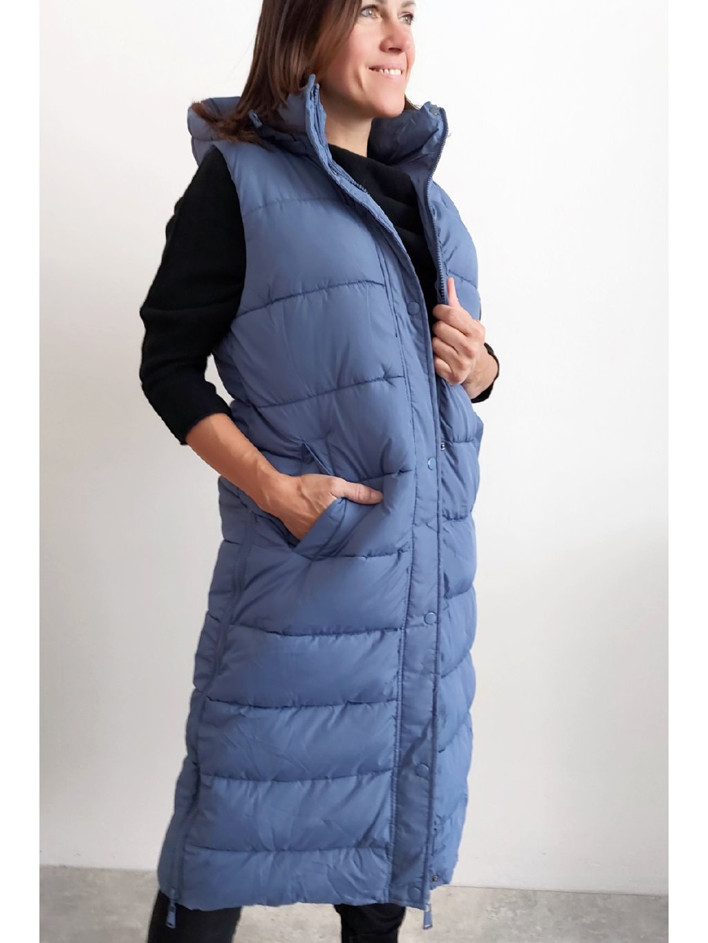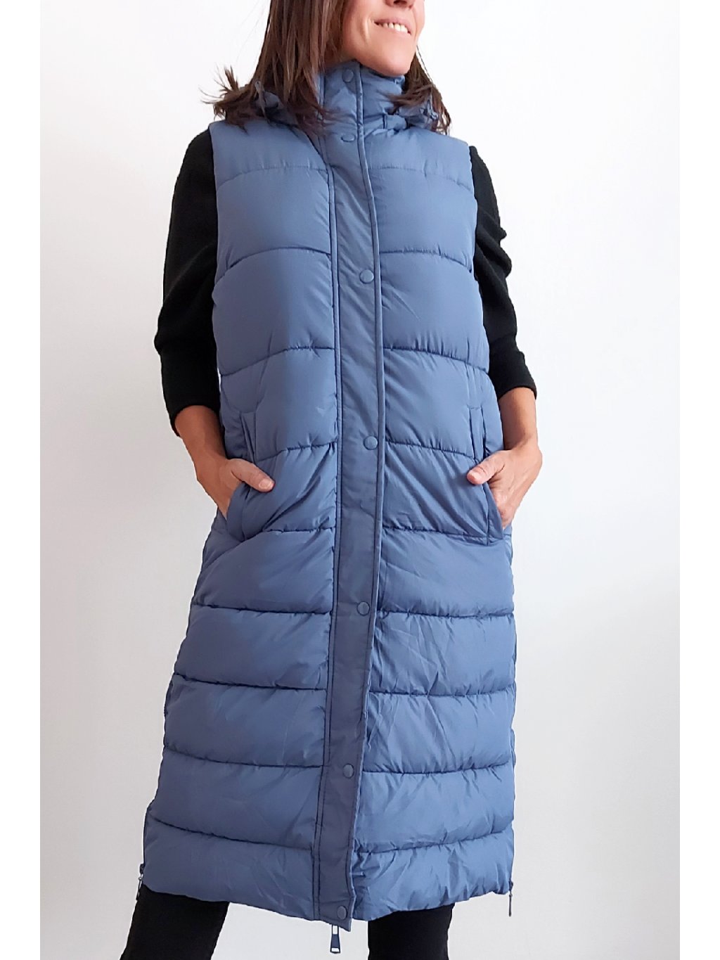 Vysoce kvalitní a trendy vesta. Má kapuci, která je na zip a lze ji tak odepnout. Zapínání na zip, který je schovaný lemem látky se zapínáním na cvoky. Vpředu jsou kapsy. Po stranách jsou zipy, které lze rozepnout. Velikosti odpovídají. Vel. S focena na vel. XS, výška 163cm.