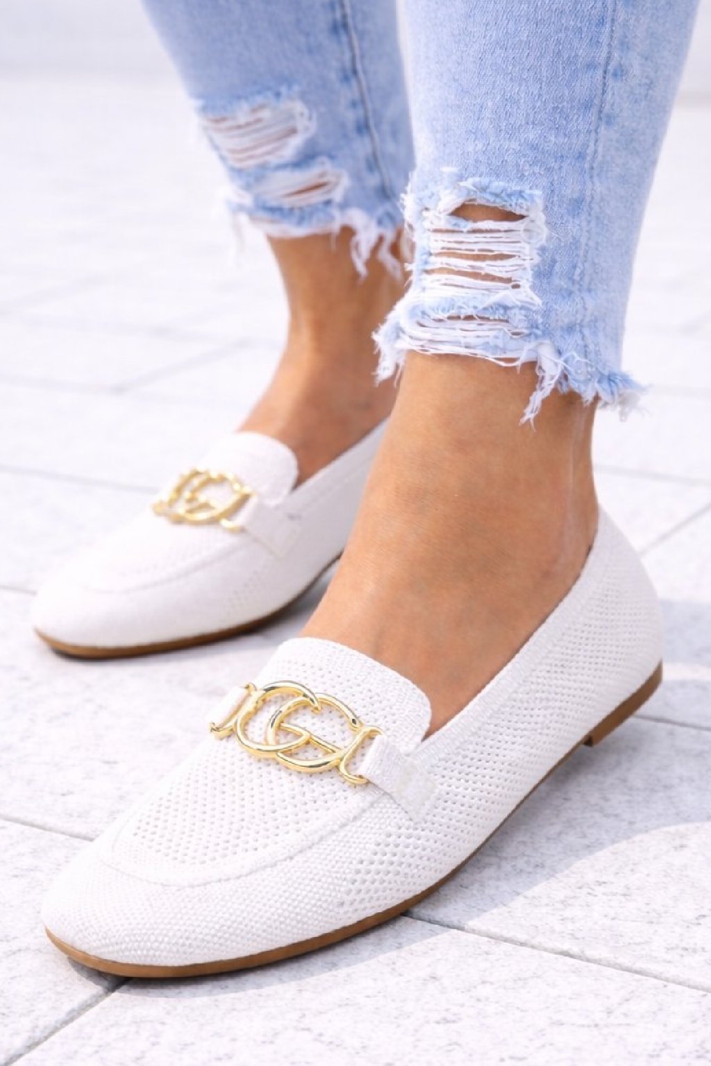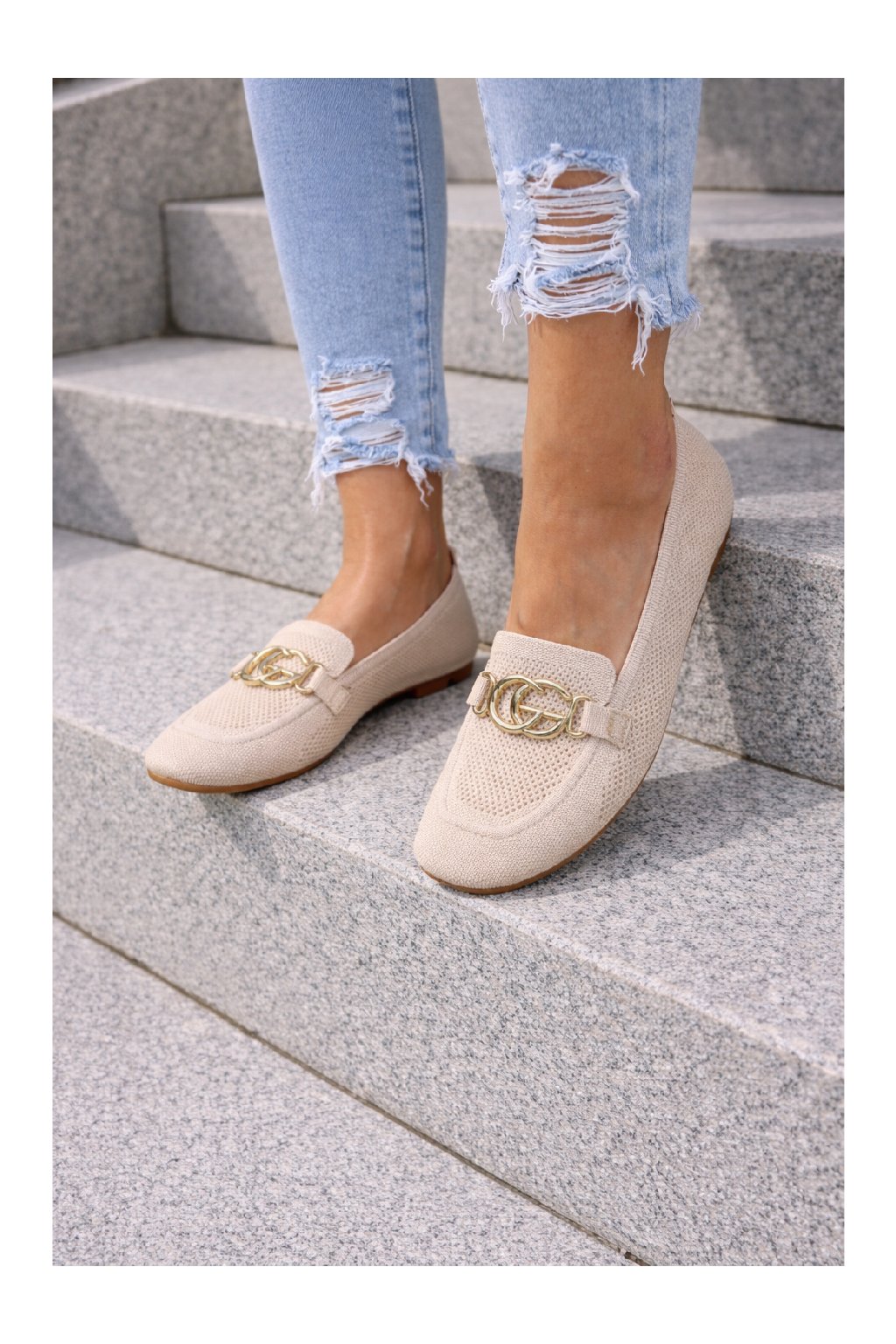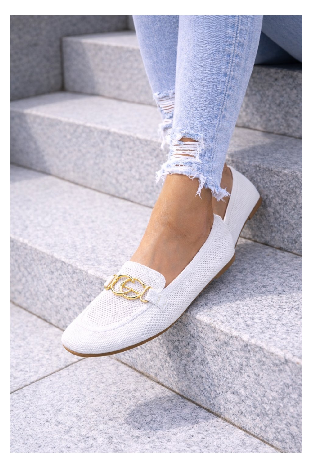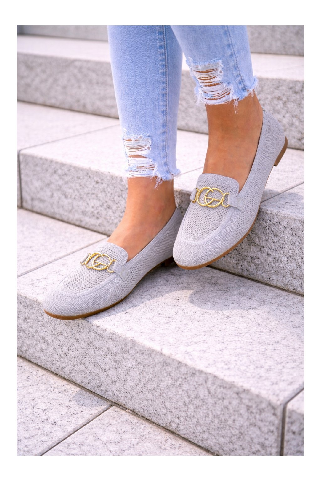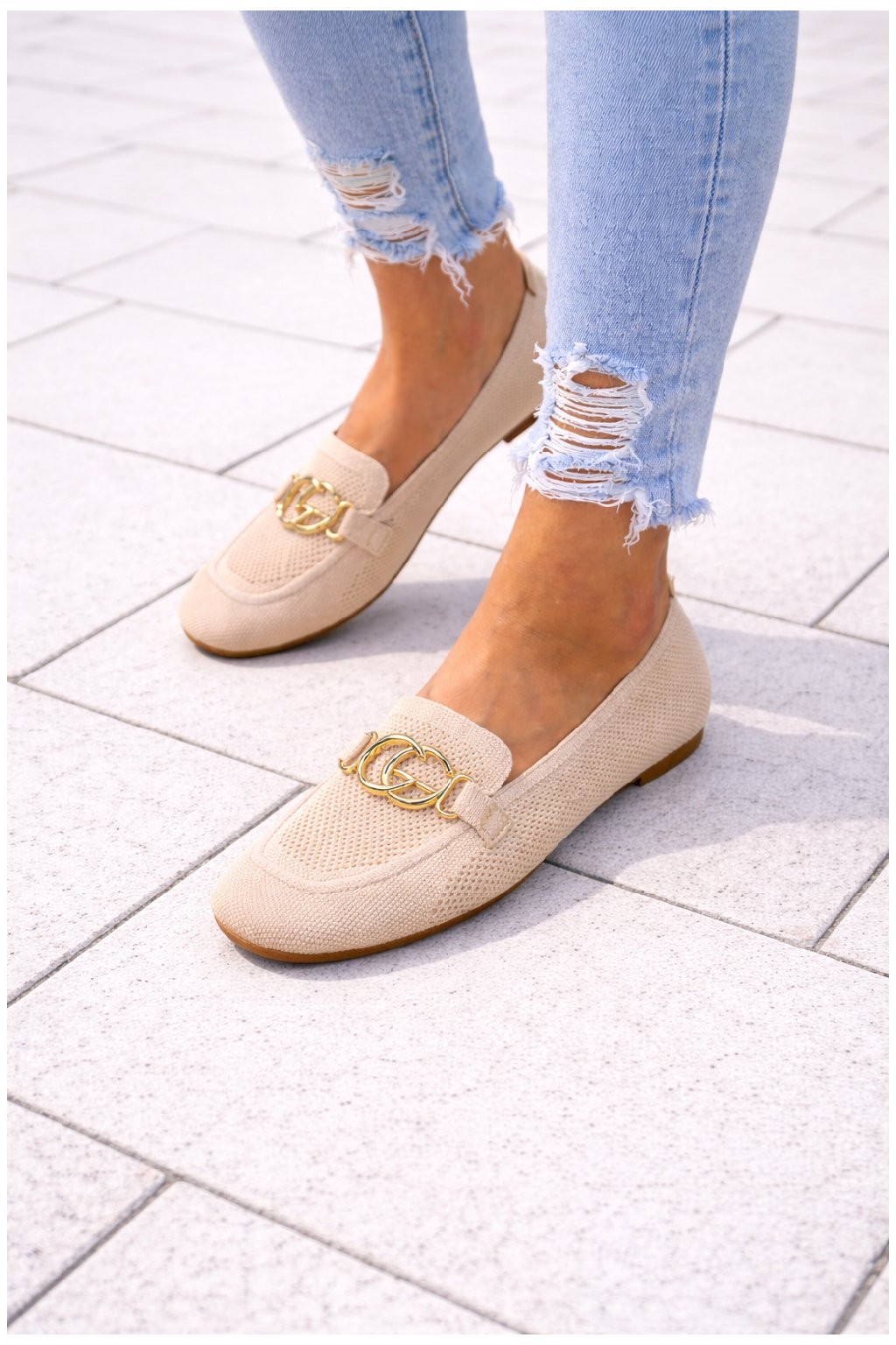 Nazouvací perforované mokasíny zdobené vpředu zlatou sponou. Měkké, velmi pohodlné. Úžasně pohodlné. Velikosti odpovídají.