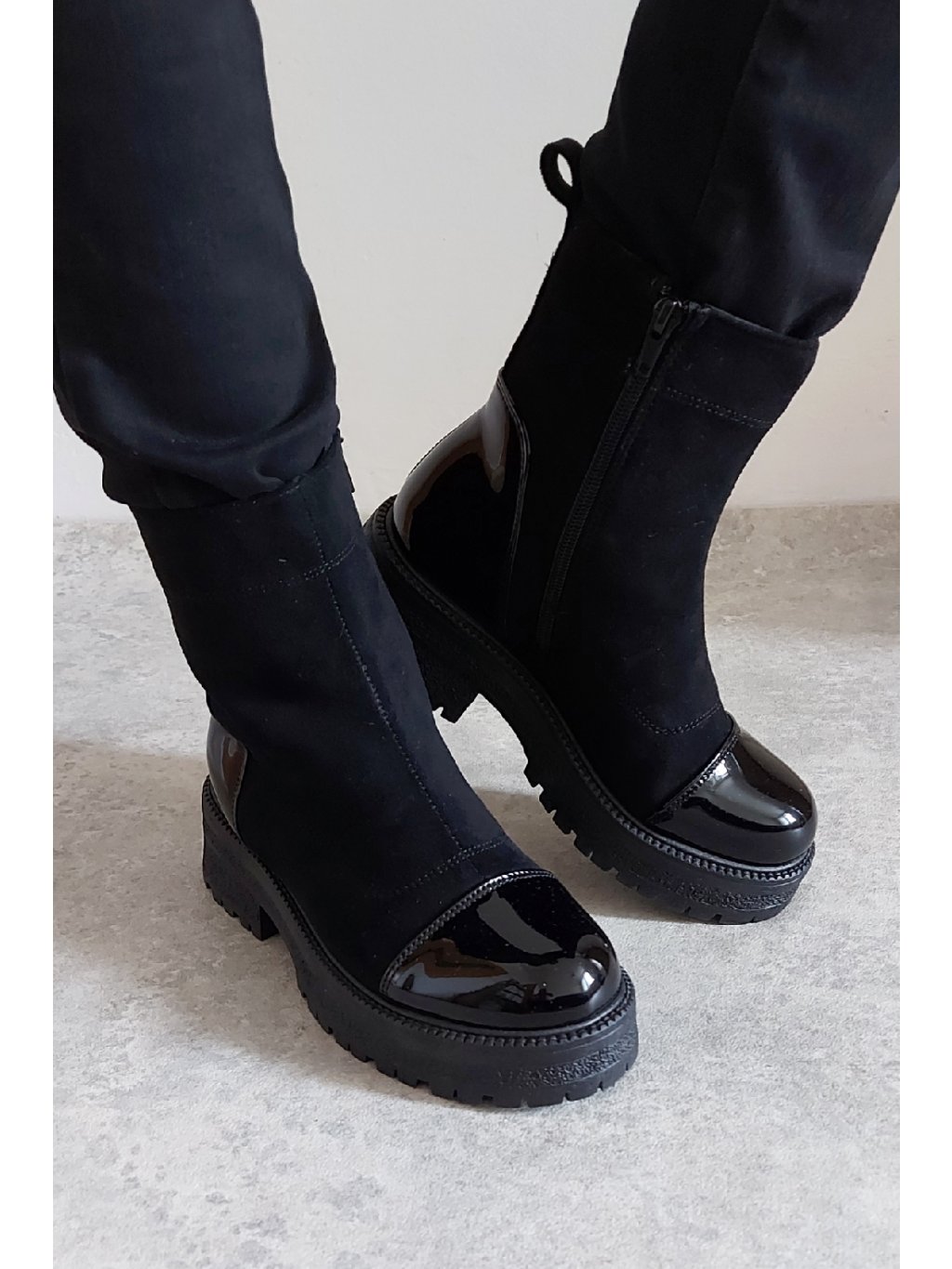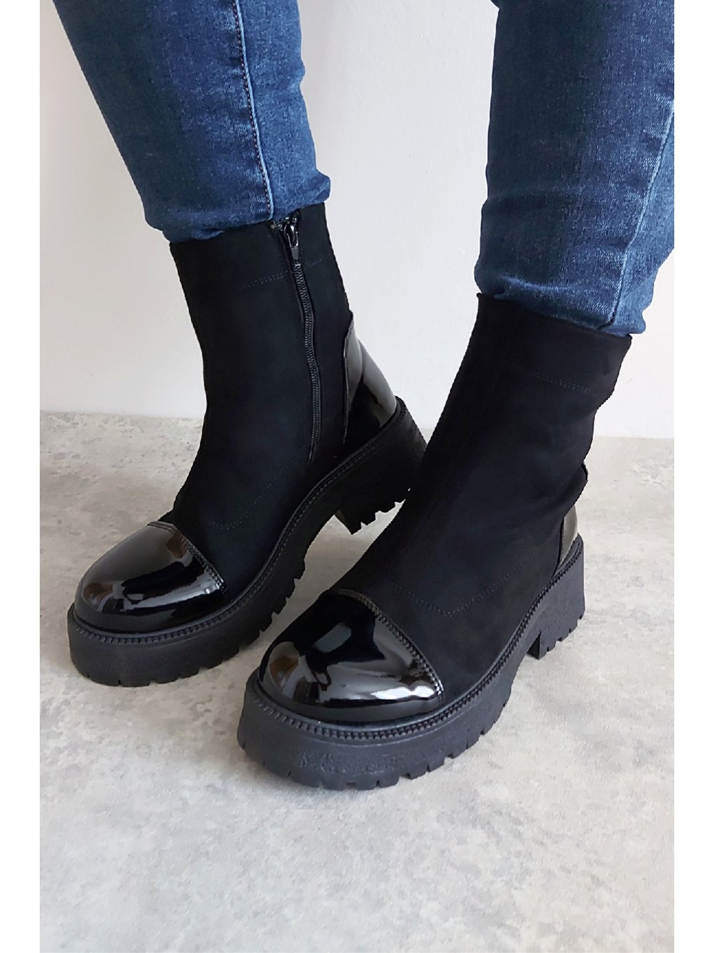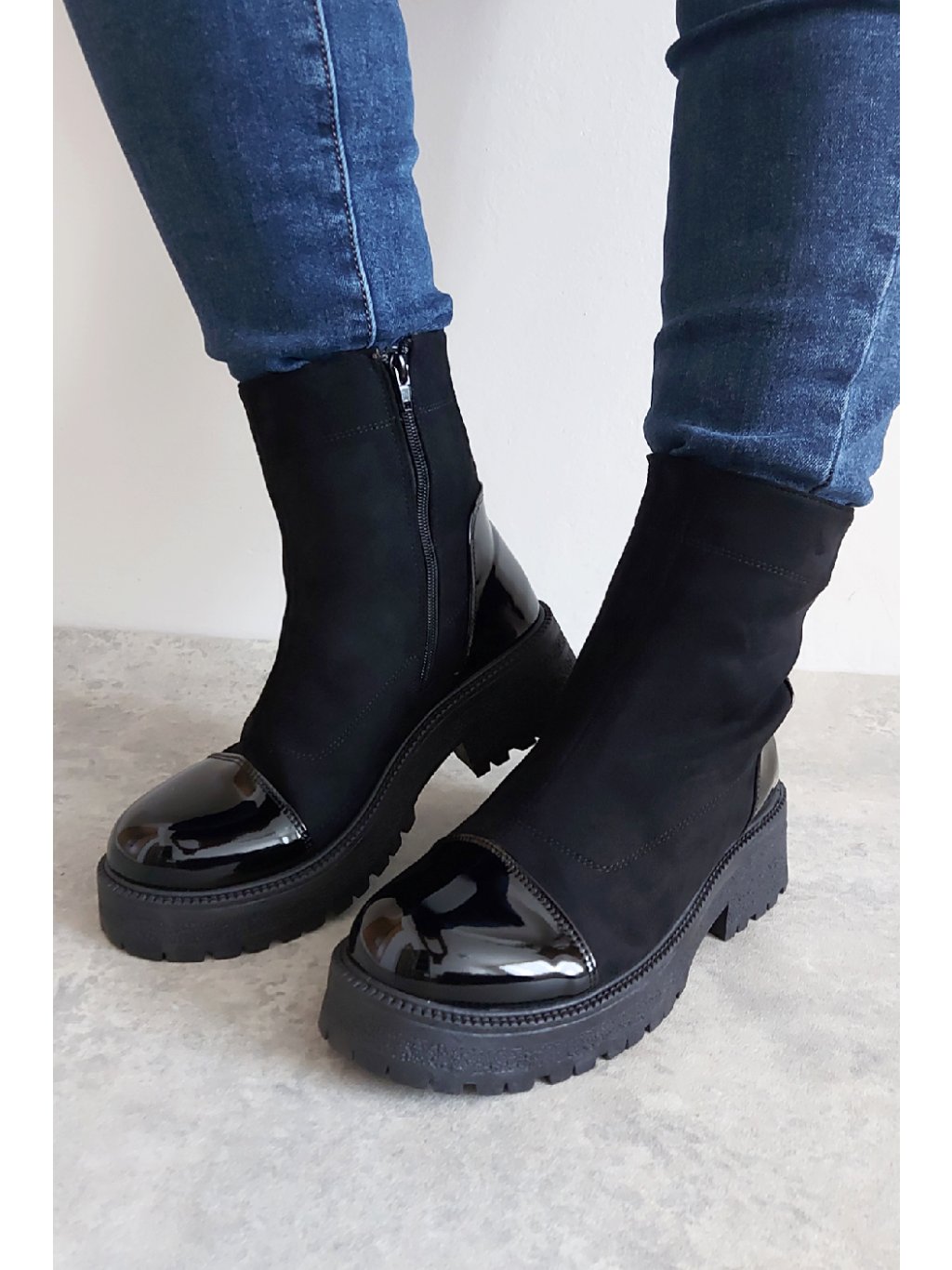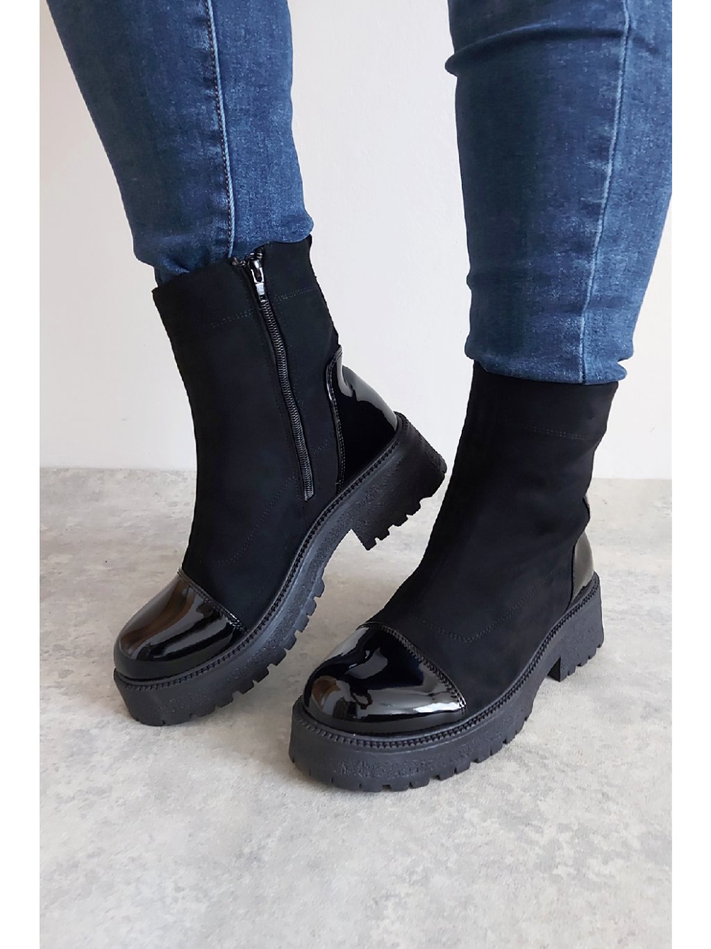 Trendy nízké kozačky. Zapínání z boku na zip. Špice a pata z lakovaného materiálu. Protiskluzová podrážka, výška podrážky 3cm, v místě podpatku 5cm. Zateplené krátkým chloupkem Velikosti odpovídají.