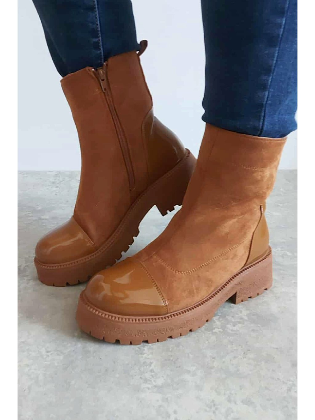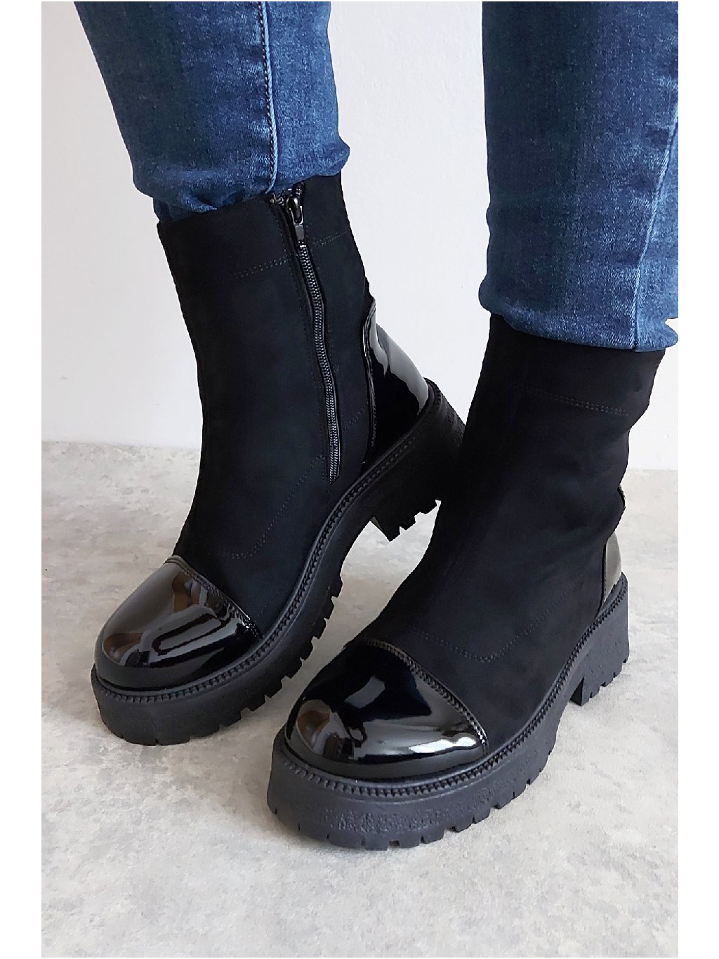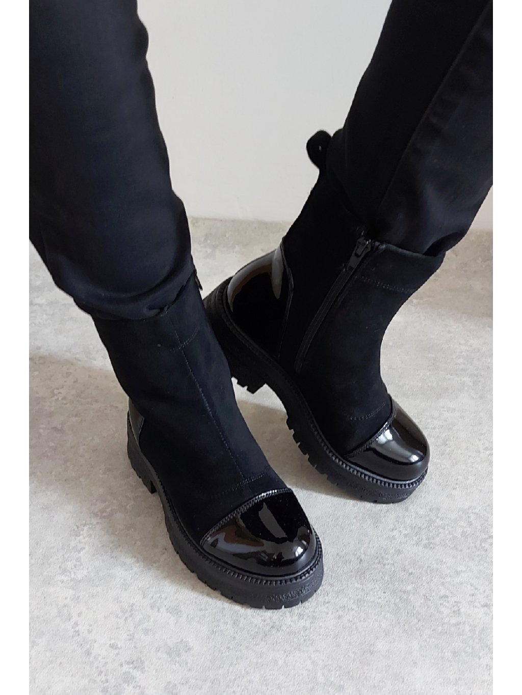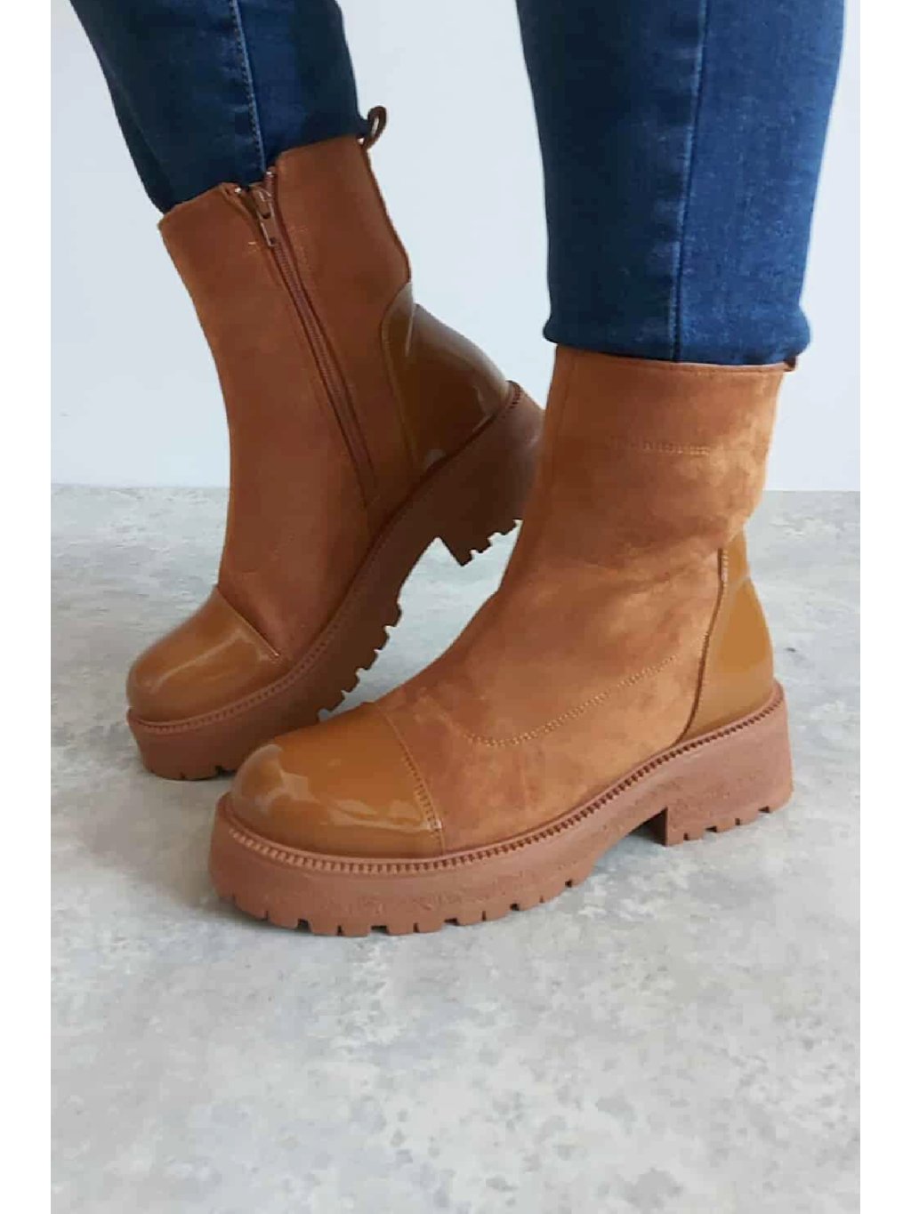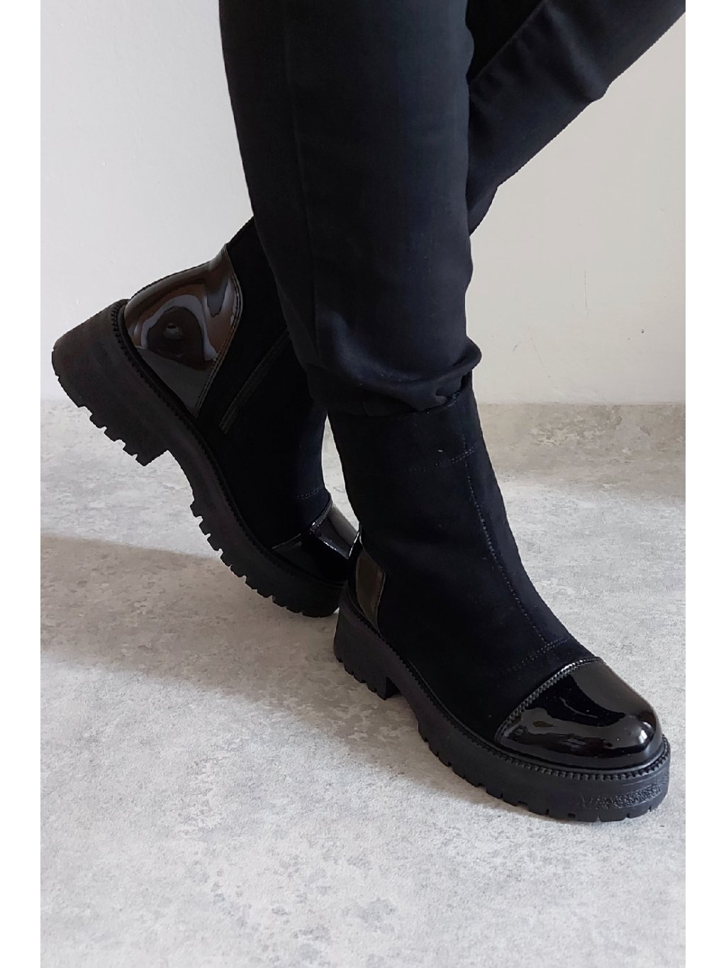 Trendy nízké kozačky. Zapínání z boku na zip. Špice a pata z lakovaného materiálu. Protiskluzová podrážka, výška podrážky 3cm, v místě podpatku 5cm. Zateplené krátkým chloupkem Velikosti odpovídají.