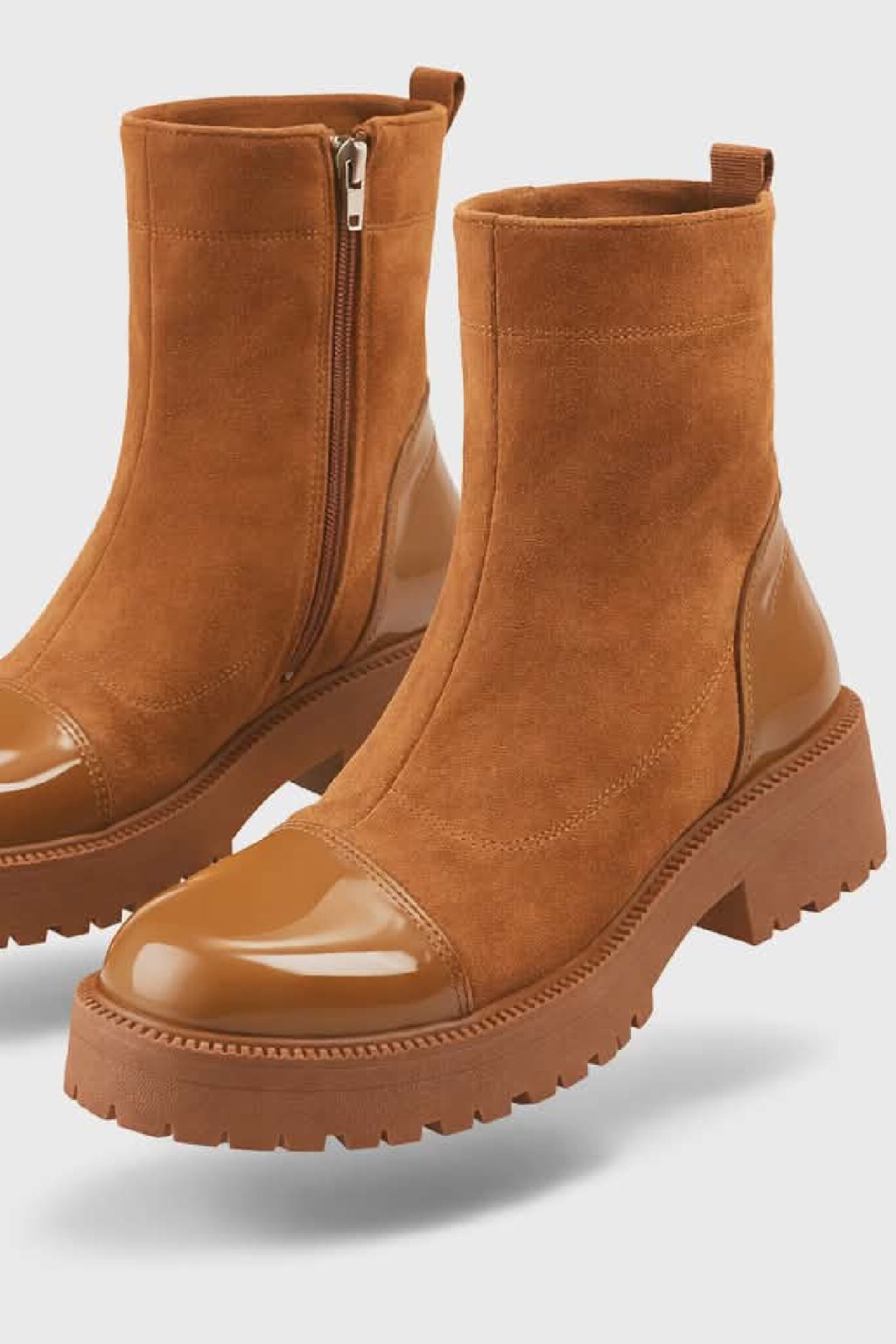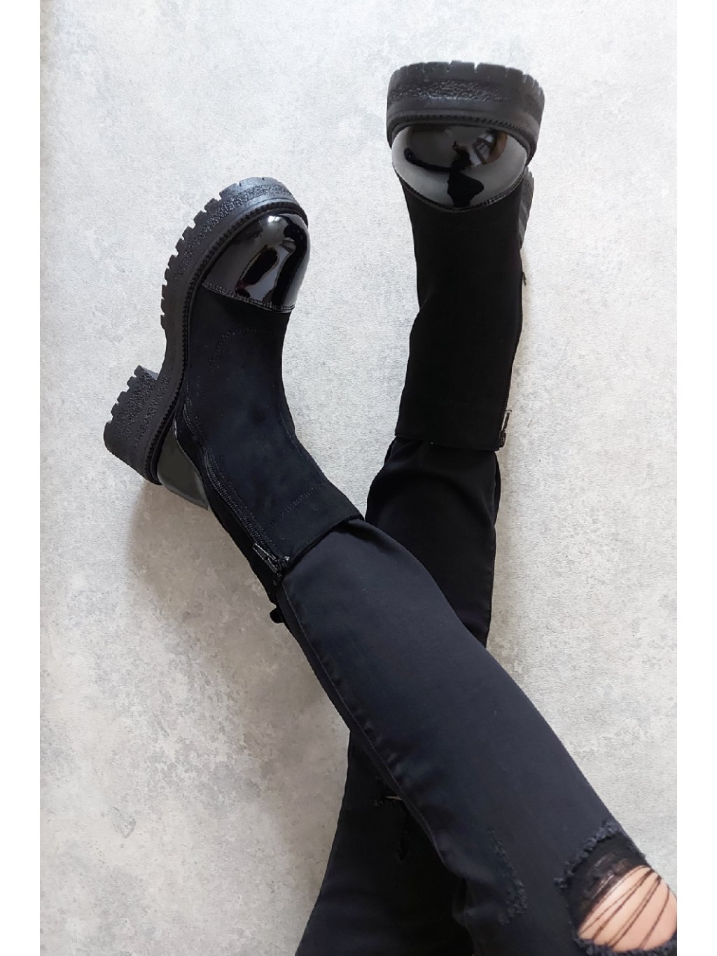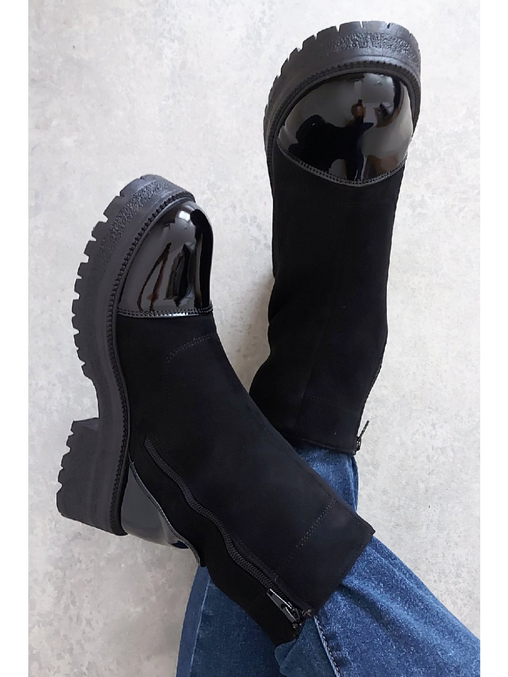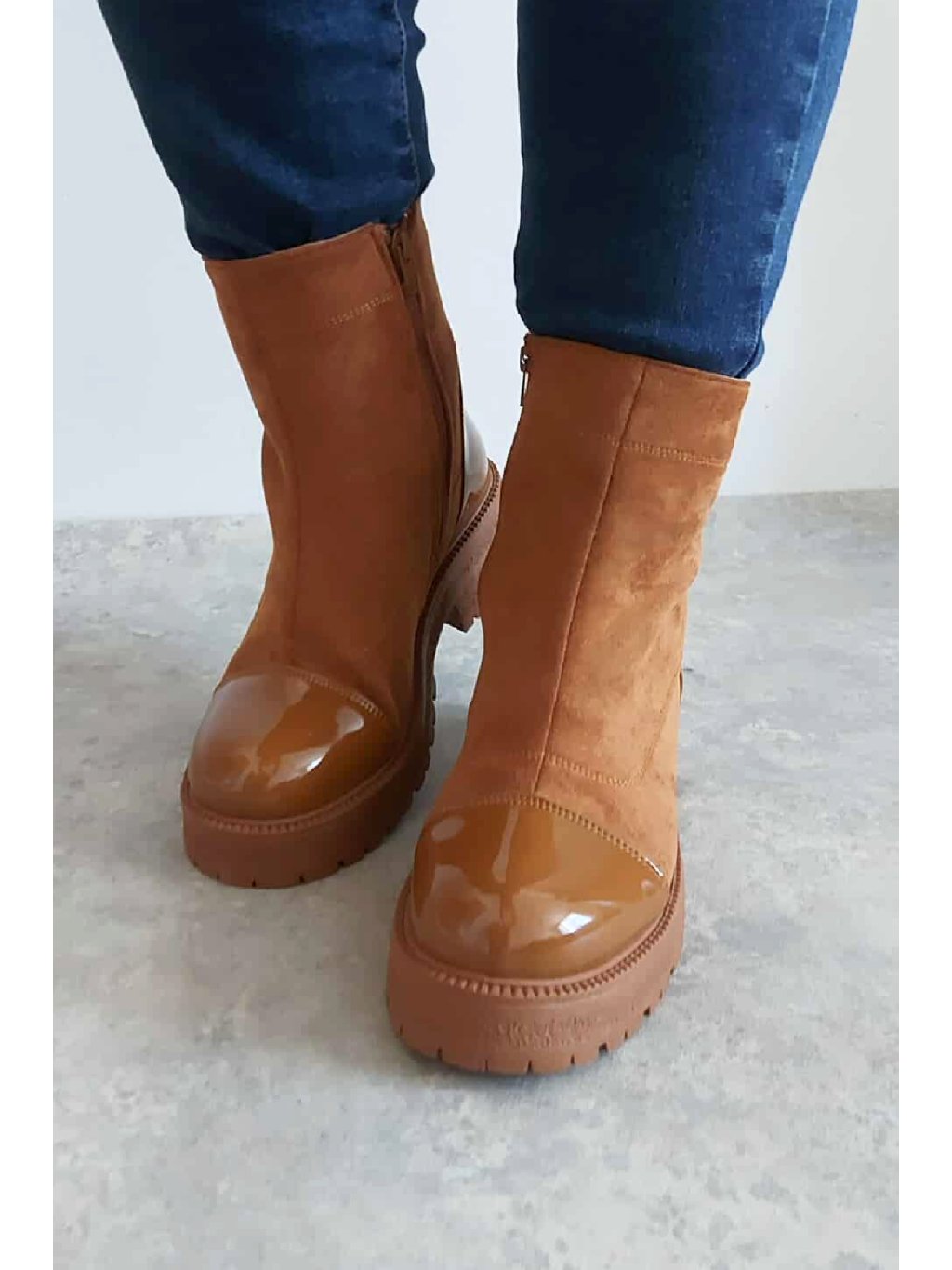 Trendy nízké kozačky. Zapínání z boku na zip. Špice a pata z lakovaného materiálu. Protiskluzová podrážka, výška podrážky 3cm, v místě podpatku 5cm. Zateplené krátkým chloupkem Velikosti odpovídají.