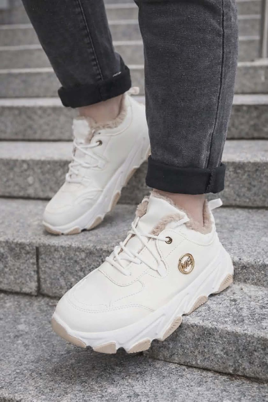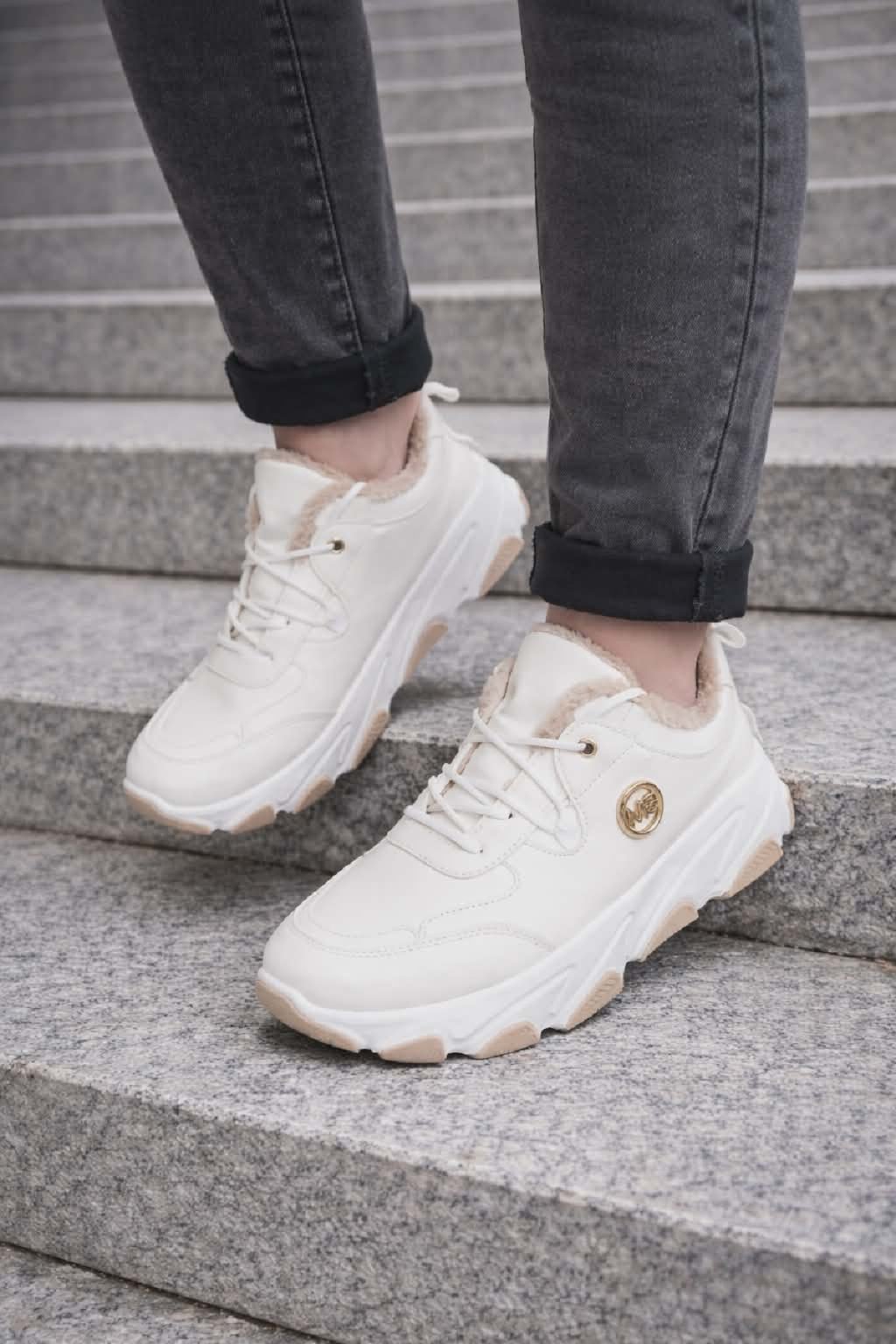Módní tenisky s kožíškem uvnitř. Na šněrování. Protiskluzová podrážka. Nádherná bílobéžová barevná kombinace. Jsou širší, velmi pohodlné. Velikosti odpovídají a to i přesto, že je v celé botě kožíšek.