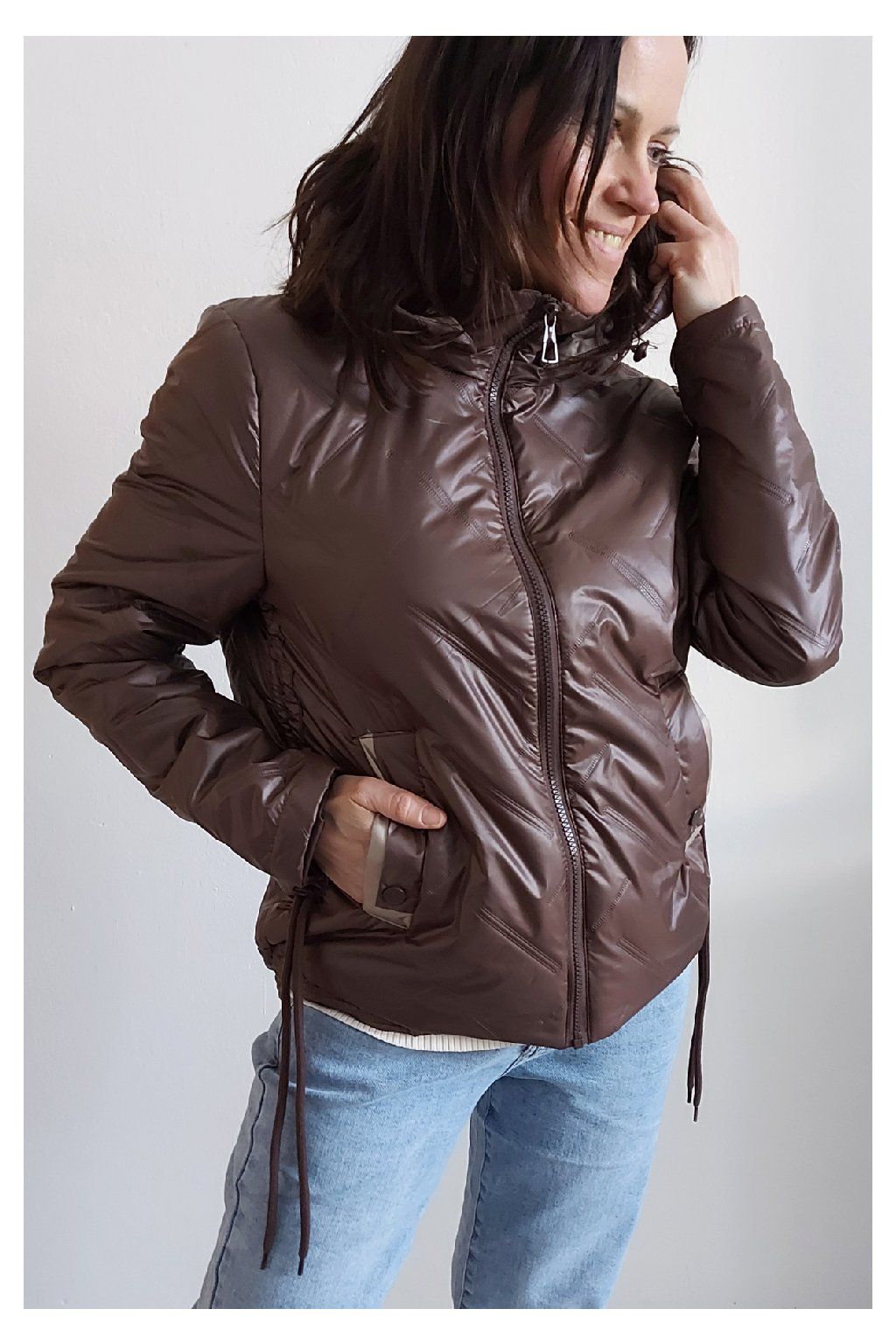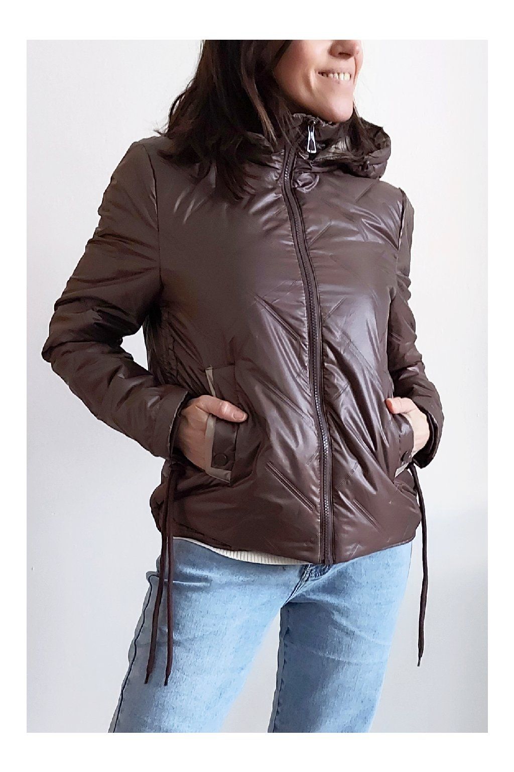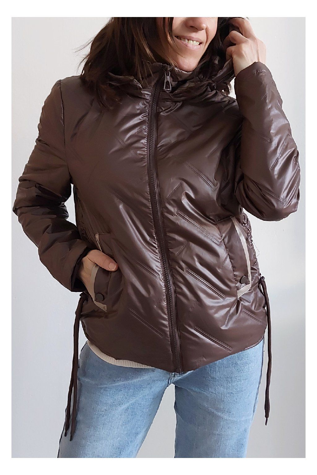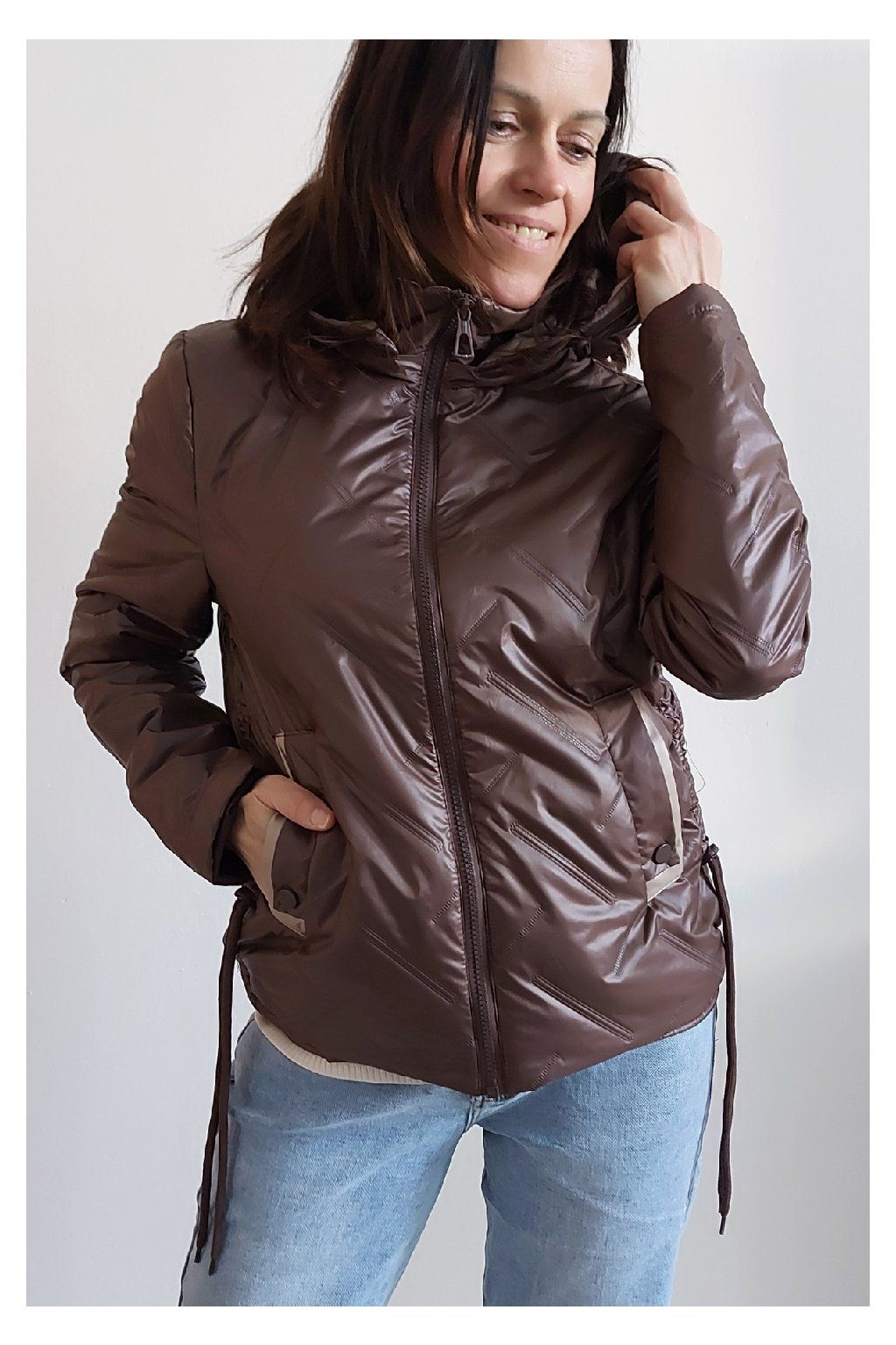Nádherná přechodová bunda s kapucí. Ta je na zip a lze ji odepnout. Rukávy jsou dlouhé. Zapínání na zip. Přední kapsy jsou módně řešené kombinací dvou barev čokoládové a béžové a mají i ozdobný cvok. Po bocích je možné bundu stáhnout. Zadní strana je maličko delší, bunda je rovného střihu. Lehoučký, vysoce kvalitní materiál. Má podšívku. Doporučujeme brát o velikost větší než běžně nosíte. Vel.. S focena na vel. XS, výška 156cm.