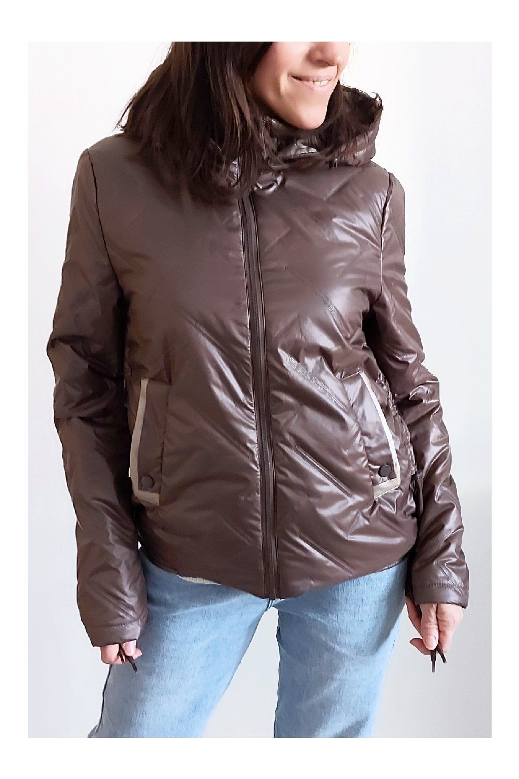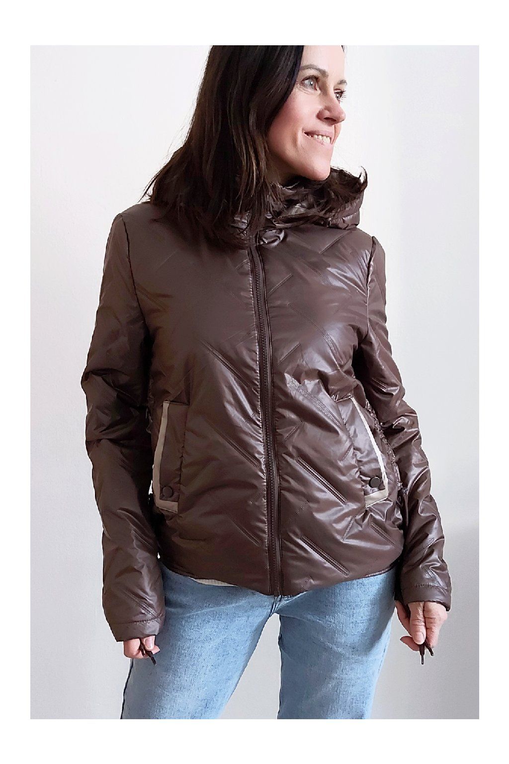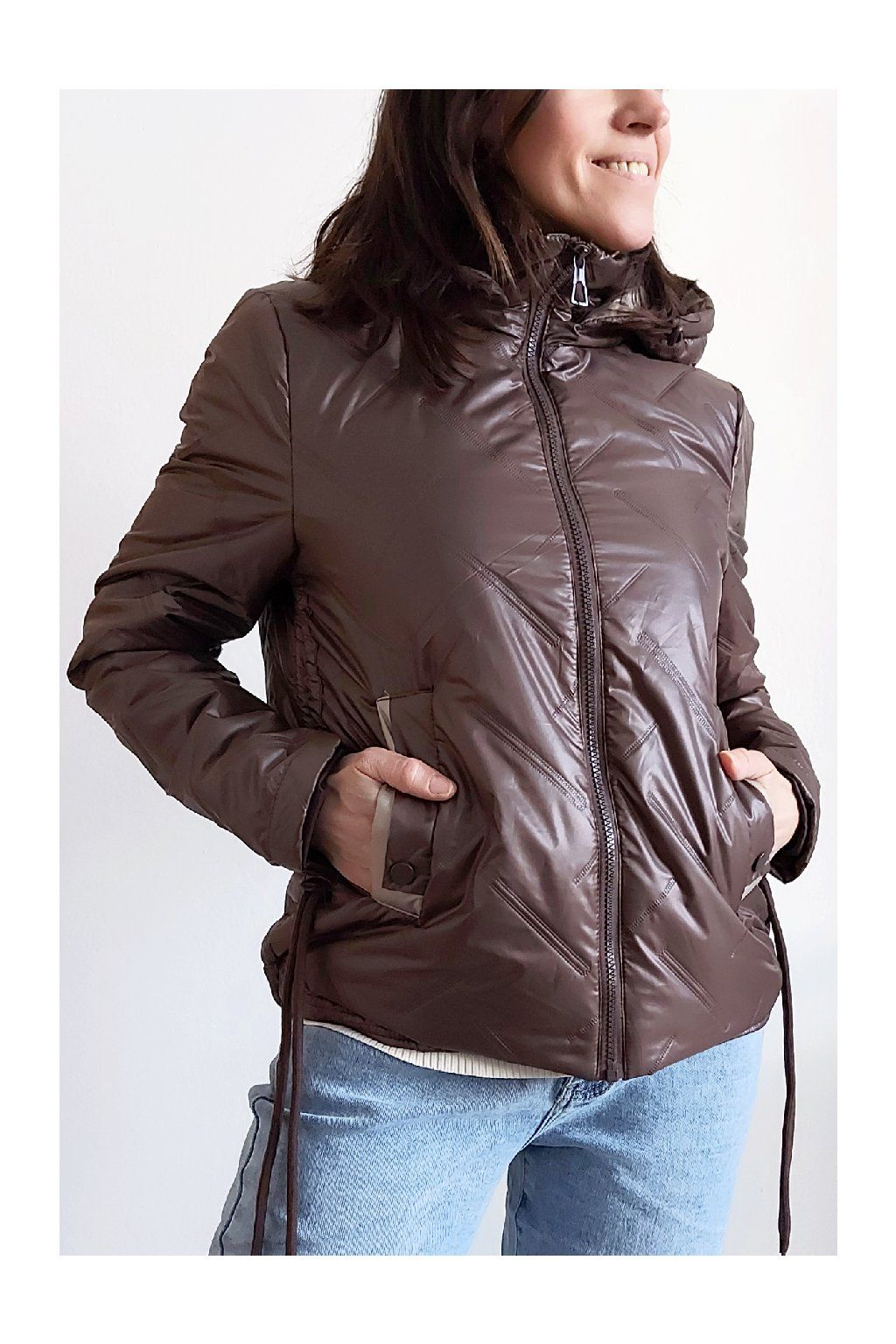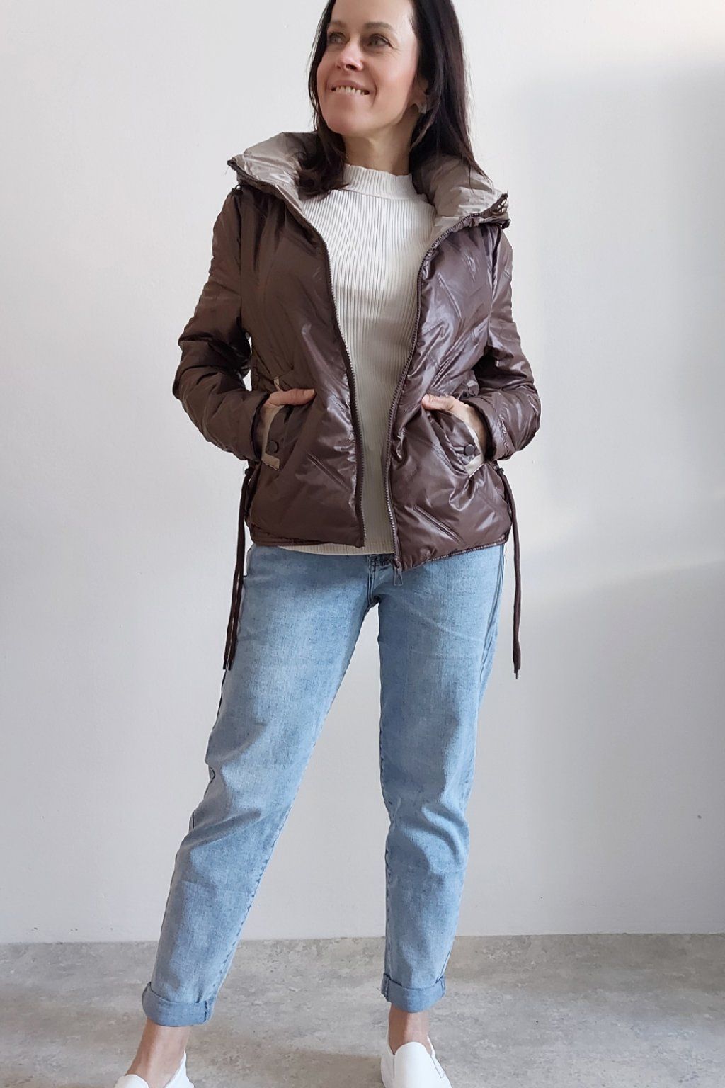 Nádherná přechodová bunda s kapucí. Ta je na zip a lze ji odepnout. Rukávy jsou dlouhé. Zapínání na zip. Přední kapsy jsou módně řešené kombinací dvou barev čokoládové a béžové a mají i ozdobný cvok. Po bocích je možné bundu stáhnout. Zadní strana je maličko delší, bunda je rovného střihu. Lehoučký, vysoce kvalitní materiál. Má podšívku. Doporučujeme brát o velikost větší než běžně nosíte. Vel.. S focena na vel. XS, výška 156cm.