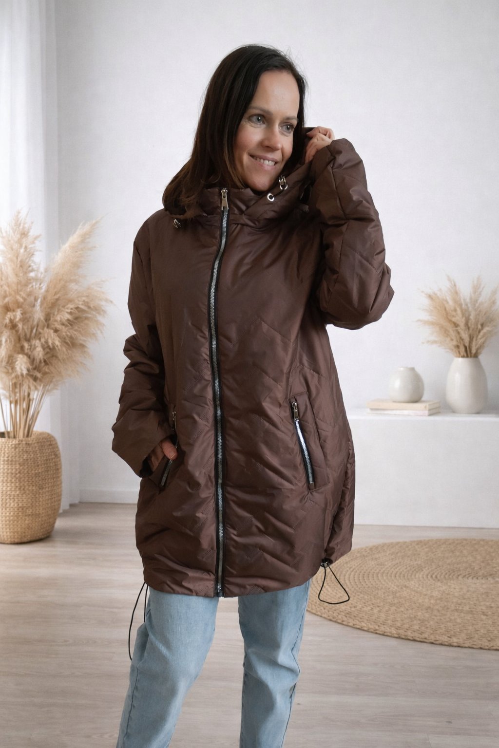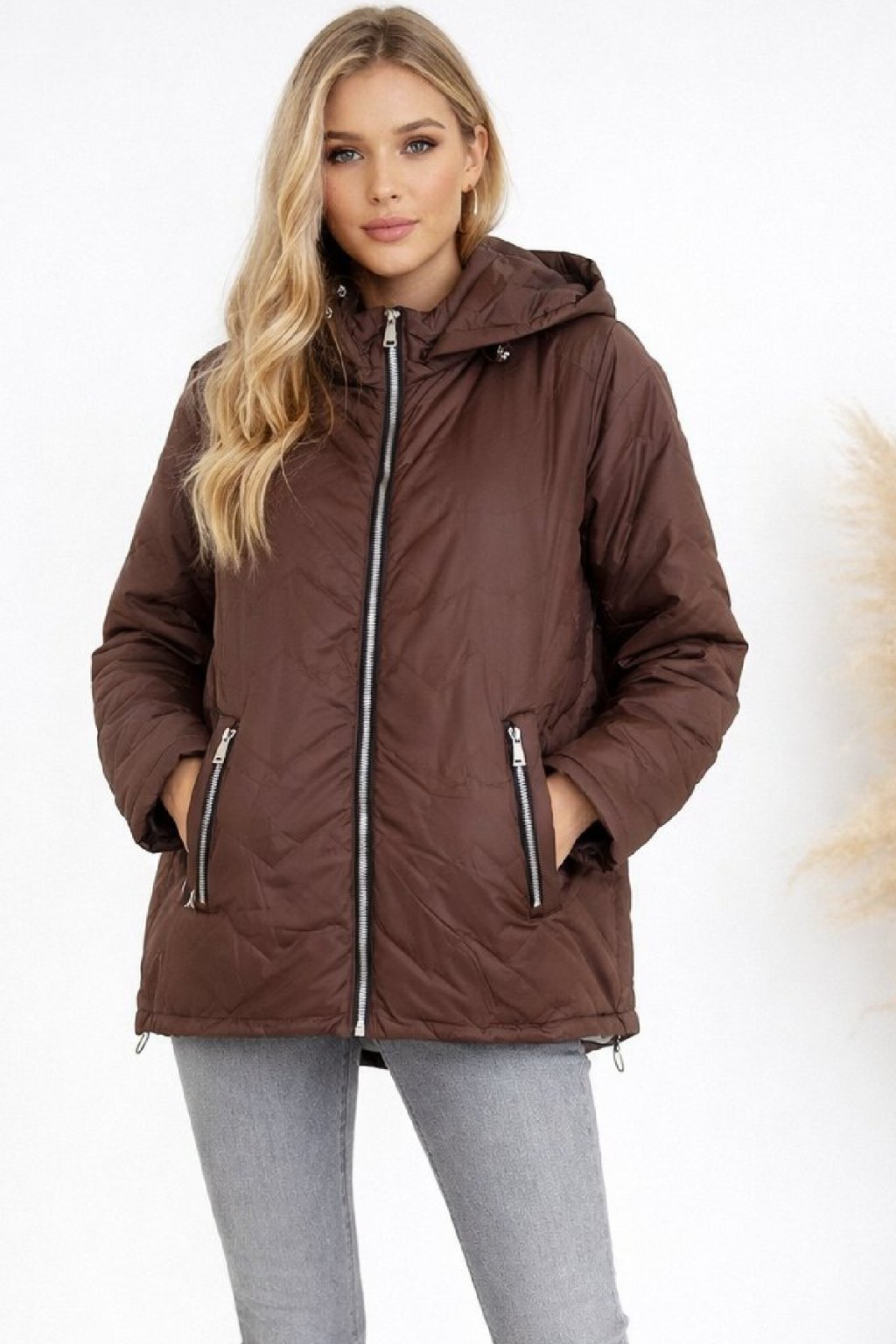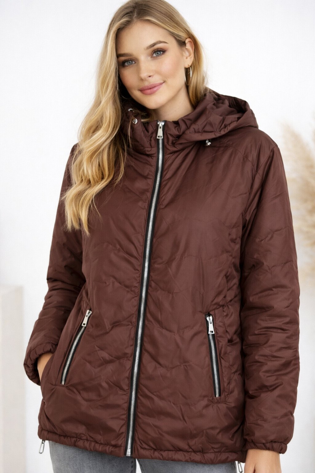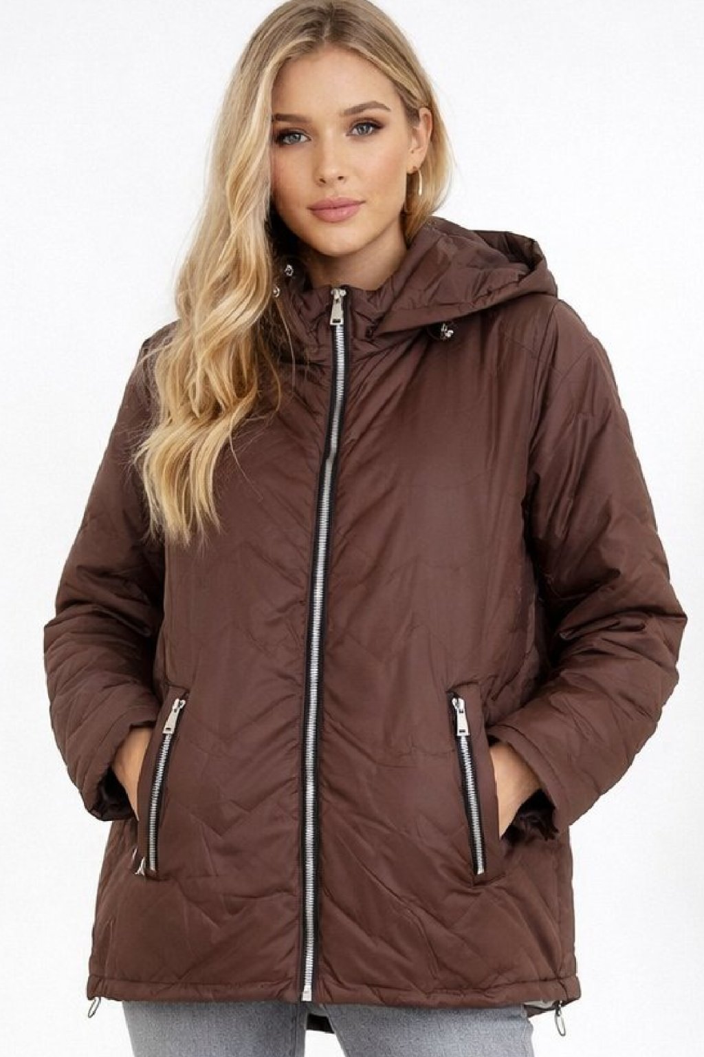 Dámská přechodová bunda pro větší velikosti.  Má odepínací kapuci. Přední kapsy, které jsou zdobené zipem. Po stranách lze obvod stáhnout. Zadní strana maličko delší. Prošívaná, má podšívku. Prémiová kvalita. Bundy jsou  o číslo až dvě menší, je tedy třeba brát větší velikost než běžně nosíte. Na vel. 2XL (prsa 116cm, boky 120cm), výška 165cm focena vel. 4XL. Vel. 3XL focena na vel. XS, výška 156cm.