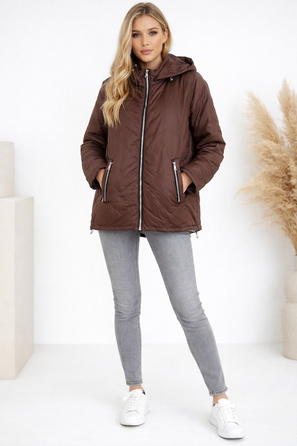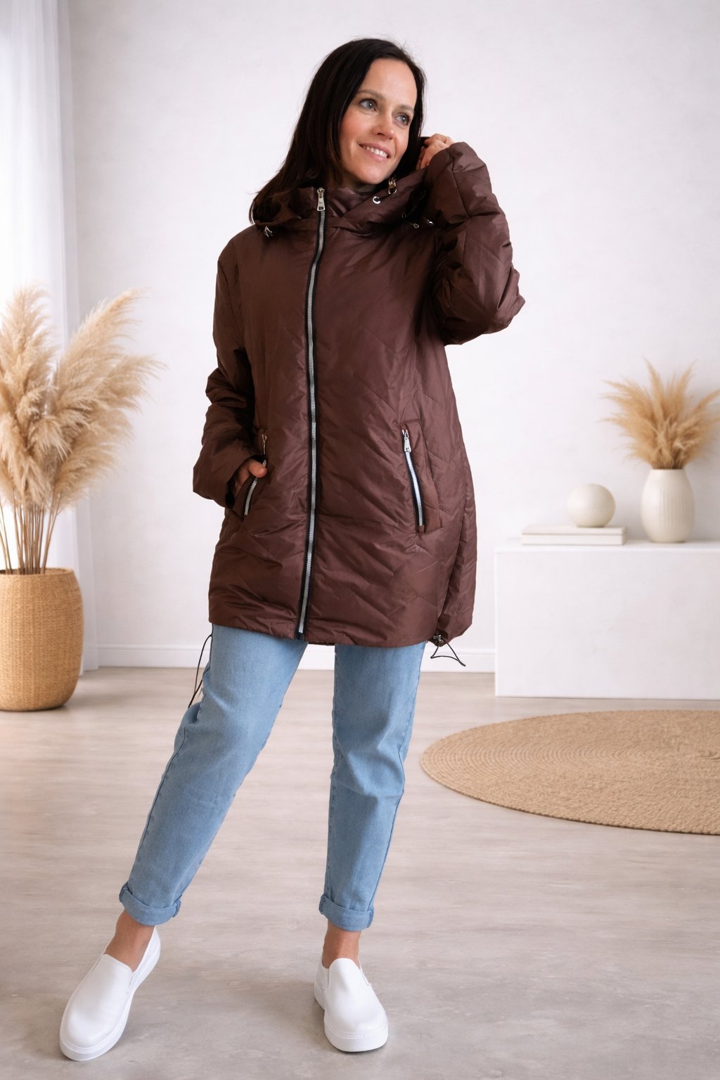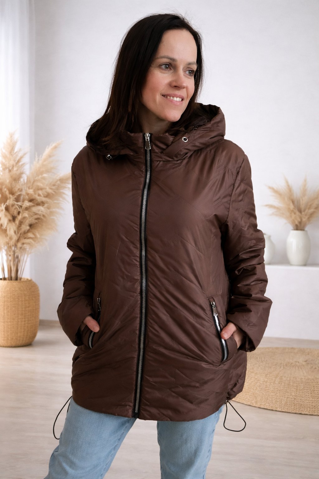 Dámská přechodová bunda pro větší velikosti.  Má odepínací kapuci. Přední kapsy, které jsou zdobené zipem. Po stranách lze obvod stáhnout. Zadní strana maličko delší. Prošívaná, má podšívku. Prémiová kvalita. Bundy jsou  o číslo až dvě menší, je tedy třeba brát větší velikost než běžně nosíte. Na vel. 2XL (prsa 116cm, boky 120cm), výška 165cm focena vel. 4XL. Vel. 3XL focena na vel. XS, výška 156cm.