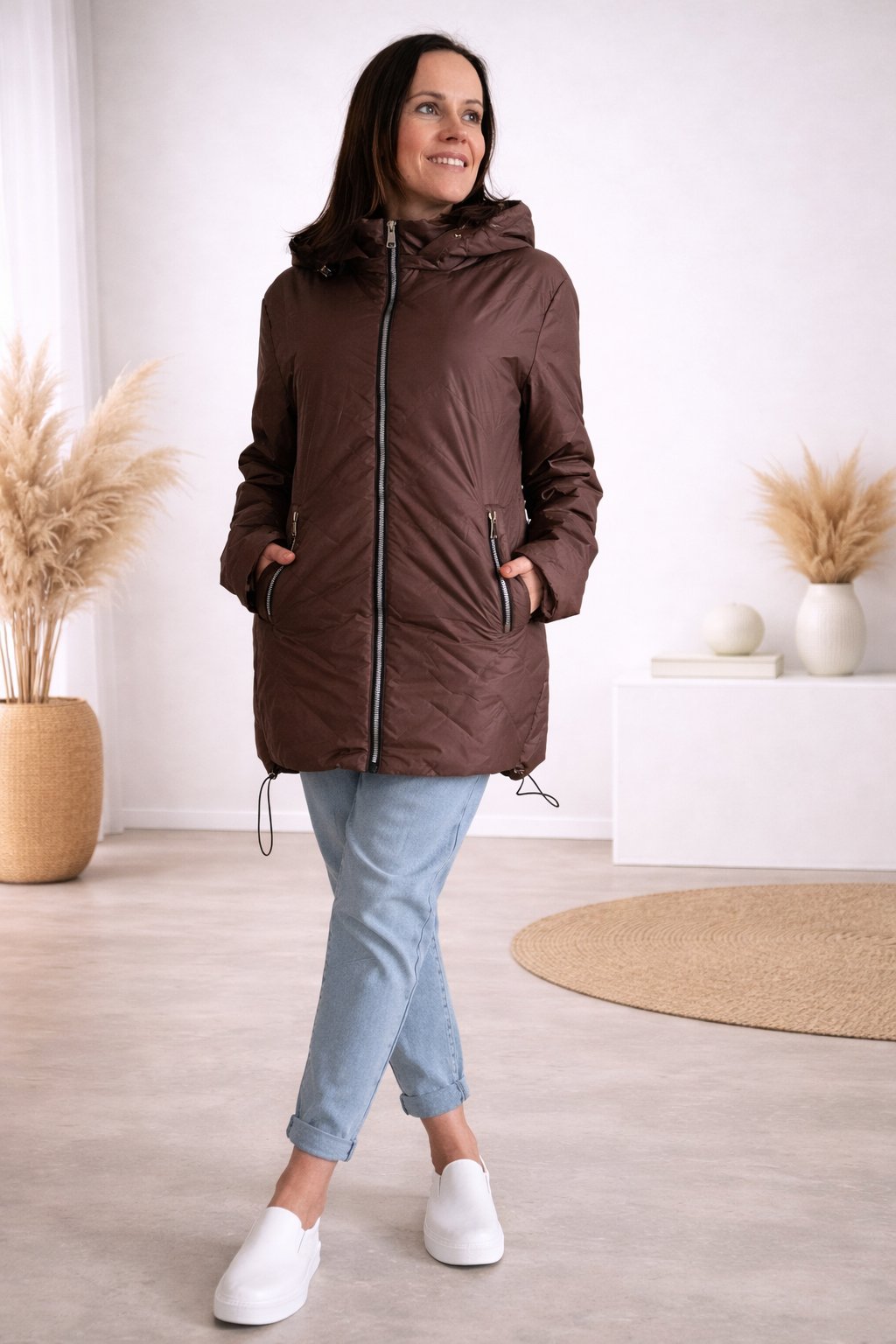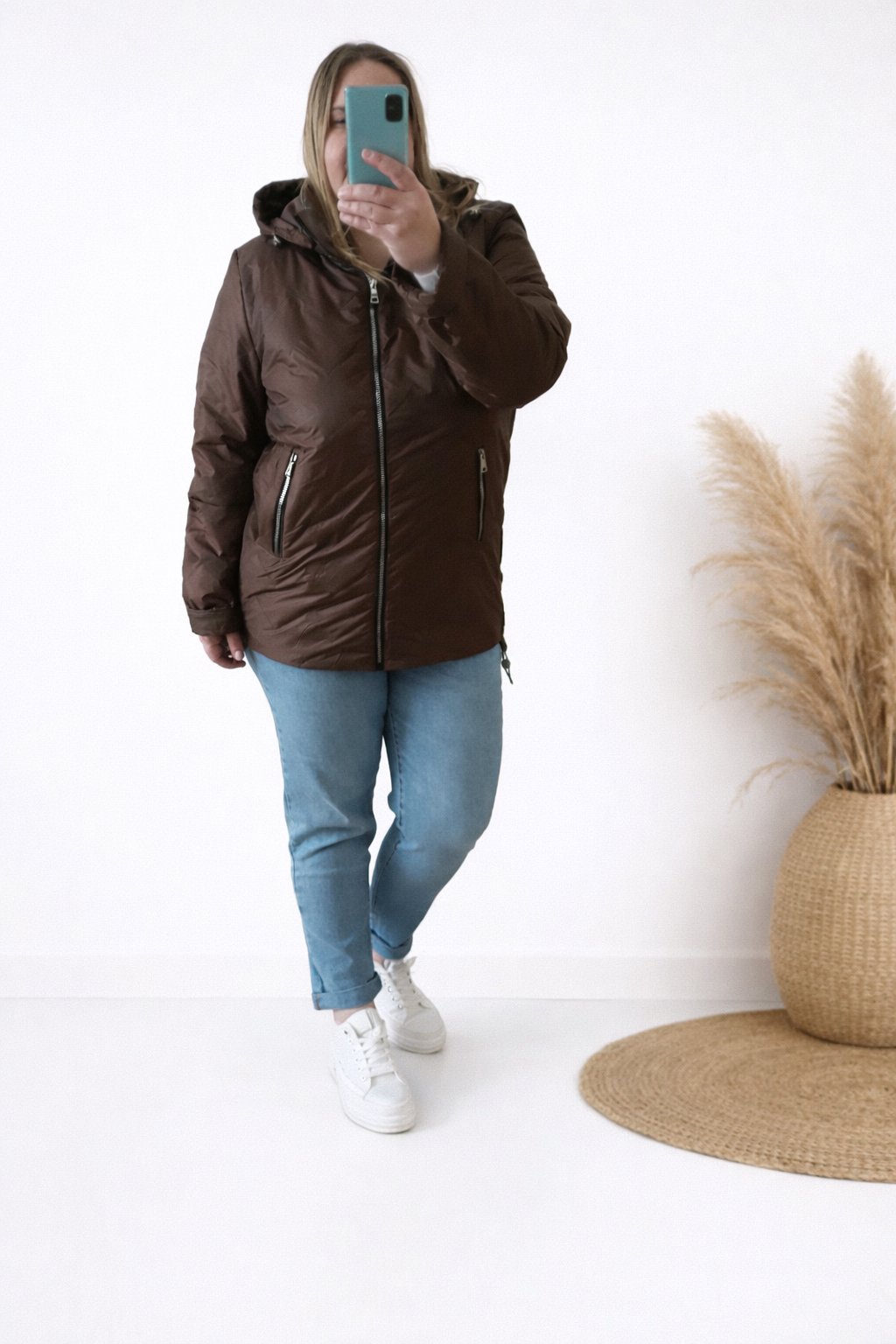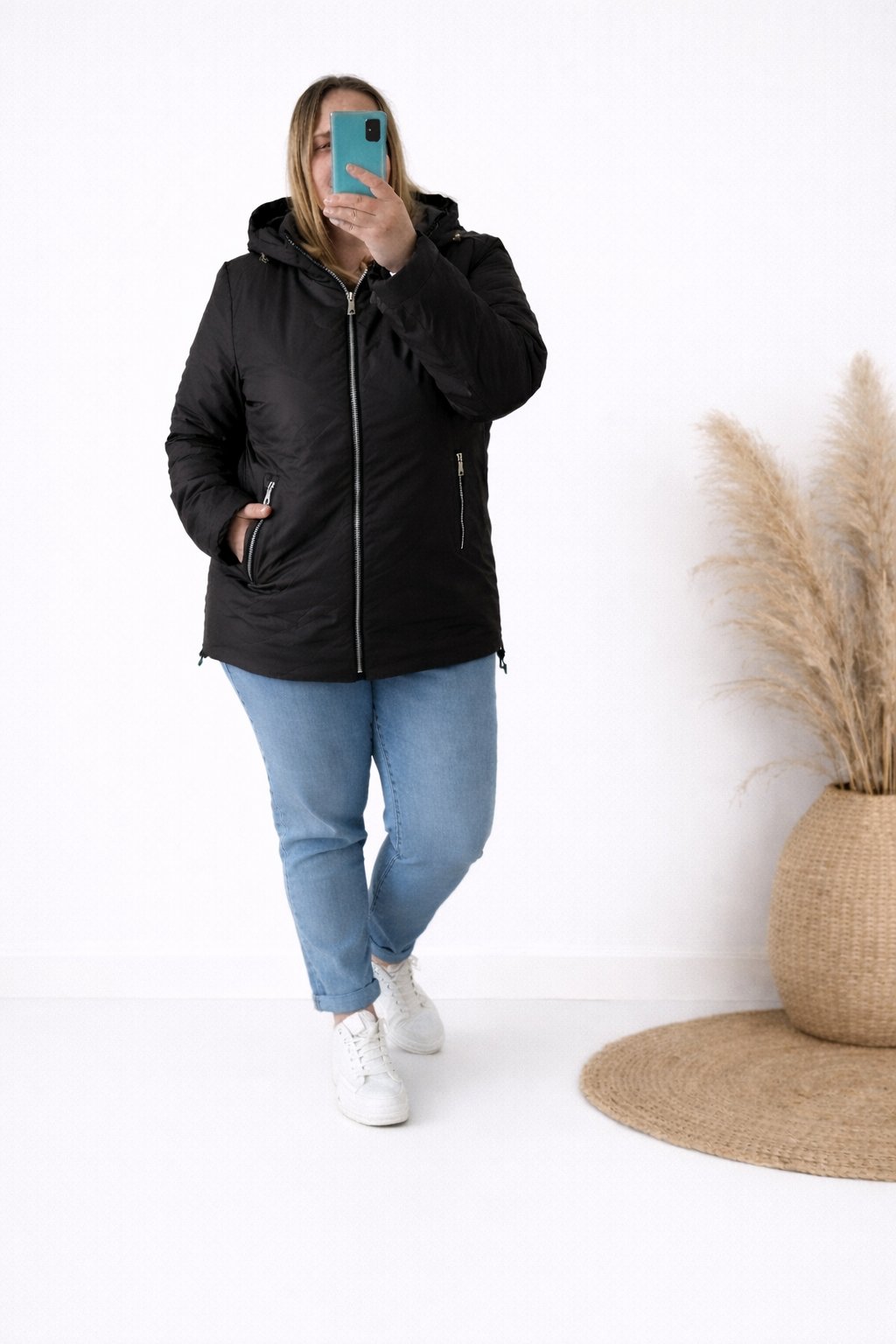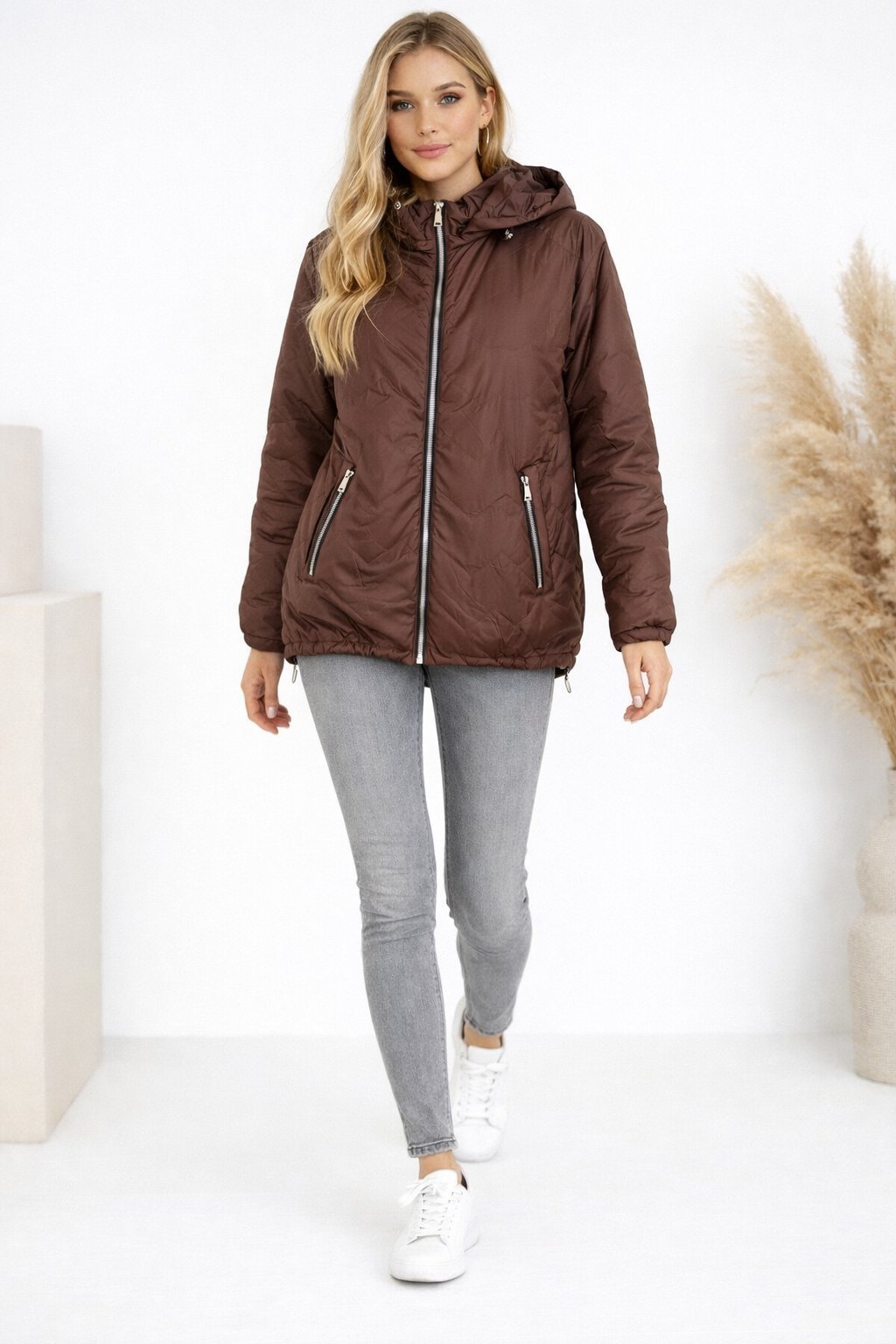 Dámská přechodová bunda pro větší velikosti.  Má odepínací kapuci. Přední kapsy, které jsou zdobené zipem. Po stranách lze obvod stáhnout. Zadní strana maličko delší. Prošívaná, má podšívku. Prémiová kvalita. Bundy jsou  o číslo až dvě menší, je tedy třeba brát větší velikost než běžně nosíte. Na vel. 2XL (prsa 116cm, boky 120cm), výška 165cm focena vel. 4XL. Vel. 3XL focena na vel. XS, výška 156cm.