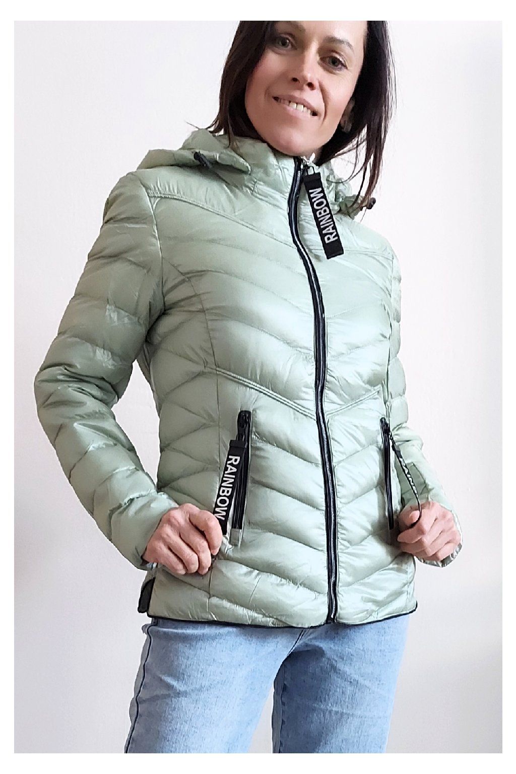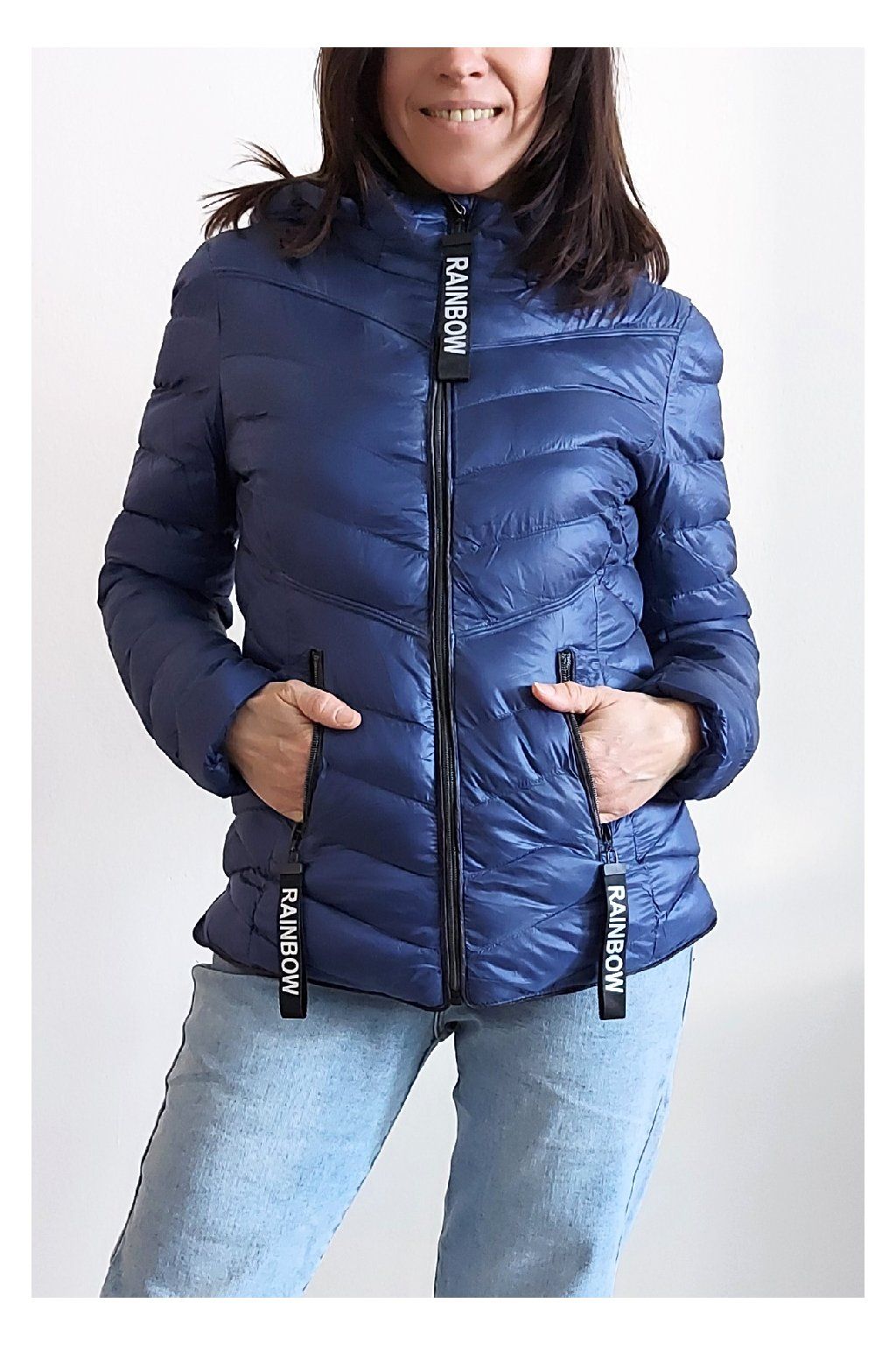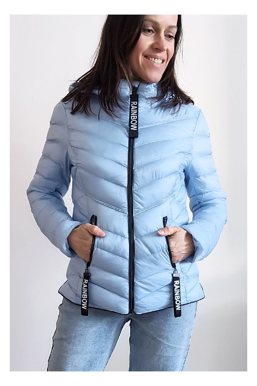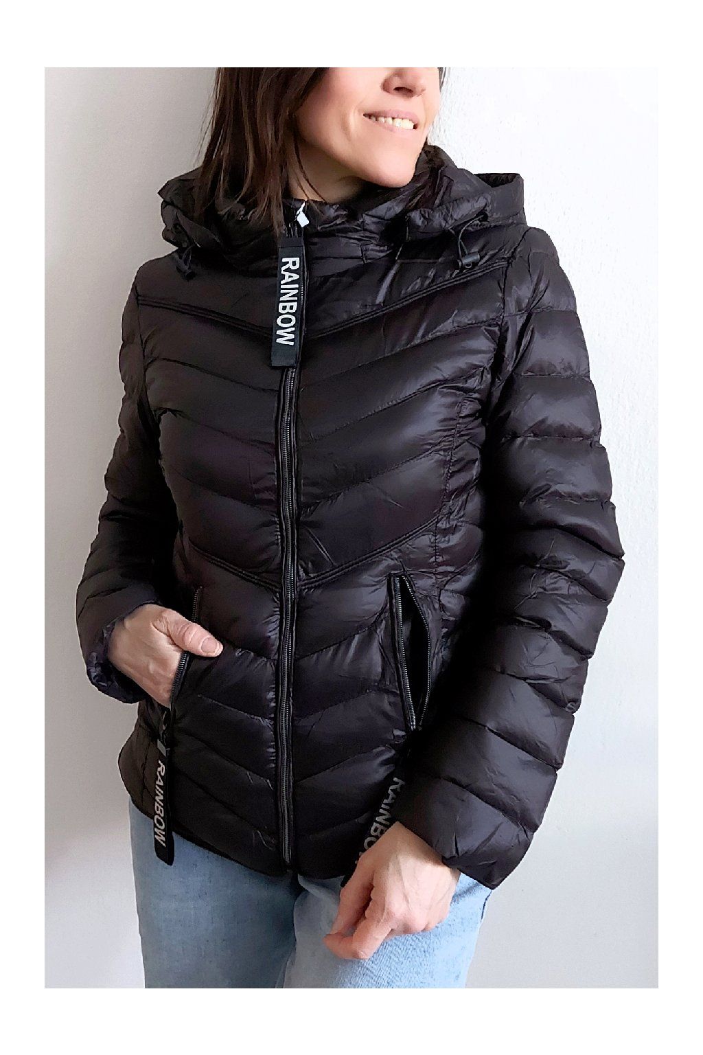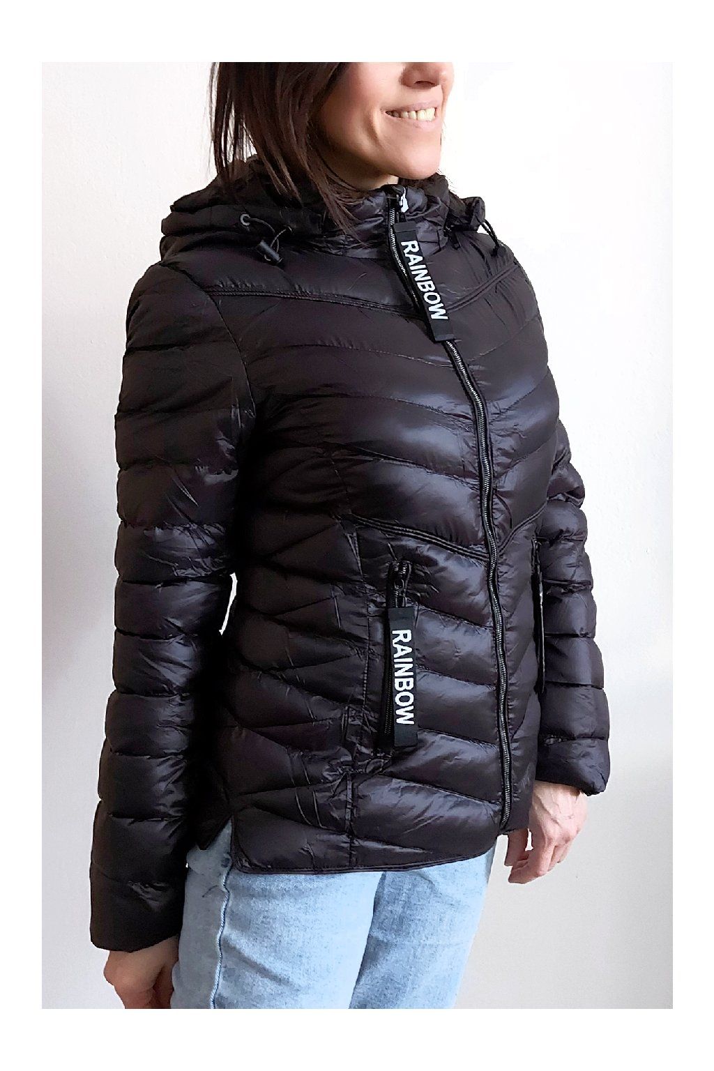 Přechodová prošívaná bunda s kapucí. Tu lze odepnout zipem a taky lze její obvod stáhnout, což oceníme při větším větru. Rukávy jsou dlouhé. Vpředu kapsy, které jsou na zip. Na jezdcích zipů jsou ozdobné řemínky s nápisem Rainbow. Po stranách jsou malinké rozparky. Bunda má podšívku. Materiál je tenčí, vhodný pro jaro a podzim. Vel. S focena na vel. XS, výška 156cm. Doporučujeme brát o vel. větší než běžně nosíte.