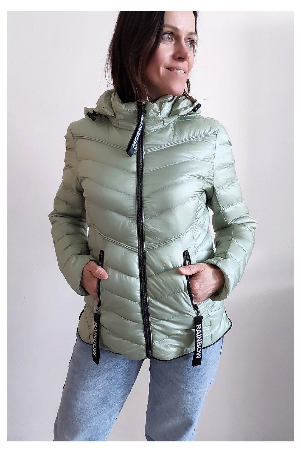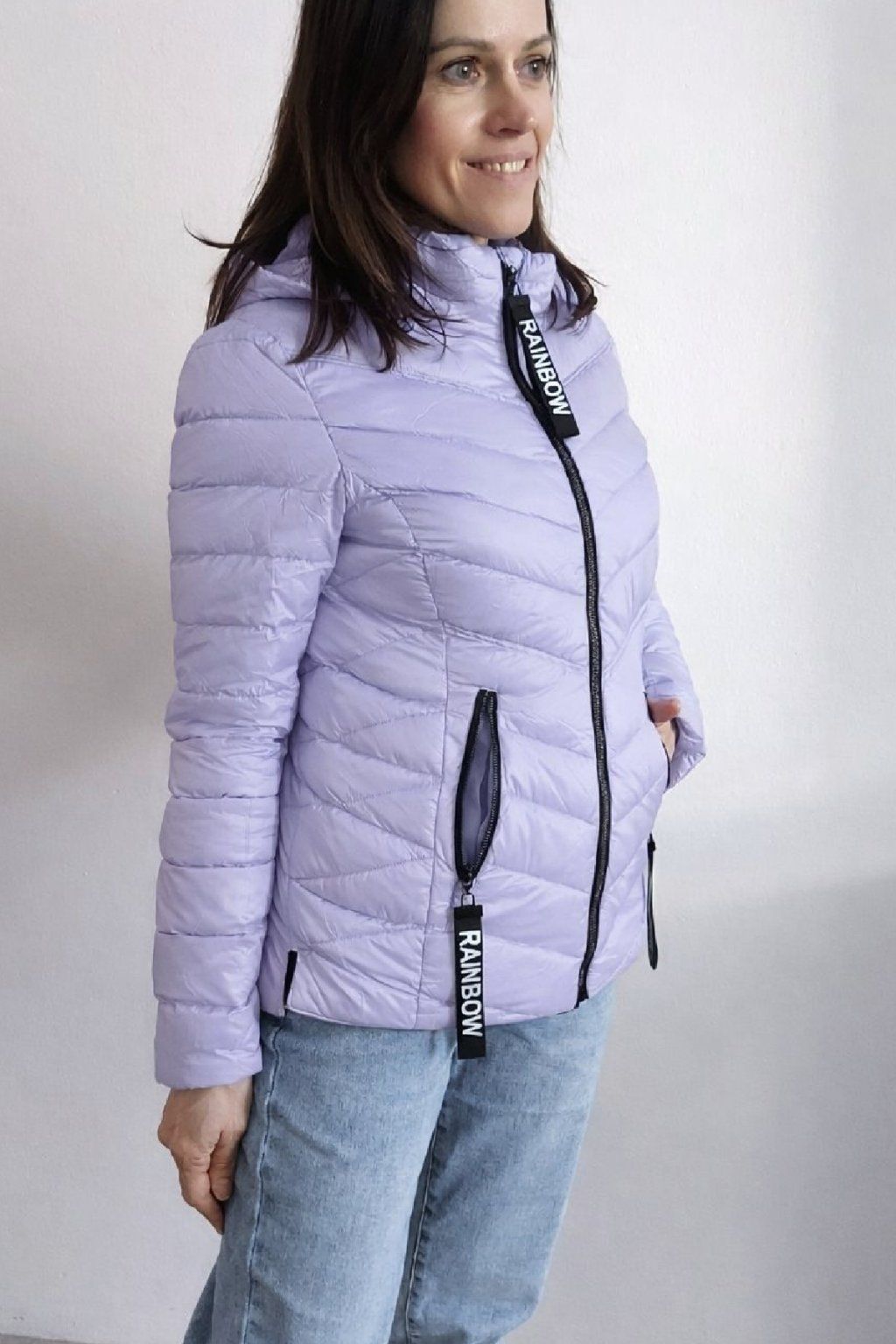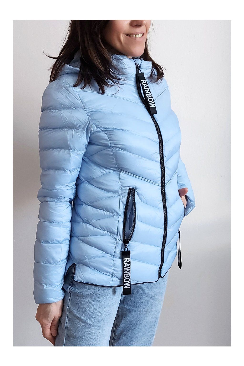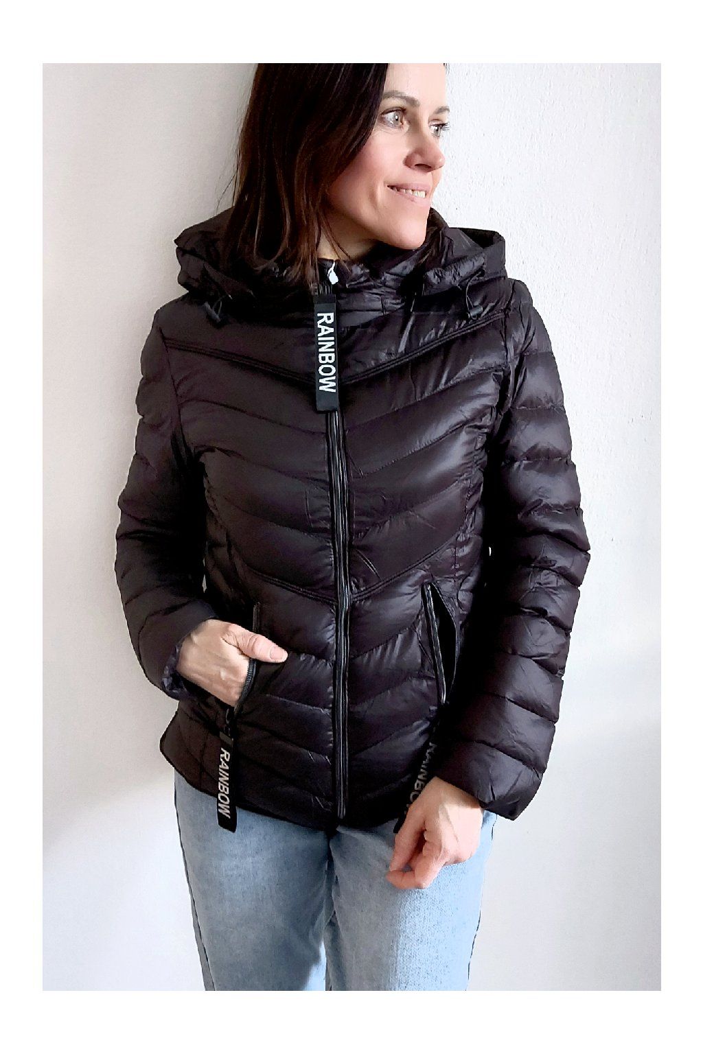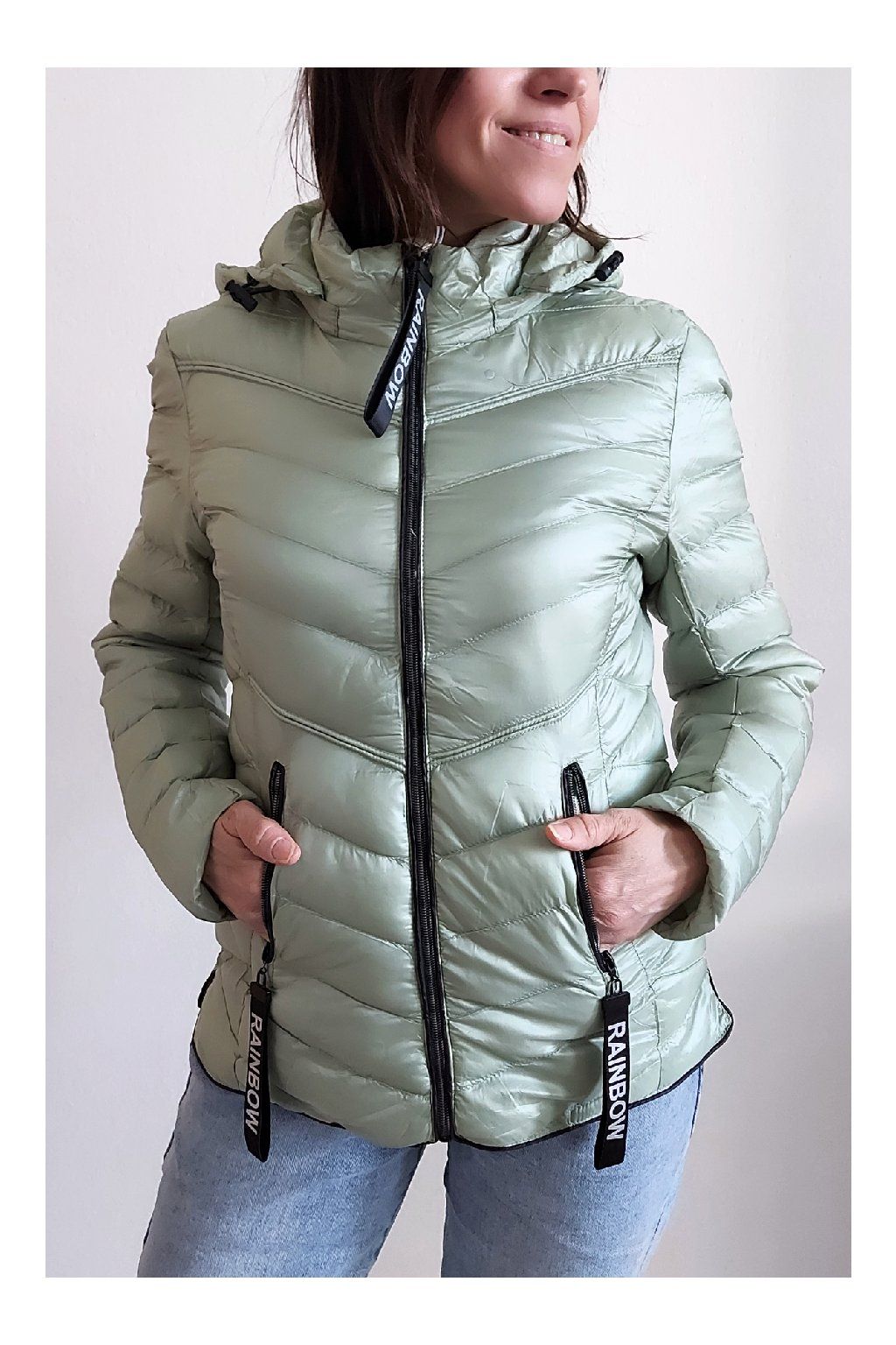 Přechodová prošívaná bunda s kapucí. Tu lze odepnout zipem a taky lze její obvod stáhnout, což oceníme při větším větru. Rukávy jsou dlouhé. Vpředu kapsy, které jsou na zip. Na jezdcích zipů jsou ozdobné řemínky s nápisem Rainbow. Po stranách jsou malinké rozparky. Bunda má podšívku. Materiál je tenčí, vhodný pro jaro a podzim. Vel. S focena na vel. XS, výška 156cm. Doporučujeme brát o vel. větší než běžně nosíte.
