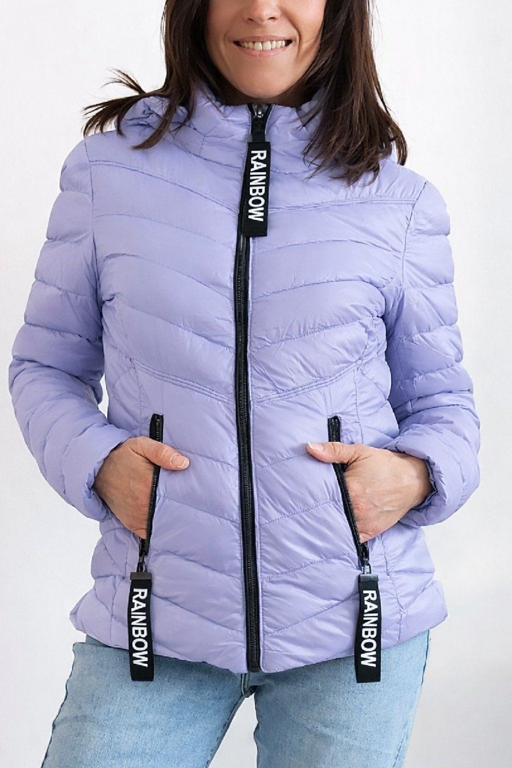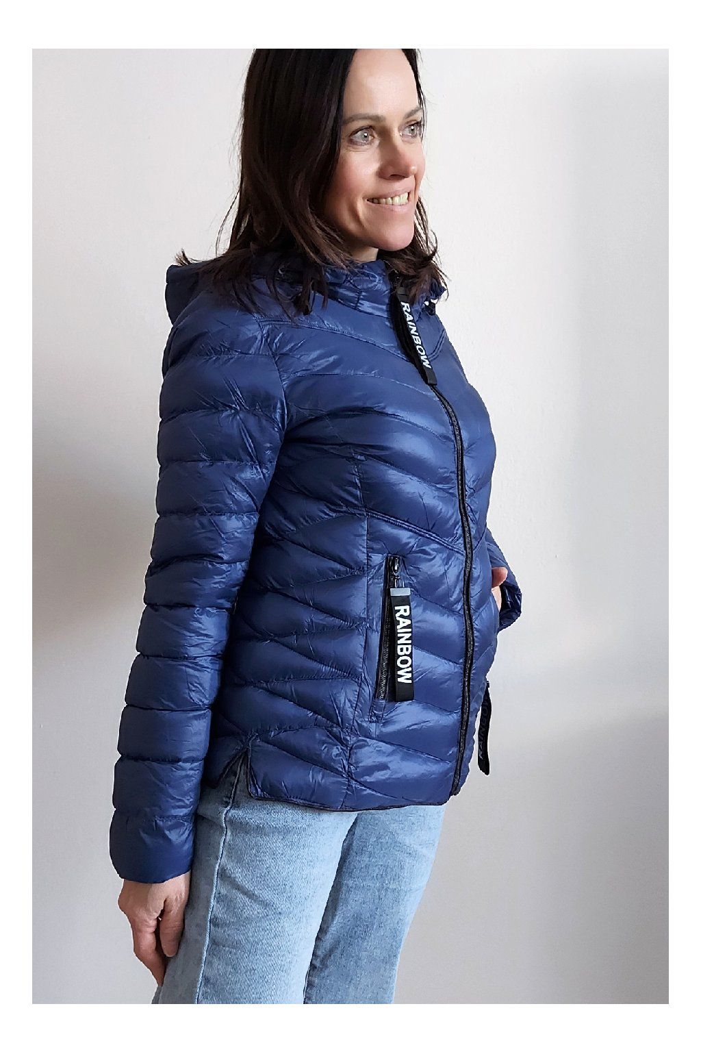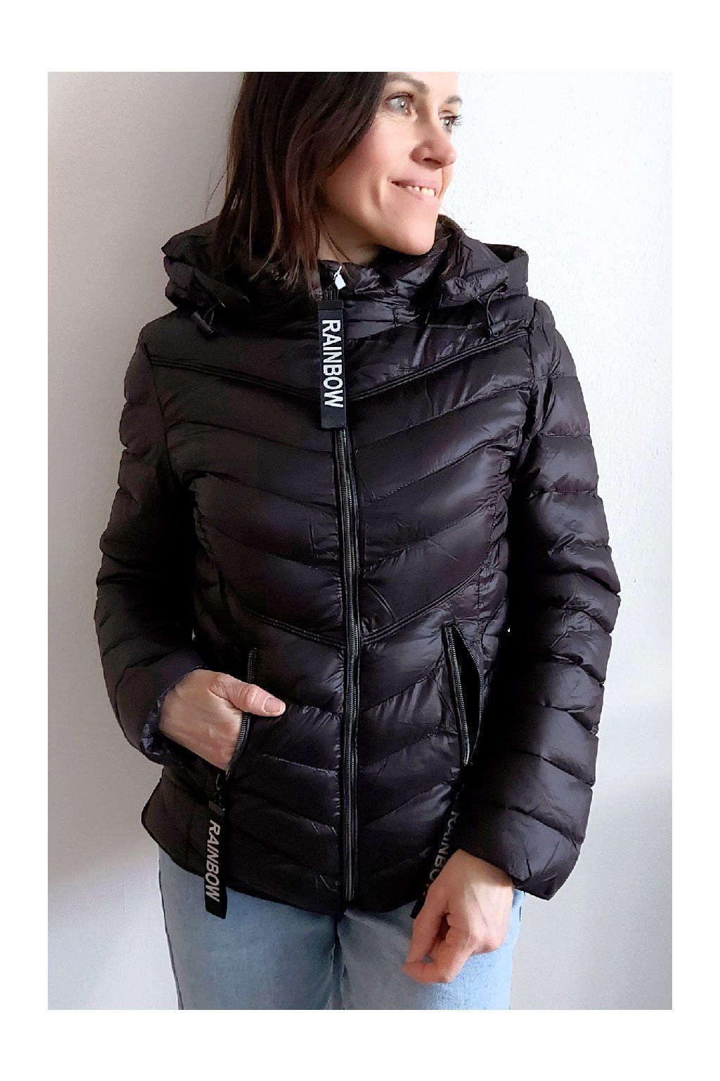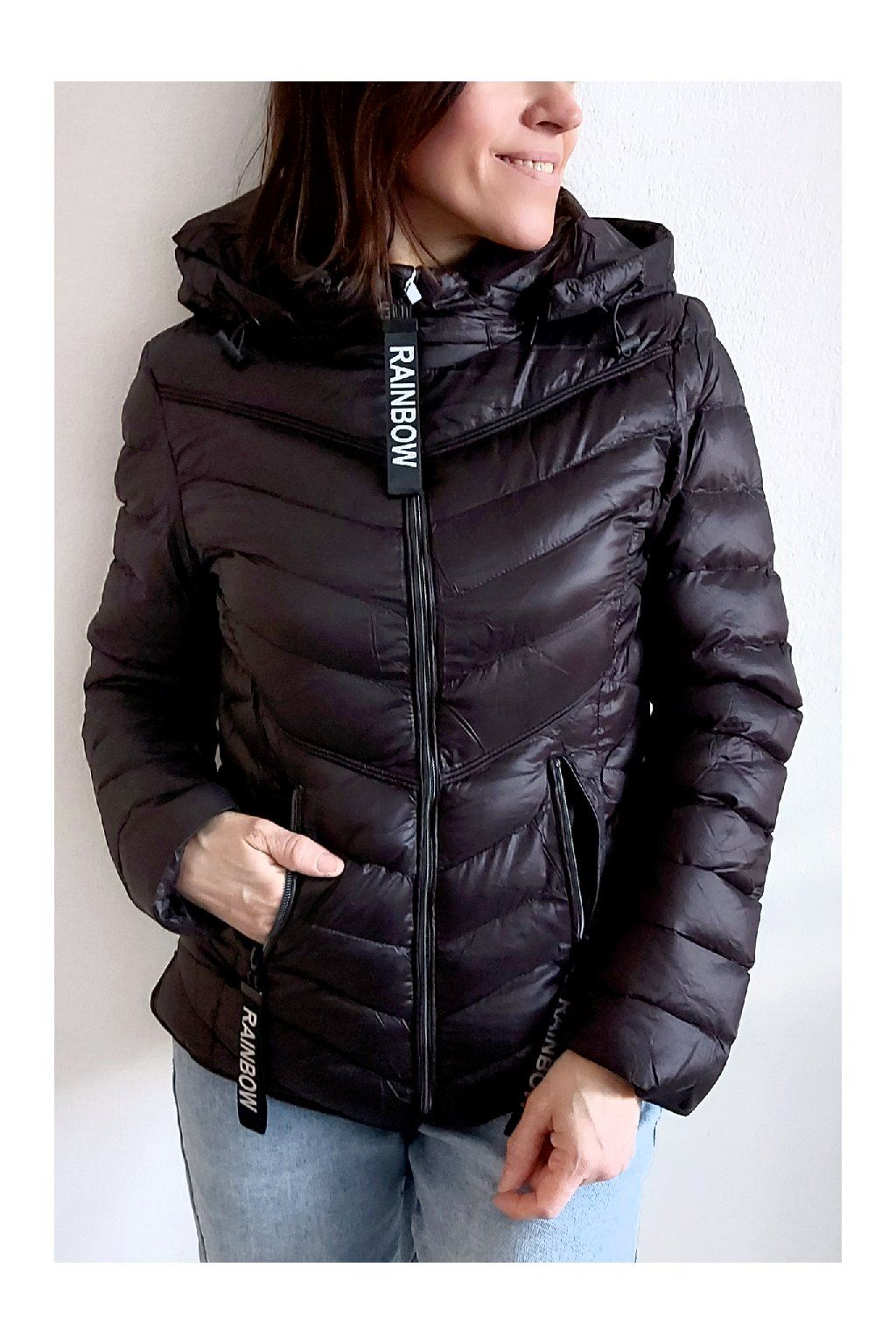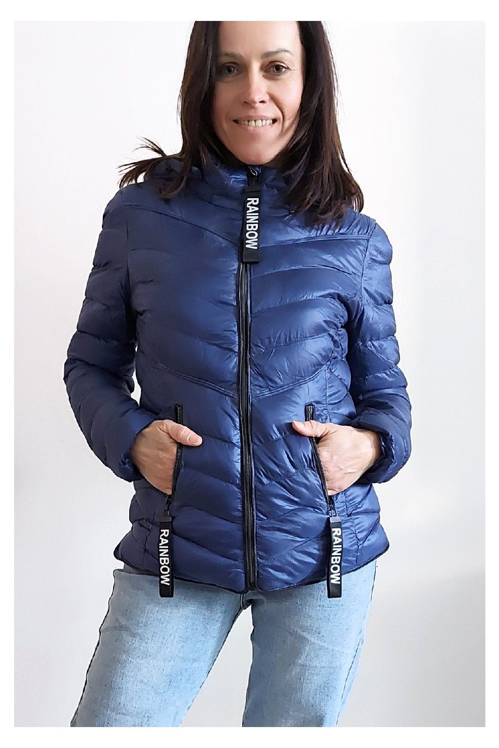 Přechodová prošívaná bunda s kapucí. Tu lze odepnout zipem a taky lze její obvod stáhnout, což oceníme při větším větru. Rukávy jsou dlouhé. Vpředu kapsy, které jsou na zip. Na jezdcích zipů jsou ozdobné řemínky s nápisem Rainbow. Po stranách jsou malinké rozparky. Bunda má podšívku. Materiál je tenčí, vhodný pro jaro a podzim. Vel. S focena na vel. XS, výška 156cm. Doporučujeme brát o vel. větší než běžně nosíte.