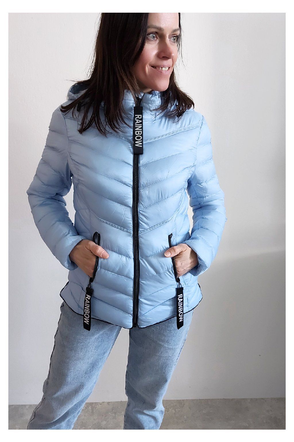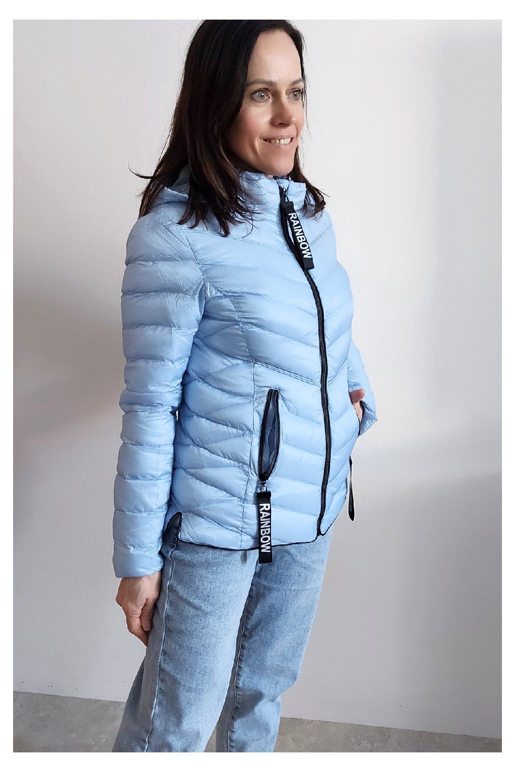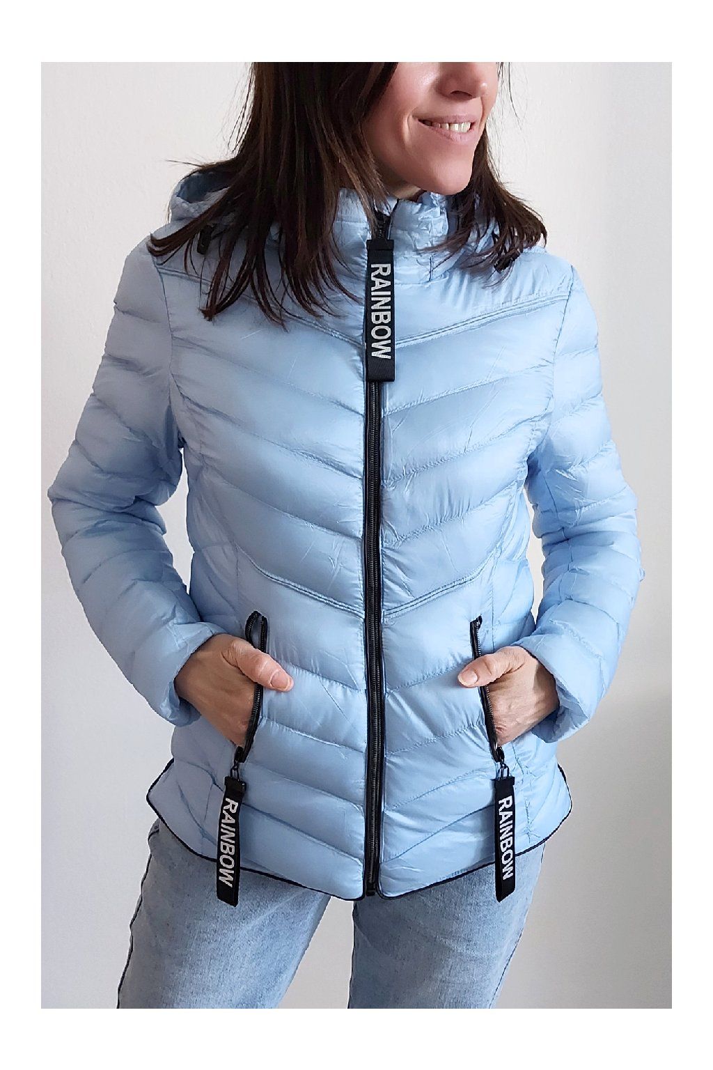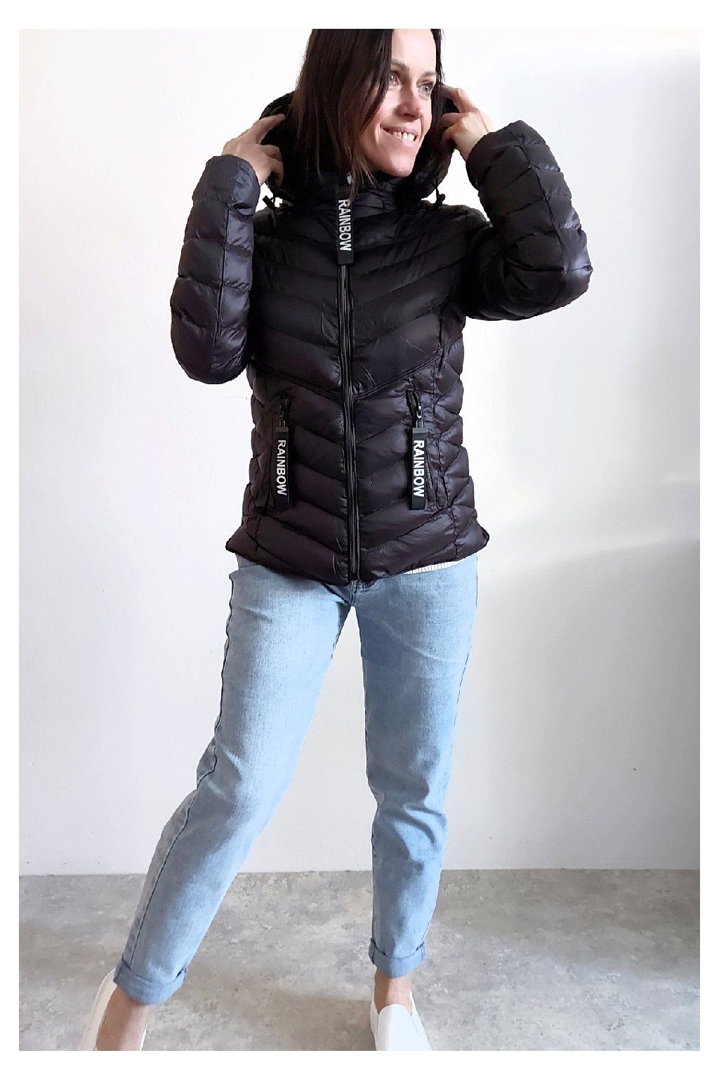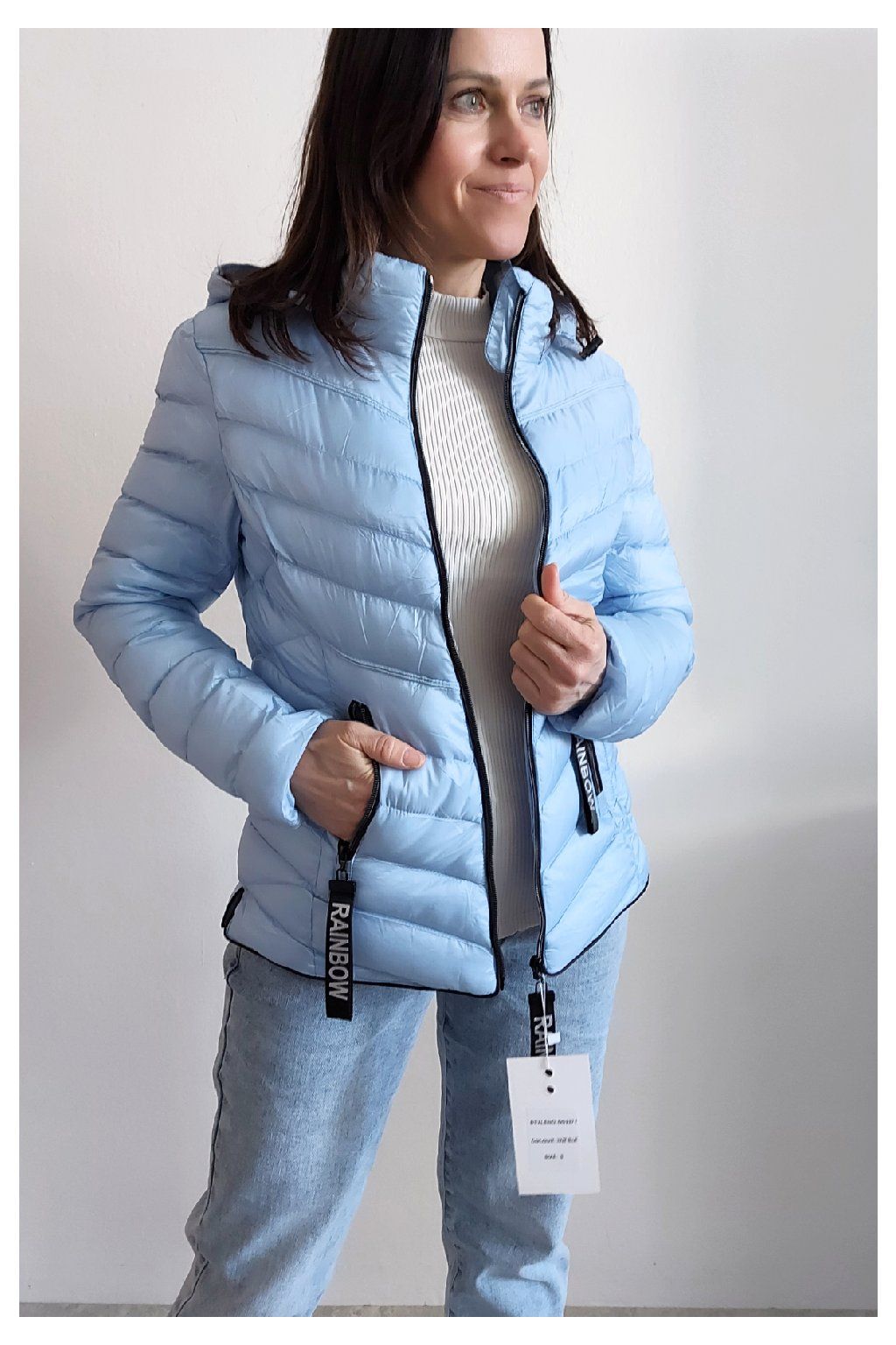 Přechodová prošívaná bunda s kapucí. Tu lze odepnout zipem a taky lze její obvod stáhnout, což oceníme při větším větru. Rukávy jsou dlouhé. Vpředu kapsy, které jsou na zip. Na jezdcích zipů jsou ozdobné řemínky s nápisem Rainbow. Po stranách jsou malinké rozparky. Bunda má podšívku. Materiál je tenčí, vhodný pro jaro a podzim. Vel. S focena na vel. XS, výška 156cm. Doporučujeme brát o vel. větší než běžně nosíte.