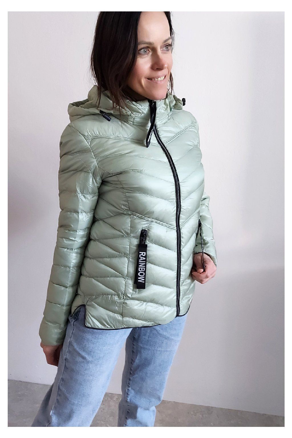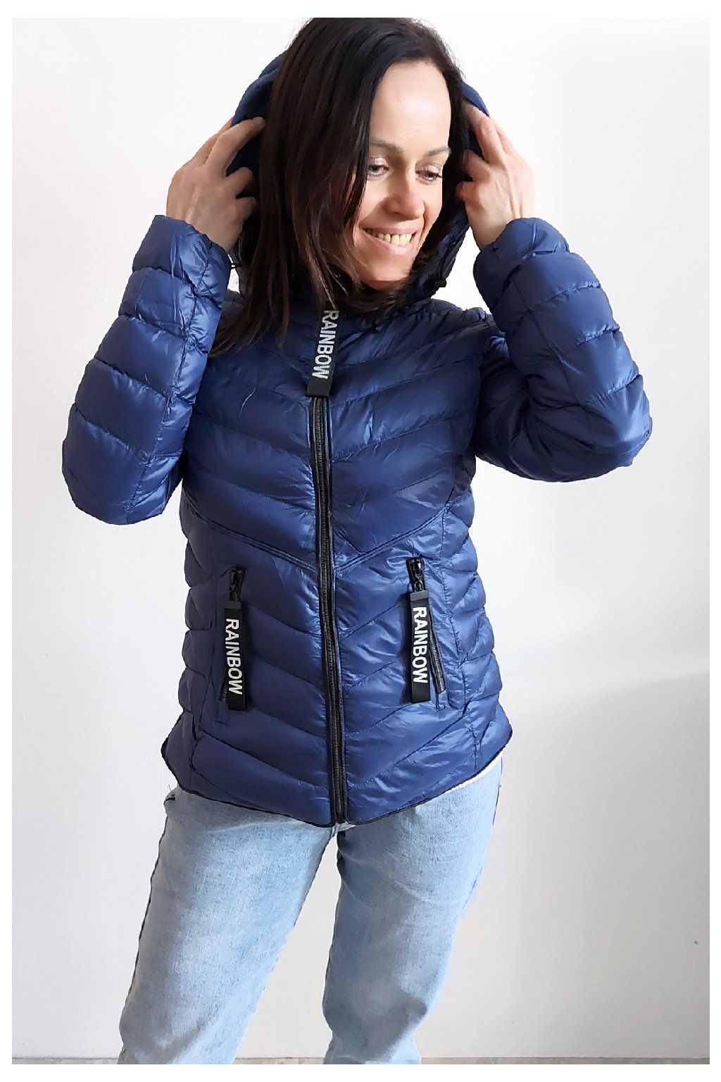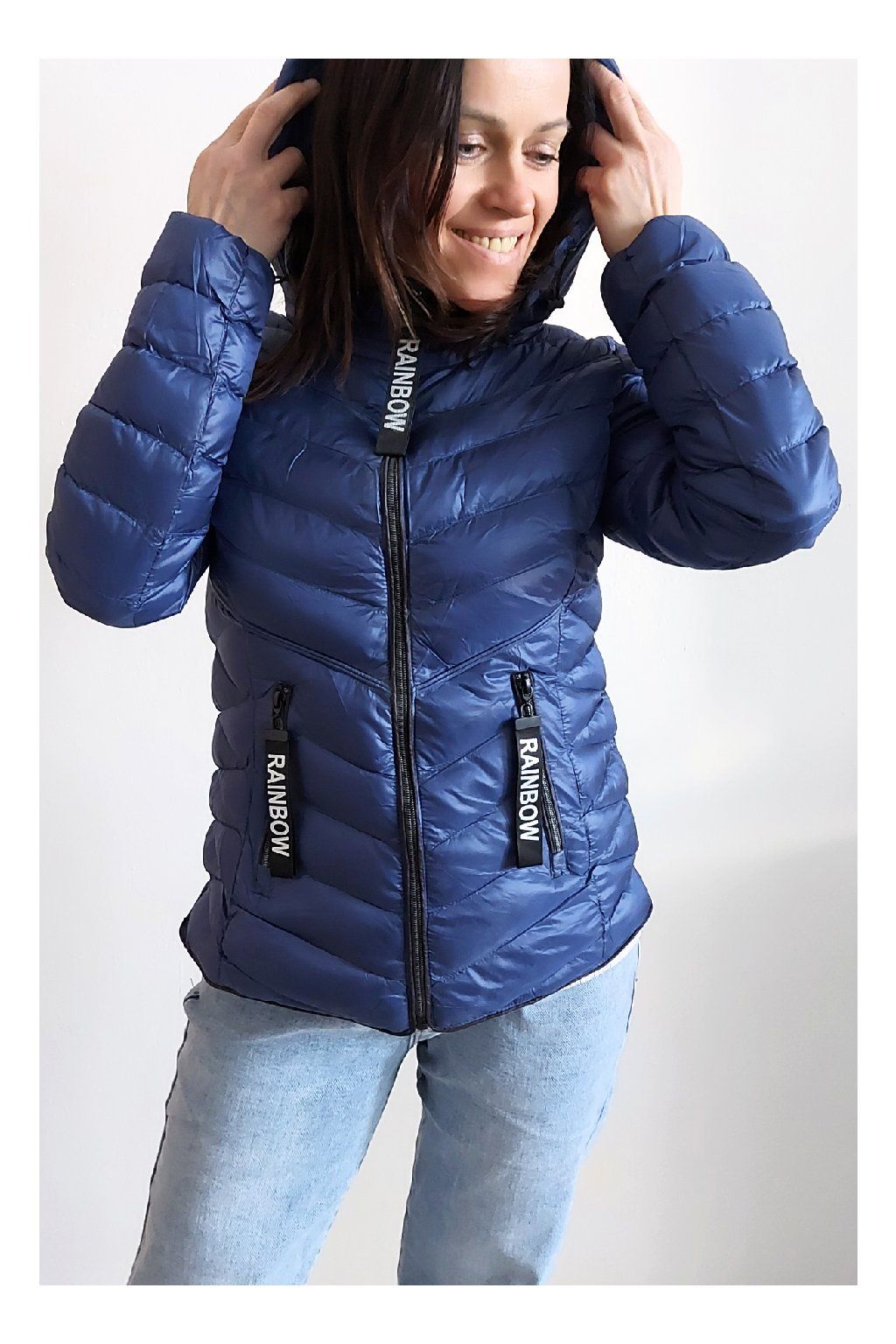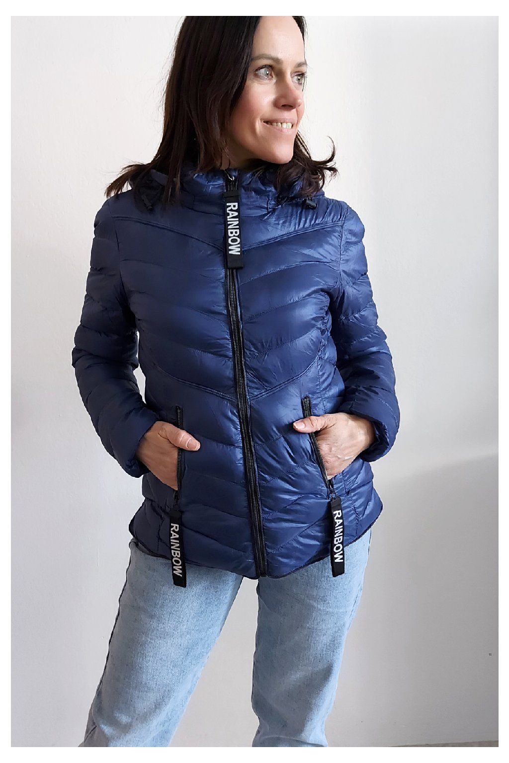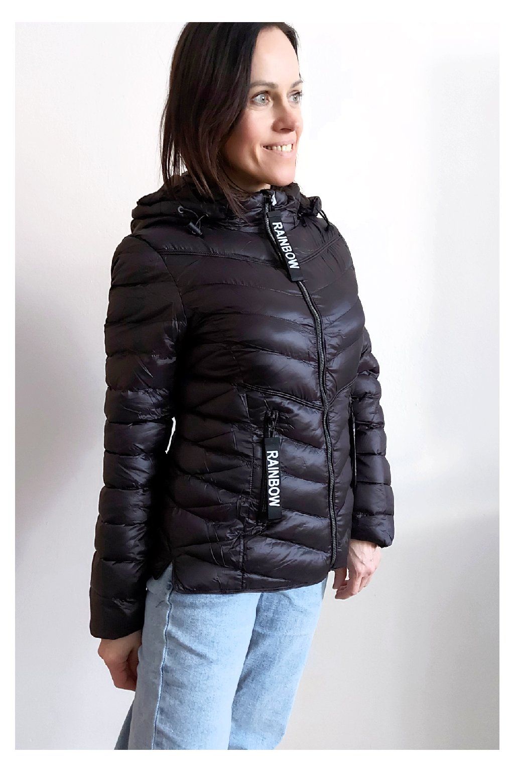 Přechodová prošívaná bunda s kapucí. Tu lze odepnout zipem a taky lze její obvod stáhnout, což oceníme při větším větru. Rukávy jsou dlouhé. Vpředu kapsy, které jsou na zip. Na jezdcích zipů jsou ozdobné řemínky s nápisem Rainbow. Po stranách jsou malinké rozparky. Bunda má podšívku. Materiál je tenčí, vhodný pro jaro a podzim. Vel. S focena na vel. XS, výška 156cm. Doporučujeme brát o vel. větší než běžně nosíte.