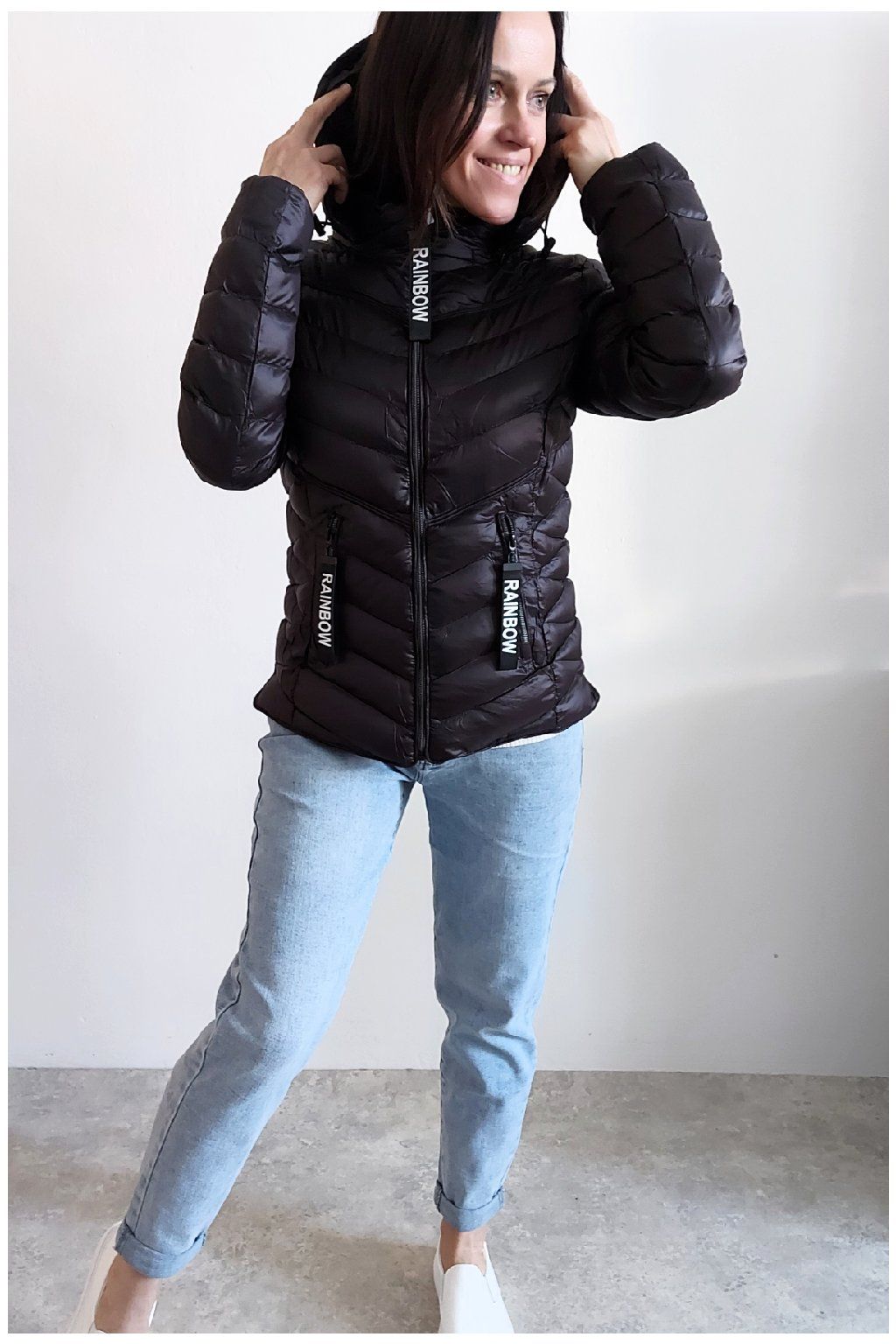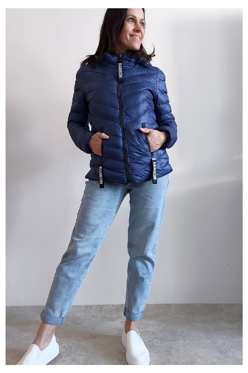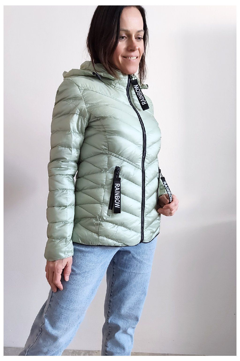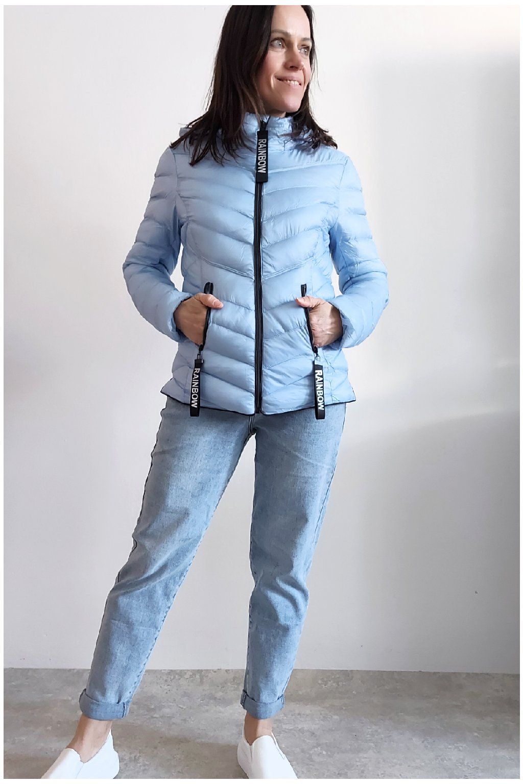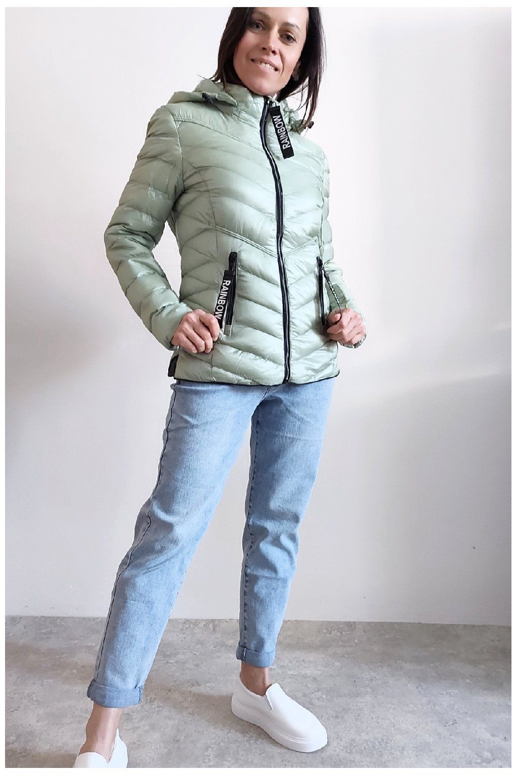 Přechodová prošívaná bunda s kapucí. Tu lze odepnout zipem a taky lze její obvod stáhnout, což oceníme při větším větru. Rukávy jsou dlouhé. Vpředu kapsy, které jsou na zip. Na jezdcích zipů jsou ozdobné řemínky s nápisem Rainbow. Po stranách jsou malinké rozparky. Bunda má podšívku. Materiál je tenčí, vhodný pro jaro a podzim. Vel. S focena na vel. XS, výška 156cm. Doporučujeme brát o vel. větší než běžně nosíte.