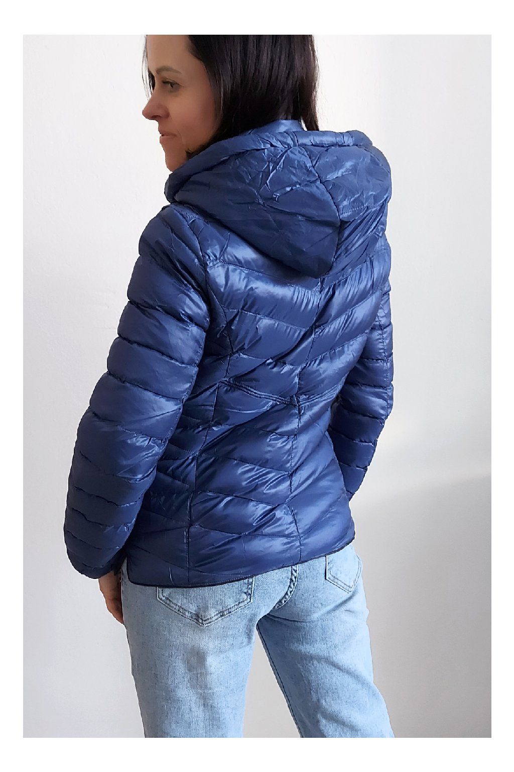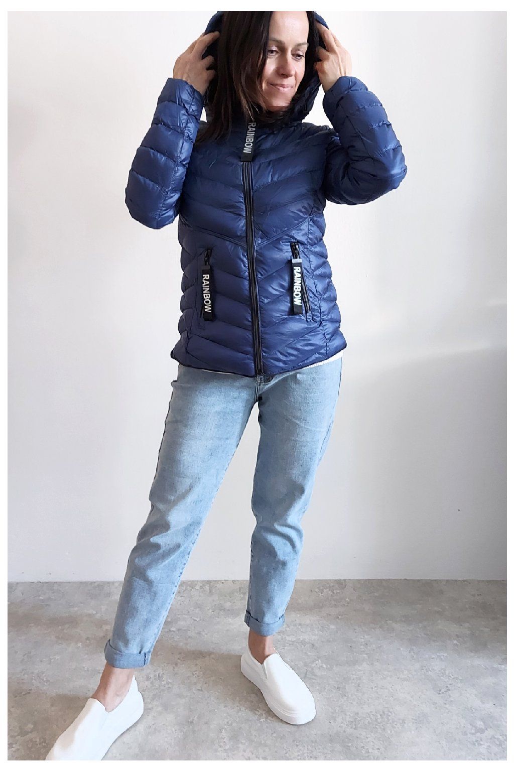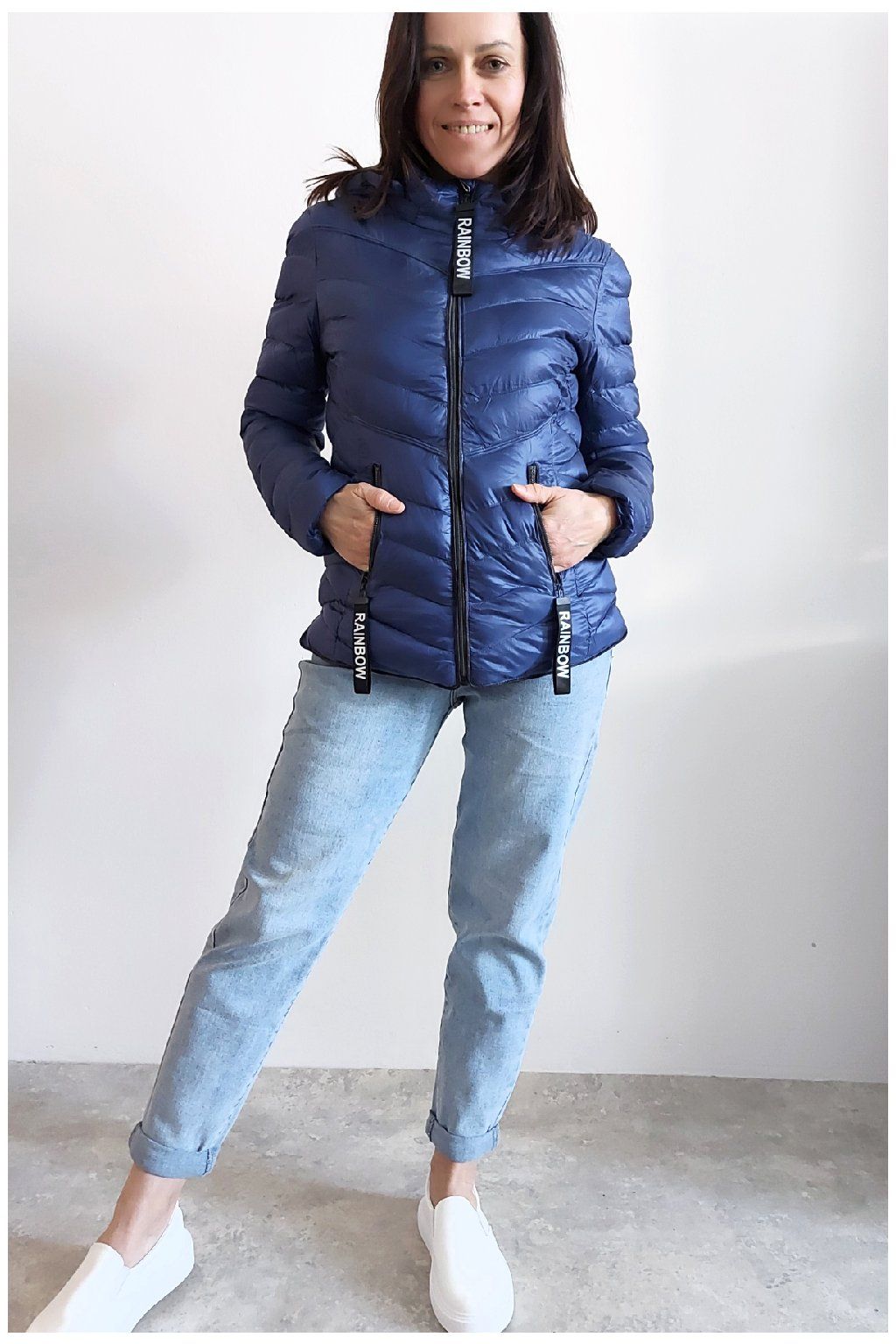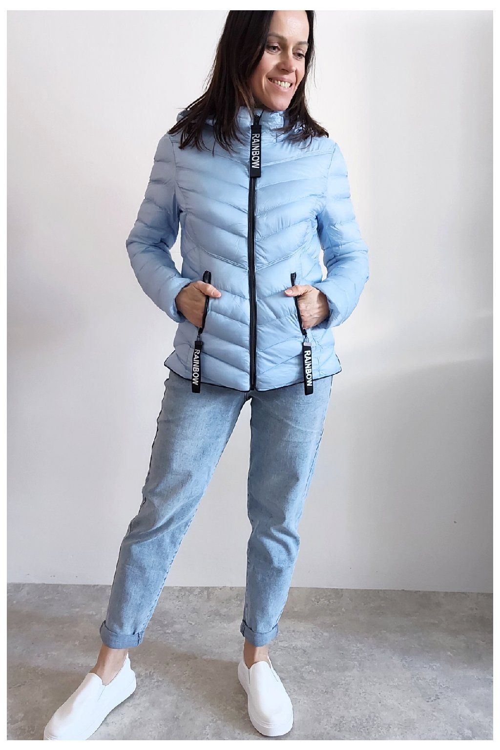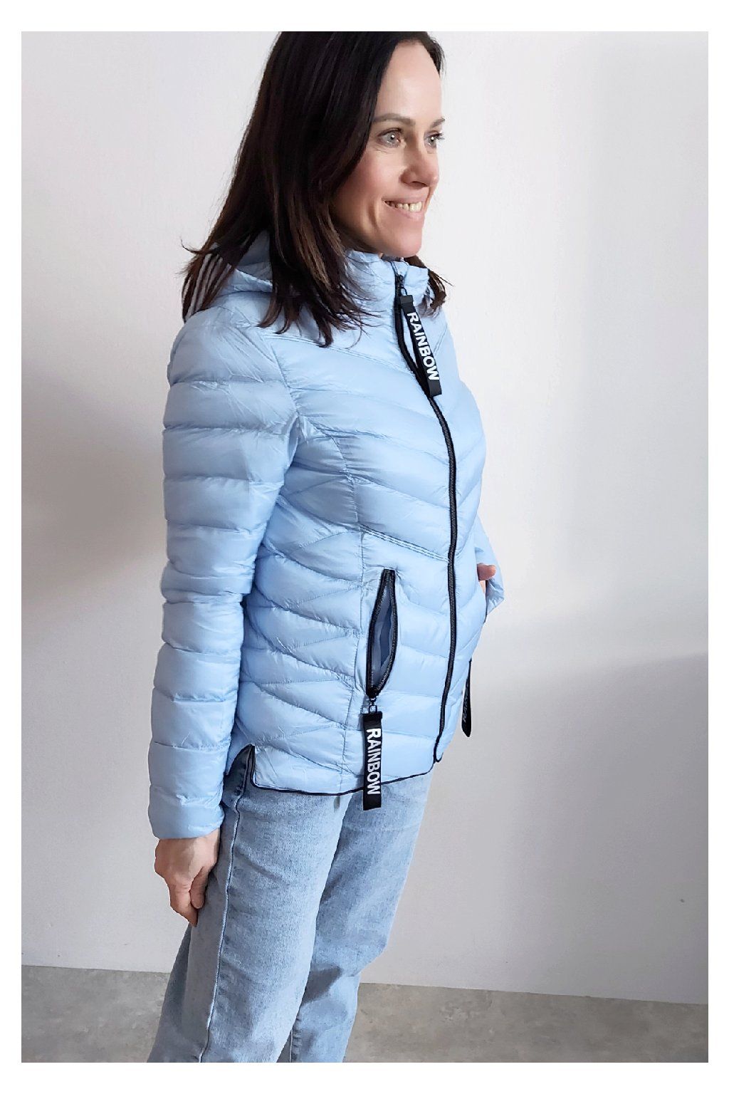 Přechodová prošívaná bunda s kapucí. Tu lze odepnout zipem a taky lze její obvod stáhnout, což oceníme při větším větru. Rukávy jsou dlouhé. Vpředu kapsy, které jsou na zip. Na jezdcích zipů jsou ozdobné řemínky s nápisem Rainbow. Po stranách jsou malinké rozparky. Bunda má podšívku. Materiál je tenčí, vhodný pro jaro a podzim. Vel. S focena na vel. XS, výška 156cm. Doporučujeme brát o vel. větší než běžně nosíte.