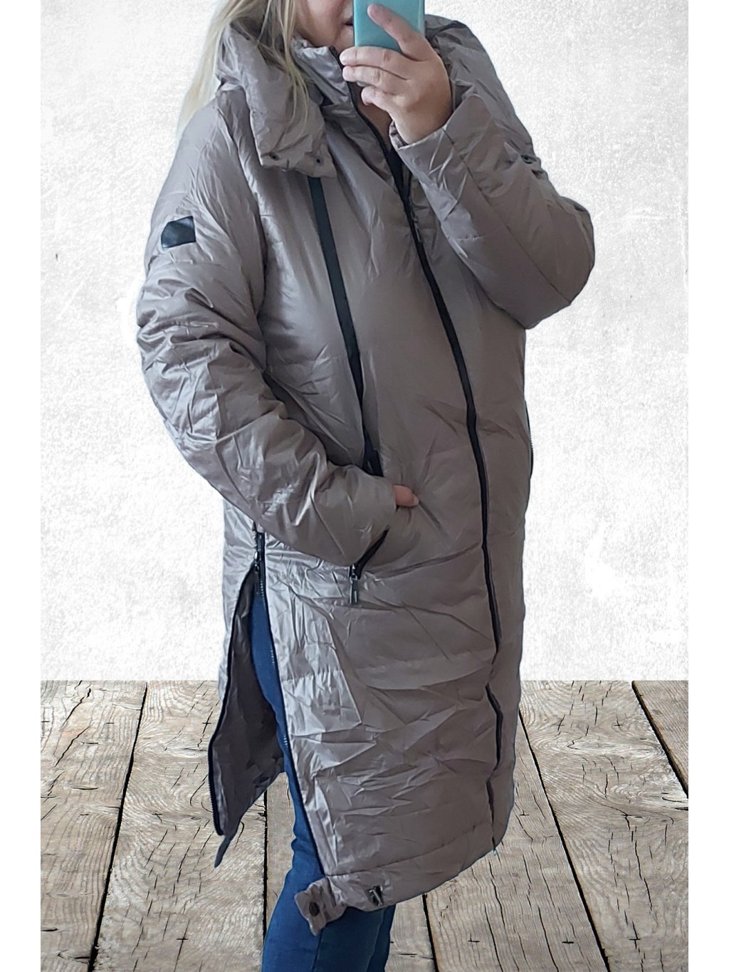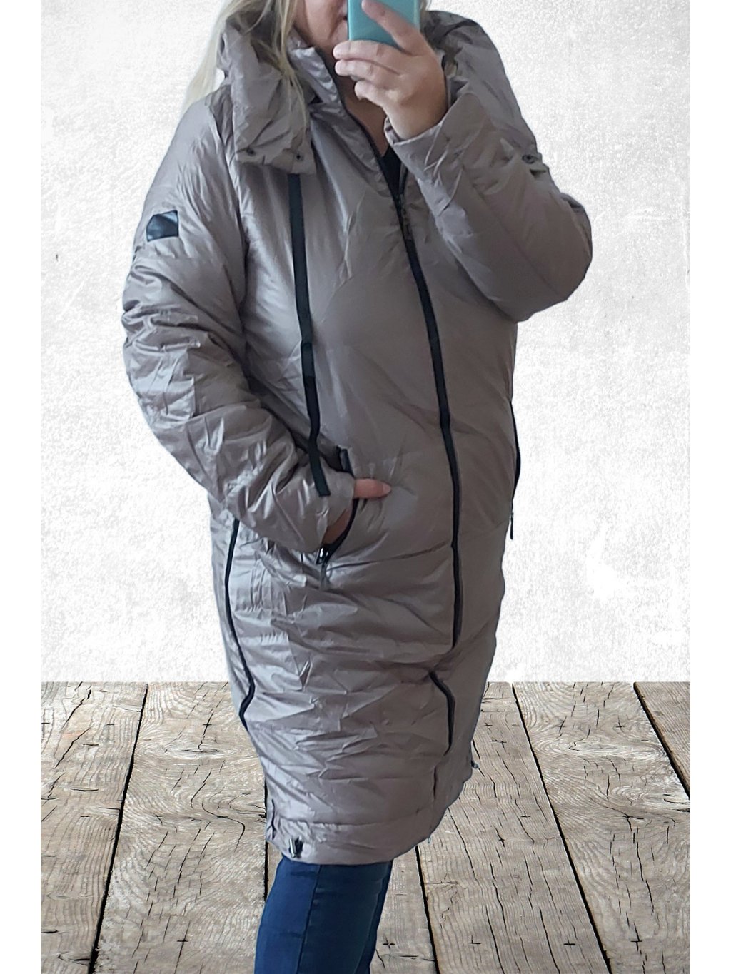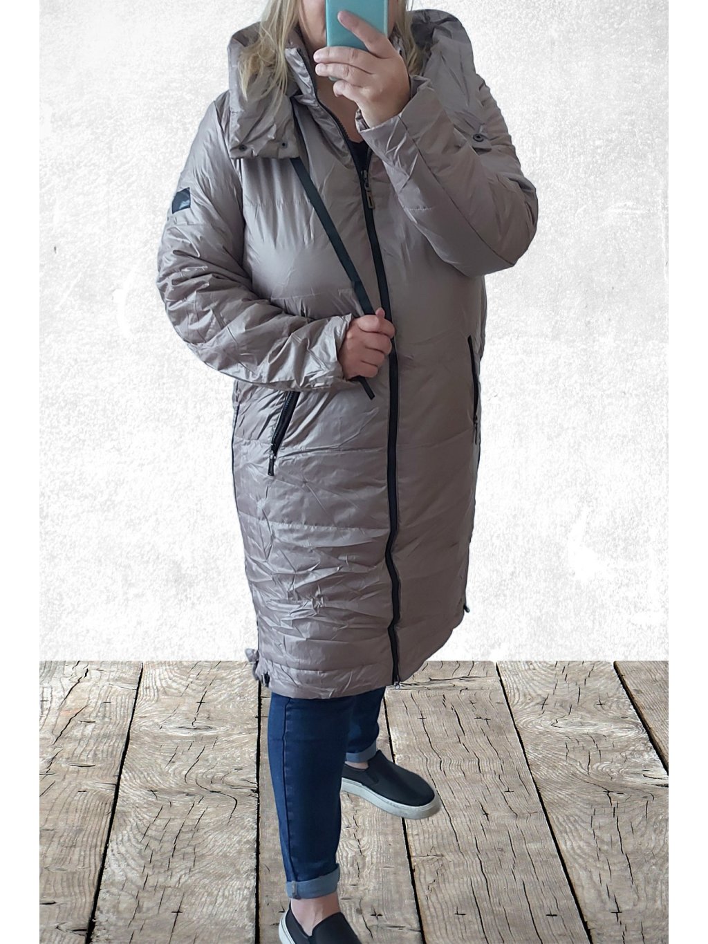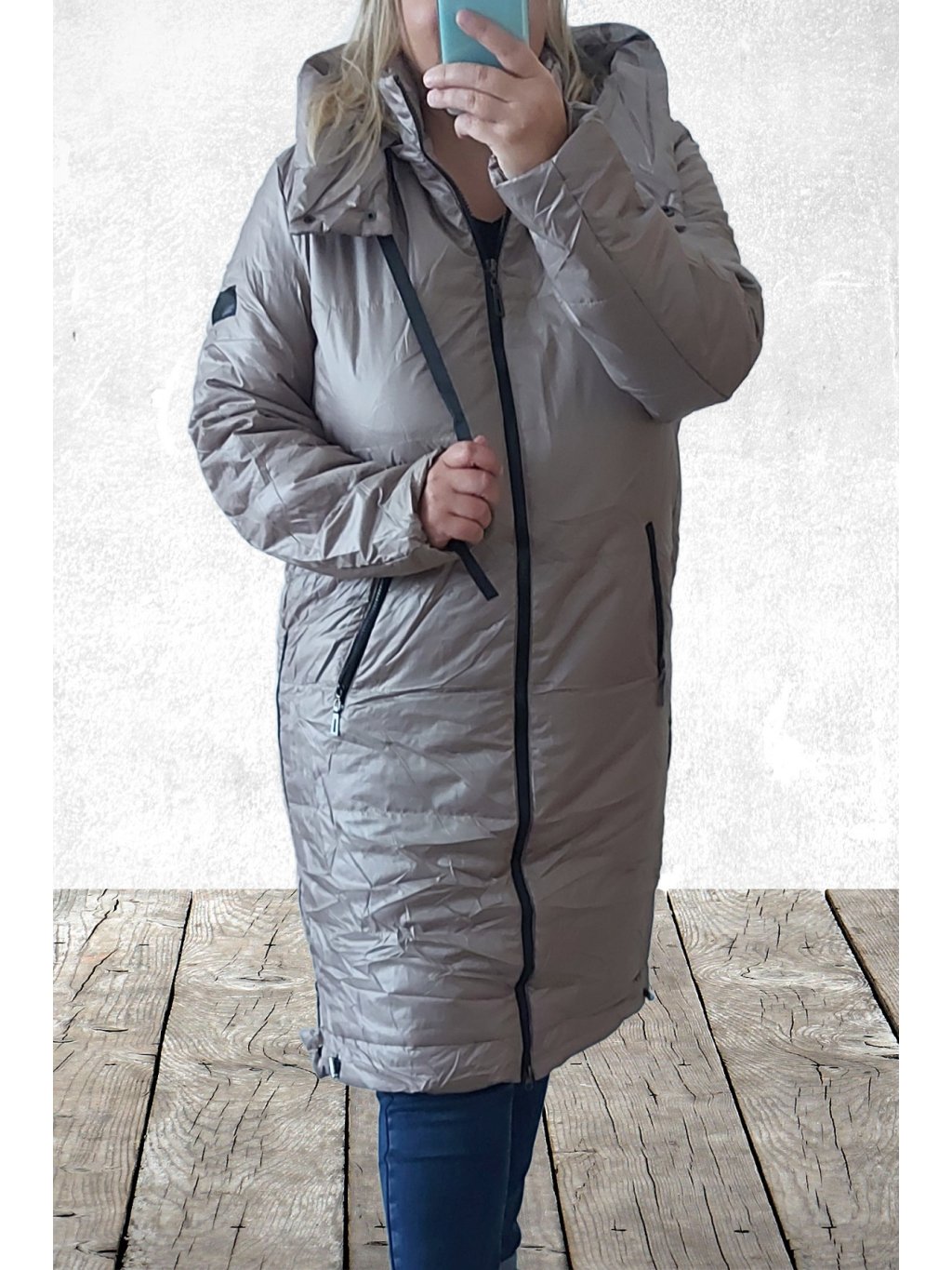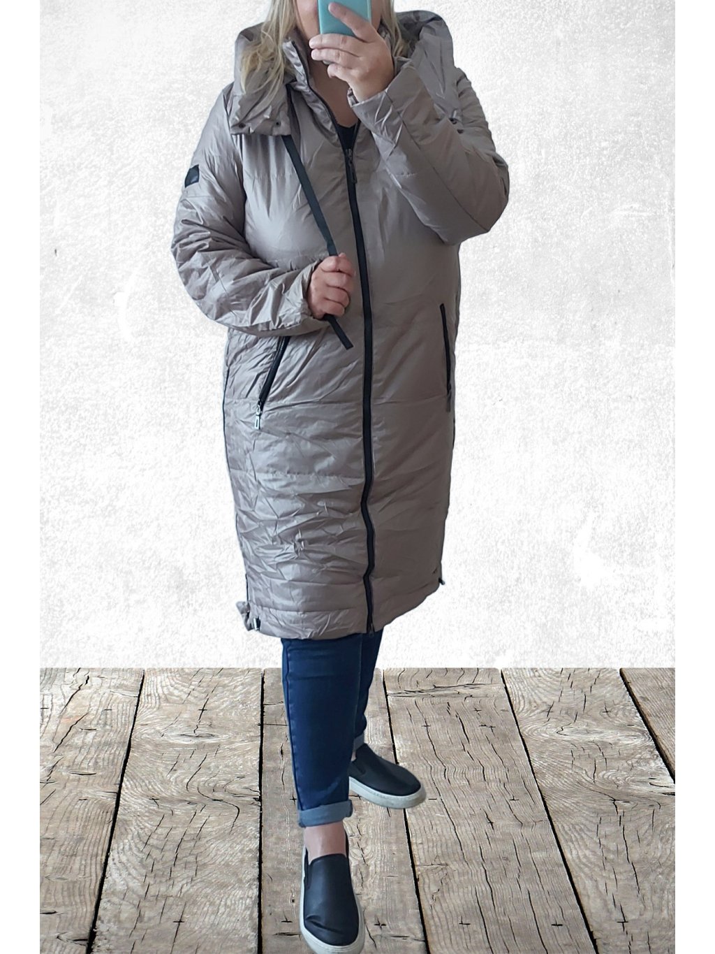Dámská delší přechodová bunda/kabát pro větší velikosti v krásné moka barvě. Má odepínací kapuci na zip, která přechází vpředu do vyššího límce na cvoky. Zapínání na zip po celé délce. Kapsy jsou také uzaviratelné zipem. Po stranách jsou funkční zipy, které přijdou vhod třeba v autě pro lepší pohodlí při řízení. Na jednom z rukávů ozdobná nášivka. Podšito tenčí šusťákovinou. Vhodné pro podzim, jaro i na mírnou zimu. Vel. 3XL focena na vel. XS, výška 156cm a vel. 4XL focena na vel. 2XL (prsa 116cm, boky 120cm), výška 165cm.