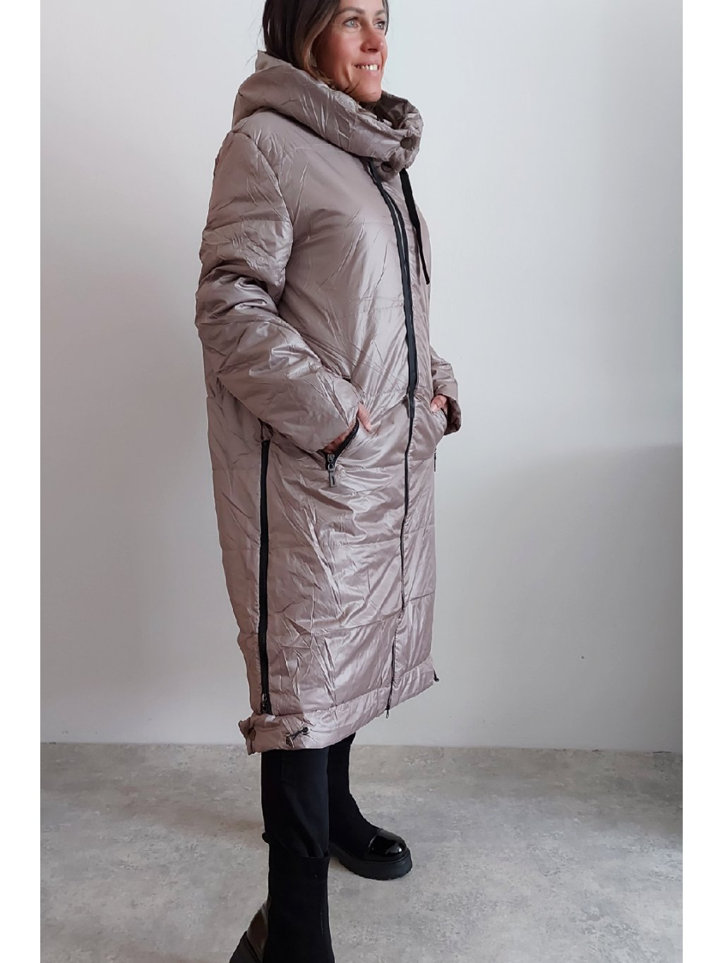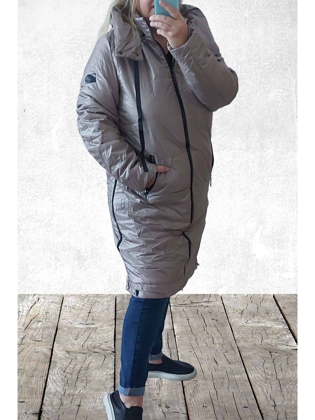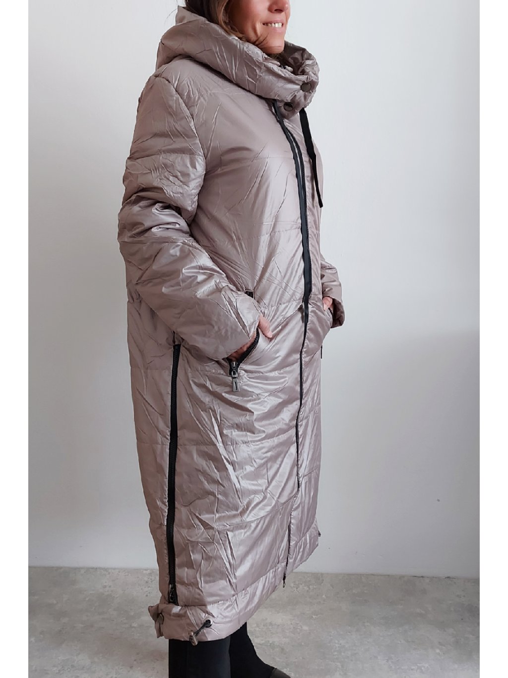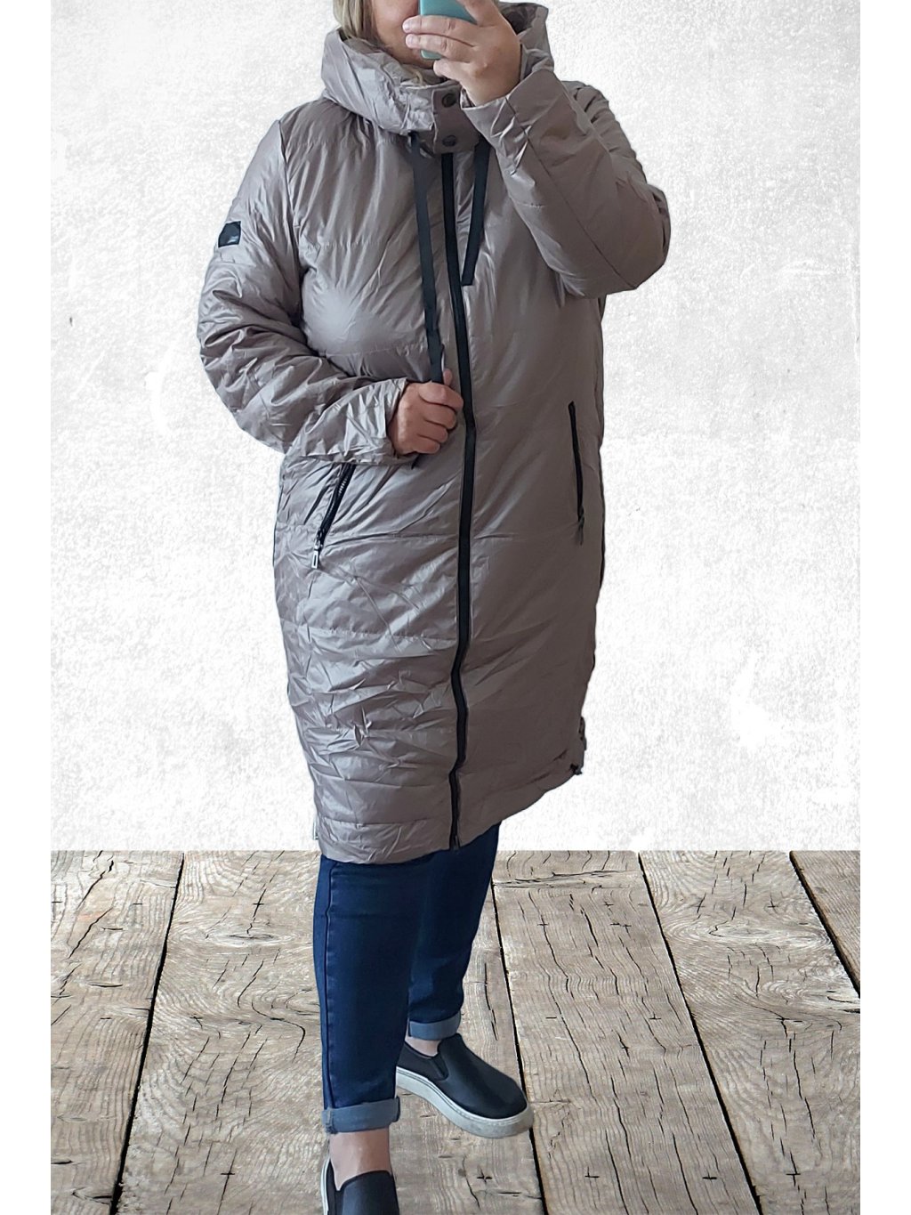 Dámská delší přechodová bunda/kabát pro větší velikosti v krásné moka barvě. Má odepínací kapuci na zip, která přechází vpředu do vyššího límce na cvoky. Zapínání na zip po celé délce. Kapsy jsou také uzaviratelné zipem. Po stranách jsou funkční zipy, které přijdou vhod třeba v autě pro lepší pohodlí při řízení. Na jednom z rukávů ozdobná nášivka. Podšito tenčí šusťákovinou. Vhodné pro podzim, jaro i na mírnou zimu. Vel. 3XL focena na vel. XS, výška 156cm a vel. 4XL focena na vel. 2XL (prsa 116cm, boky 120cm), výška 165cm.