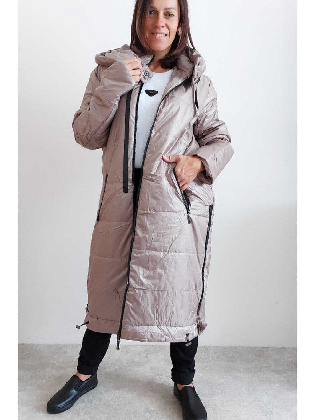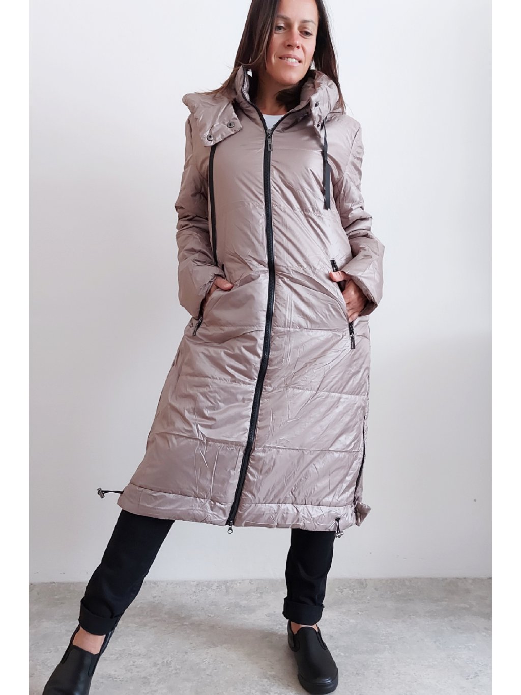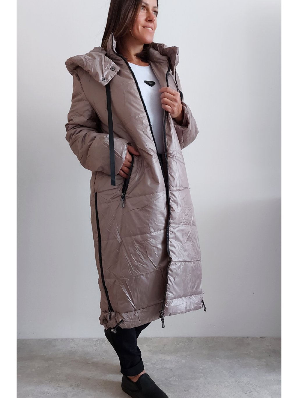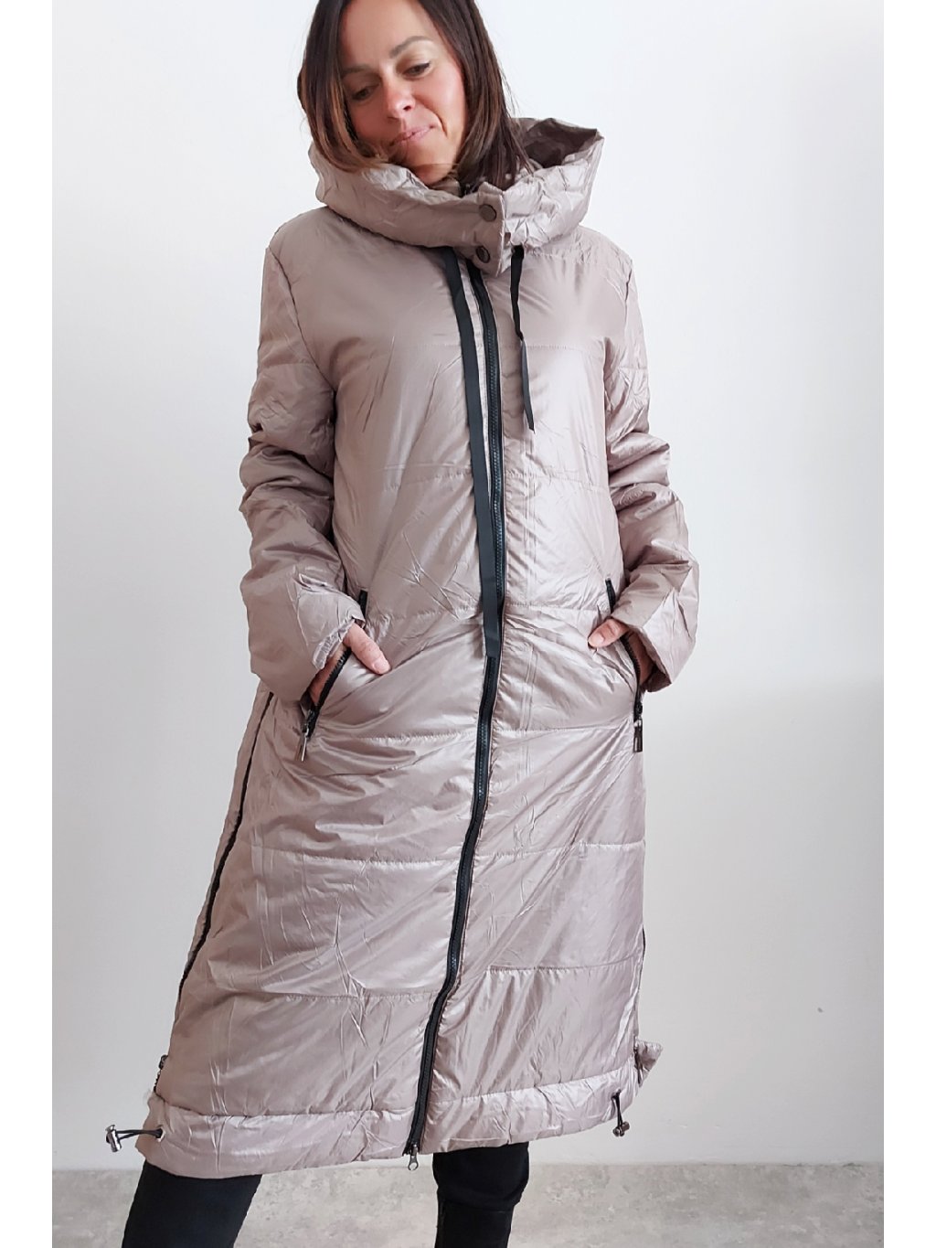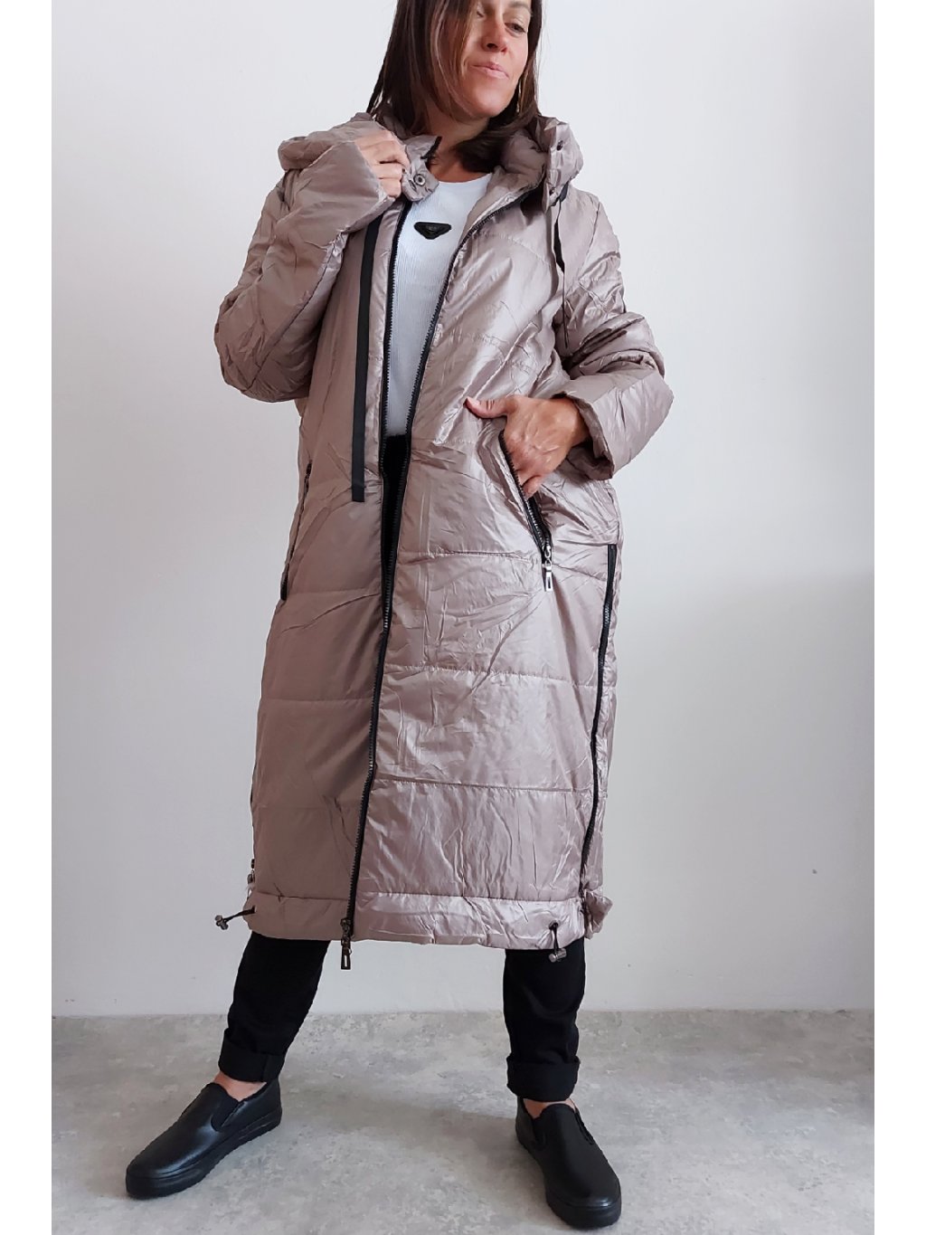 Dámská delší přechodová bunda/kabát pro větší velikosti v krásné moka barvě. Má odepínací kapuci na zip, která přechází vpředu do vyššího límce na cvoky. Zapínání na zip po celé délce. Kapsy jsou také uzaviratelné zipem. Po stranách jsou funkční zipy, které přijdou vhod třeba v autě pro lepší pohodlí při řízení. Na jednom z rukávů ozdobná nášivka. Podšito tenčí šusťákovinou. Vhodné pro podzim, jaro i na mírnou zimu. Vel. 3XL focena na vel. XS, výška 156cm a vel. 4XL focena na vel. 2XL (prsa 116cm, boky 120cm), výška 165cm.