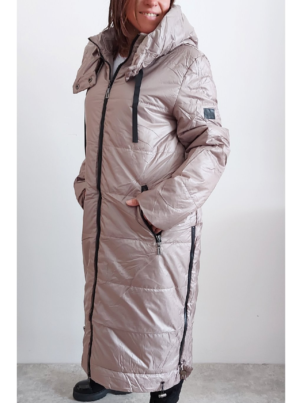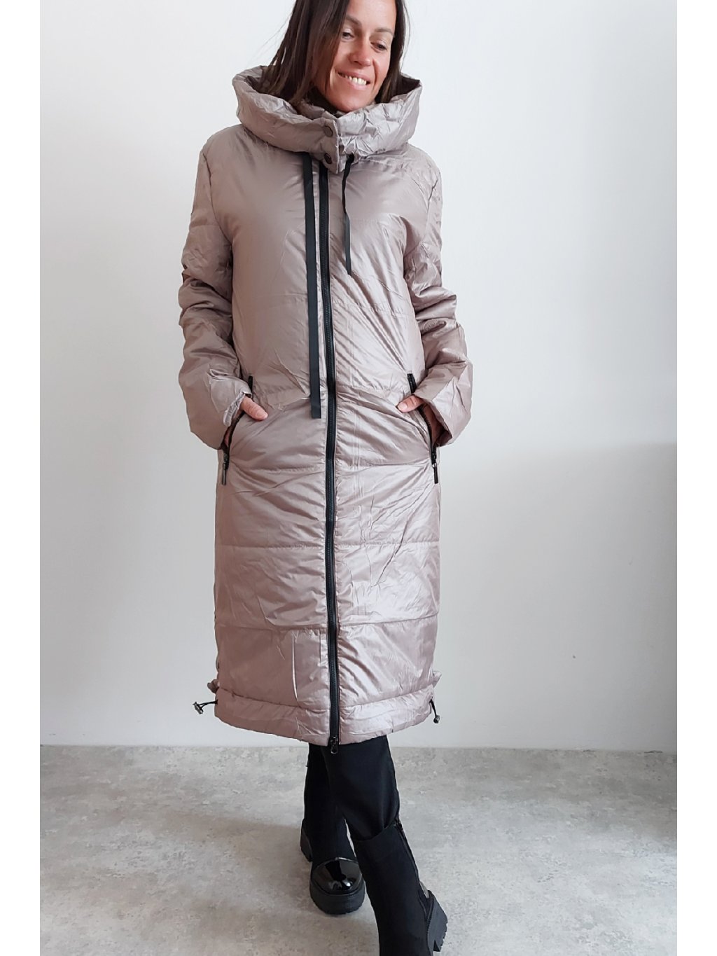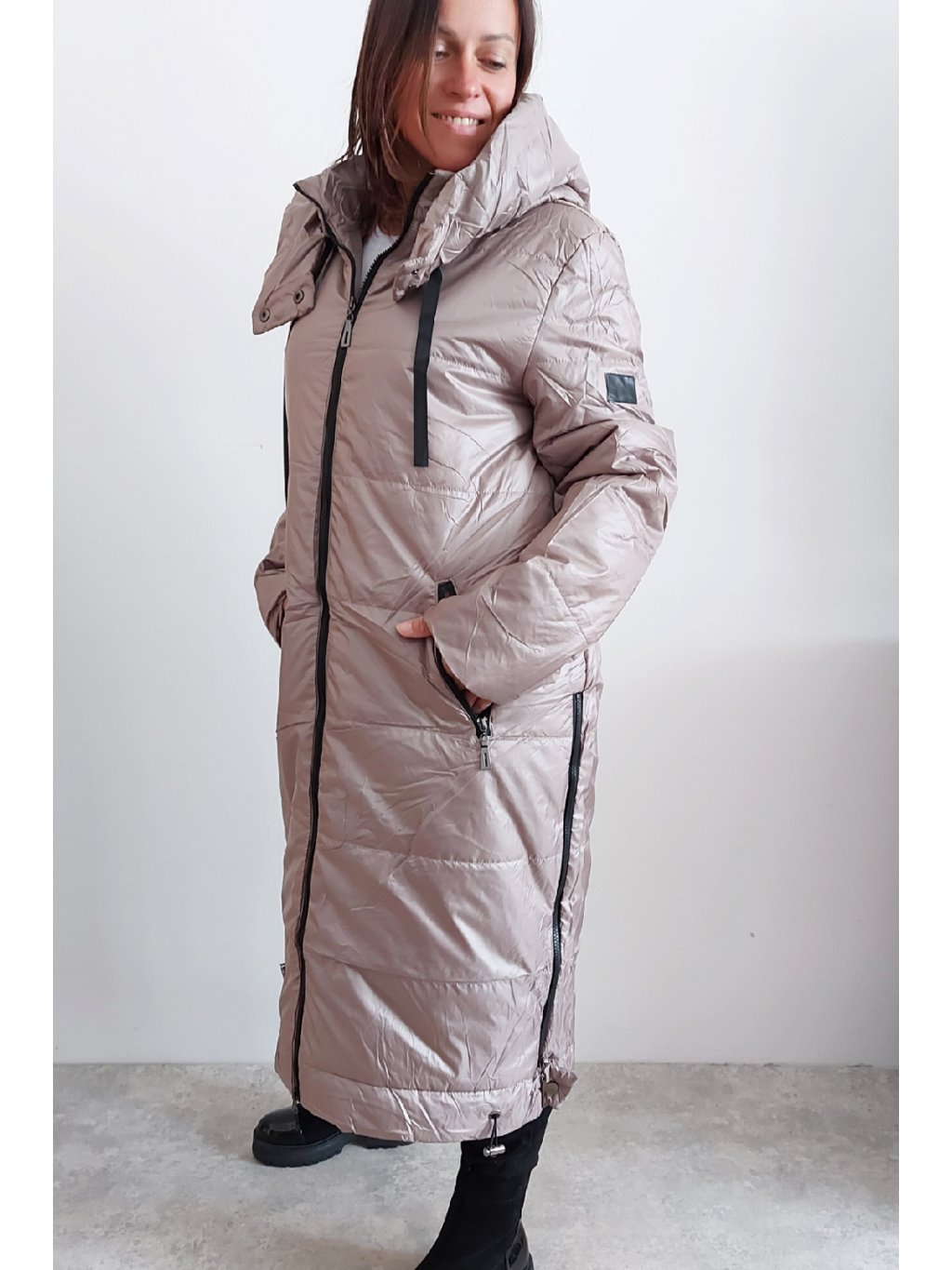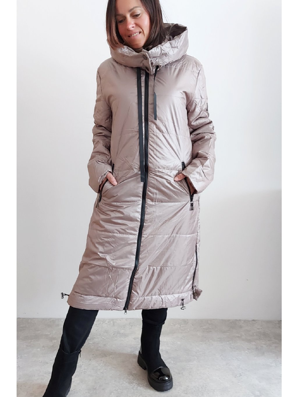 Dámská delší přechodová bunda/kabát pro větší velikosti v krásné moka barvě. Má odepínací kapuci na zip, která přechází vpředu do vyššího límce na cvoky. Zapínání na zip po celé délce. Kapsy jsou také uzaviratelné zipem. Po stranách jsou funkční zipy, které přijdou vhod třeba v autě pro lepší pohodlí při řízení. Na jednom z rukávů ozdobná nášivka. Podšito tenčí šusťákovinou. Vhodné pro podzim, jaro i na mírnou zimu. Vel. 3XL focena na vel. XS, výška 156cm a vel. 4XL focena na vel. 2XL (prsa 116cm, boky 120cm), výška 165cm.