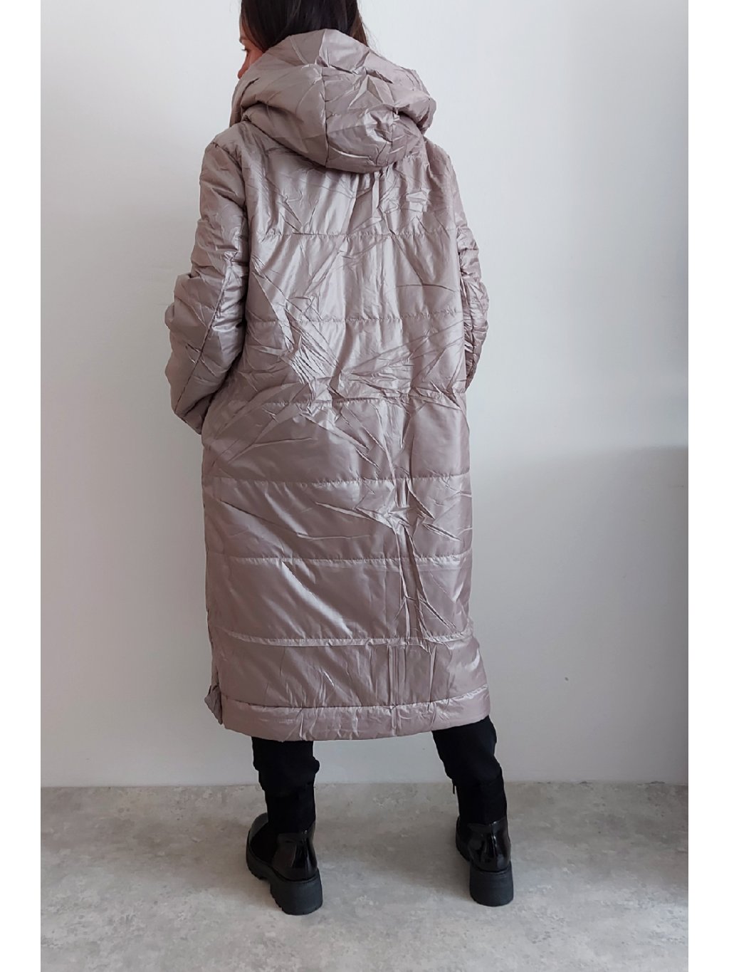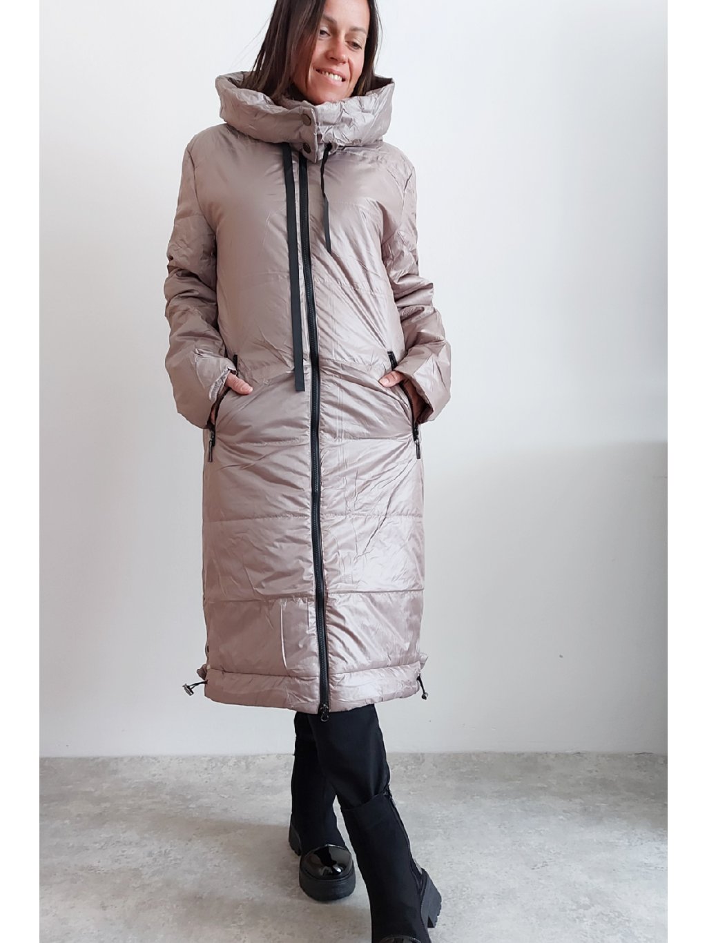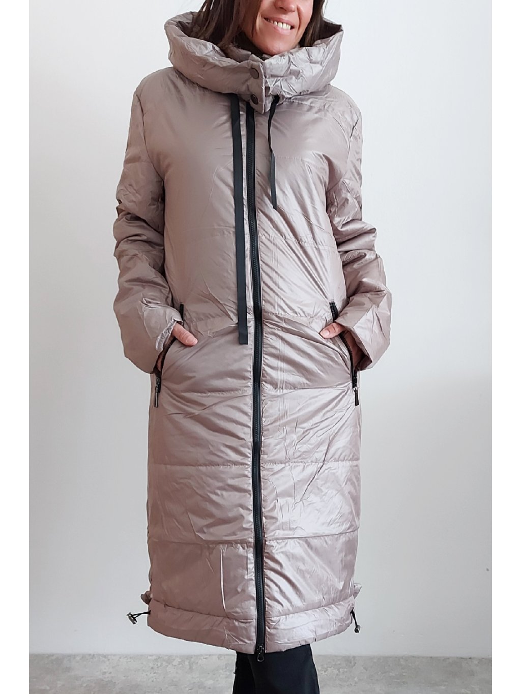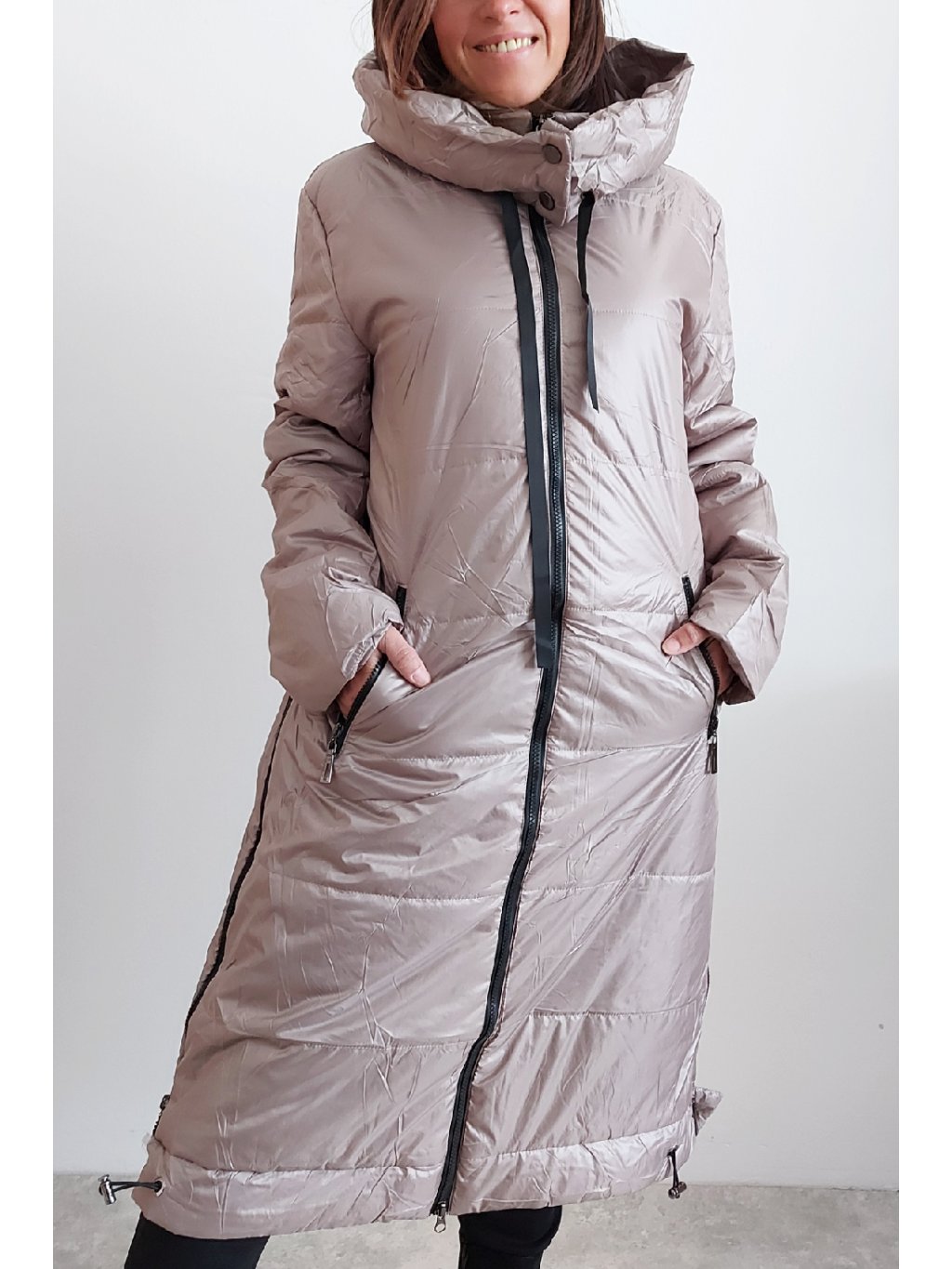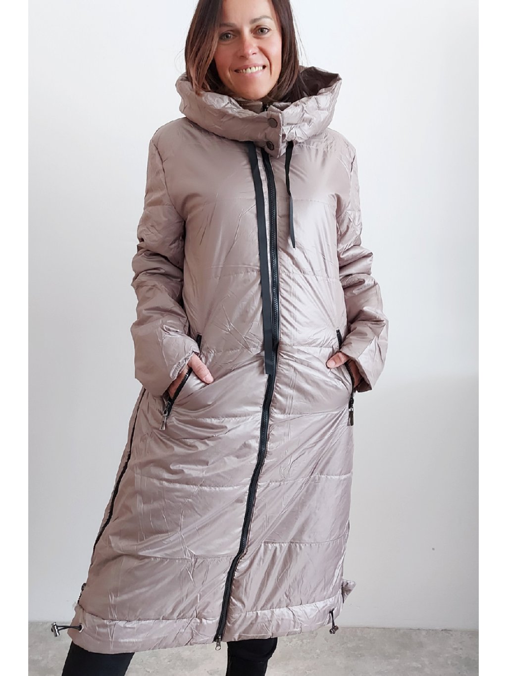 Dámská delší přechodová bunda/kabát pro větší velikosti v krásné moka barvě. Má odepínací kapuci na zip, která přechází vpředu do vyššího límce na cvoky. Zapínání na zip po celé délce. Kapsy jsou také uzaviratelné zipem. Po stranách jsou funkční zipy, které přijdou vhod třeba v autě pro lepší pohodlí při řízení. Na jednom z rukávů ozdobná nášivka. Podšito tenčí šusťákovinou. Vhodné pro podzim, jaro i na mírnou zimu. Vel. 3XL focena na vel. XS, výška 156cm a vel. 4XL focena na vel. 2XL (prsa 116cm, boky 120cm), výška 165cm.
