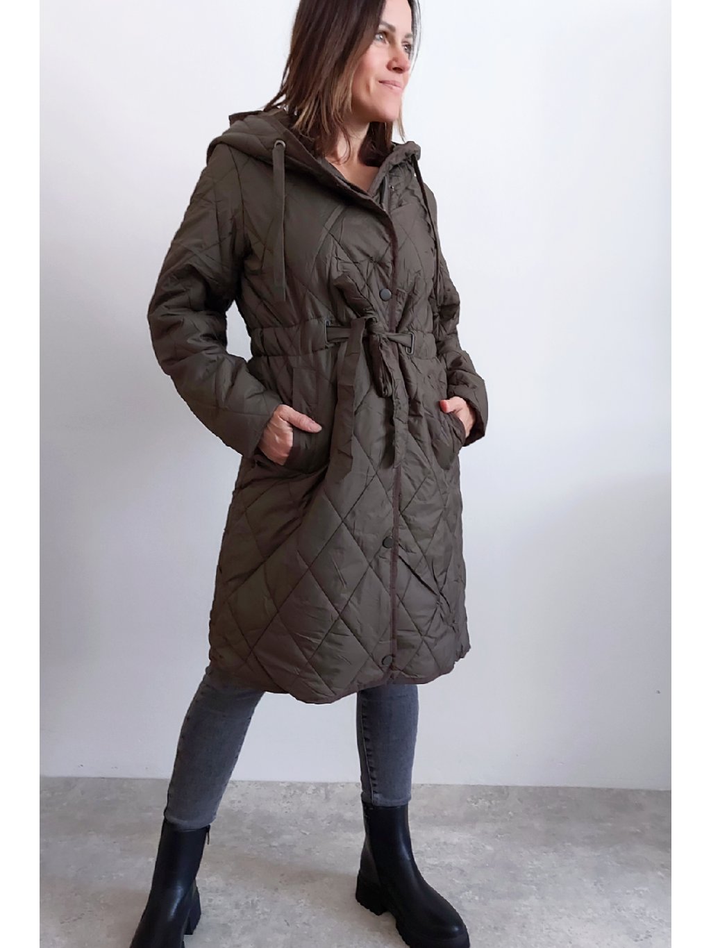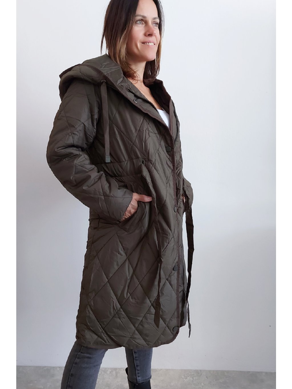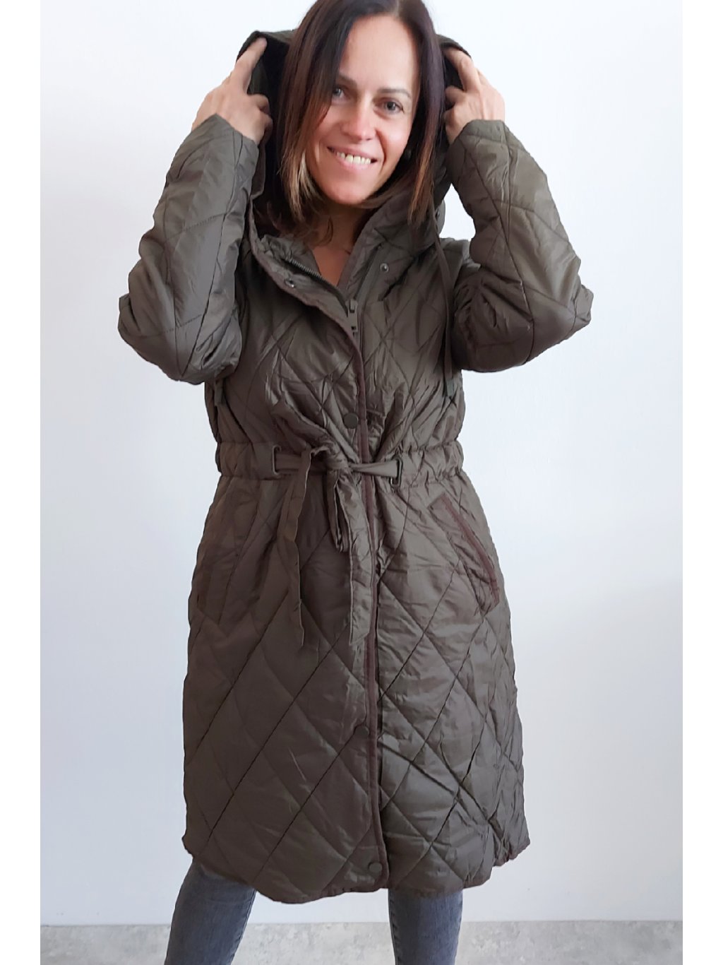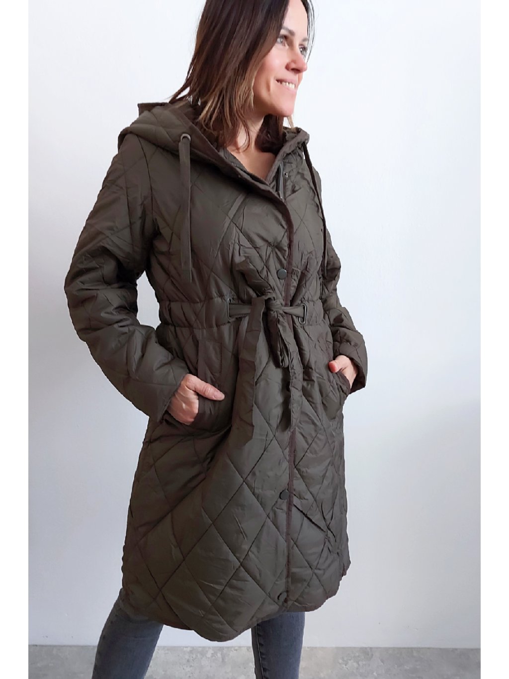Módní prošívaná bunda. Má kapuci, kterou nelze odepnout. Ta má šňůrky na stažení. Zapínání na zip a druky, V pase šňůrka na stáhnutí, kterou lze uvázat vpředu či vzadu. Přední kapsy. Volnější střih - velikosti odpovídají. Vhodná na podzim či jaro i mírnou zimu. Vel. S focena na vel. XS, výška 156cm.