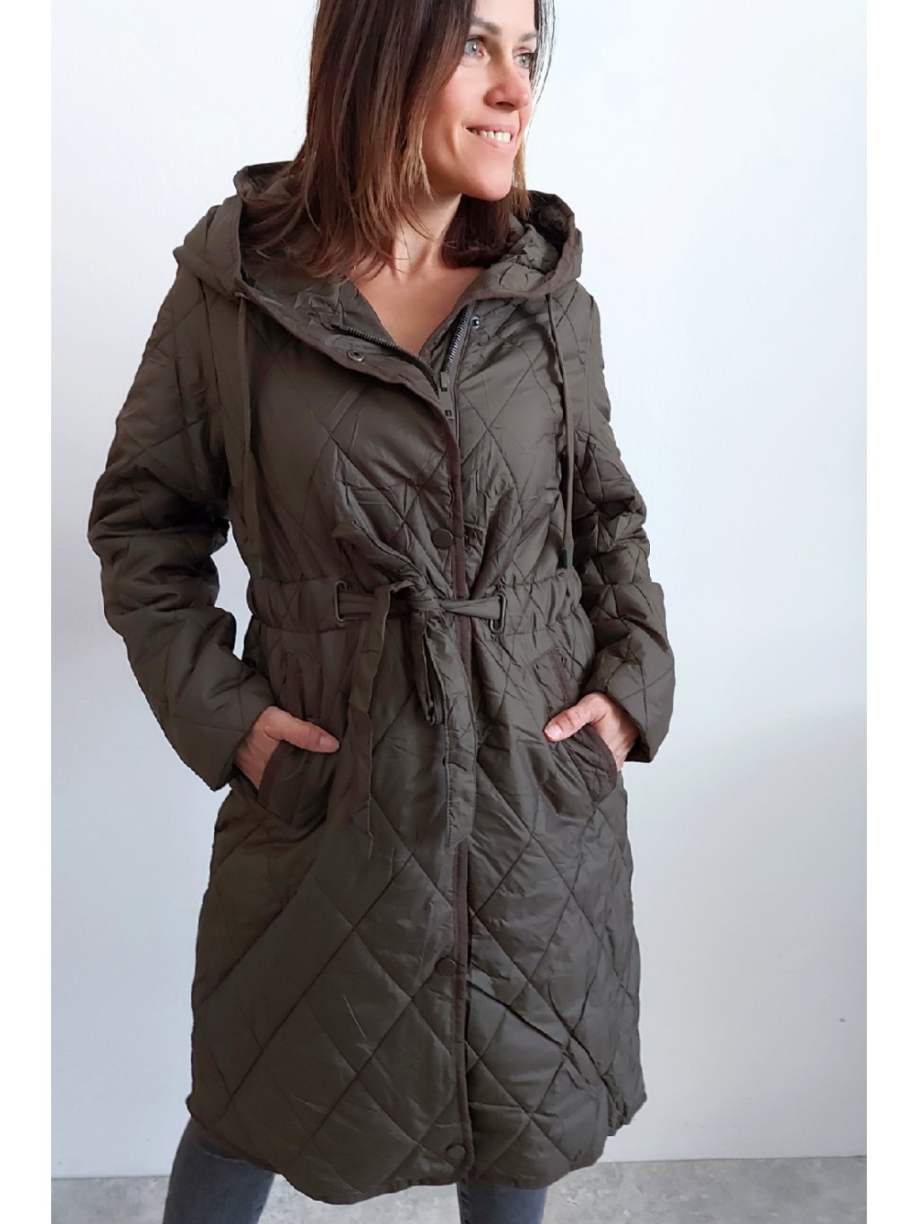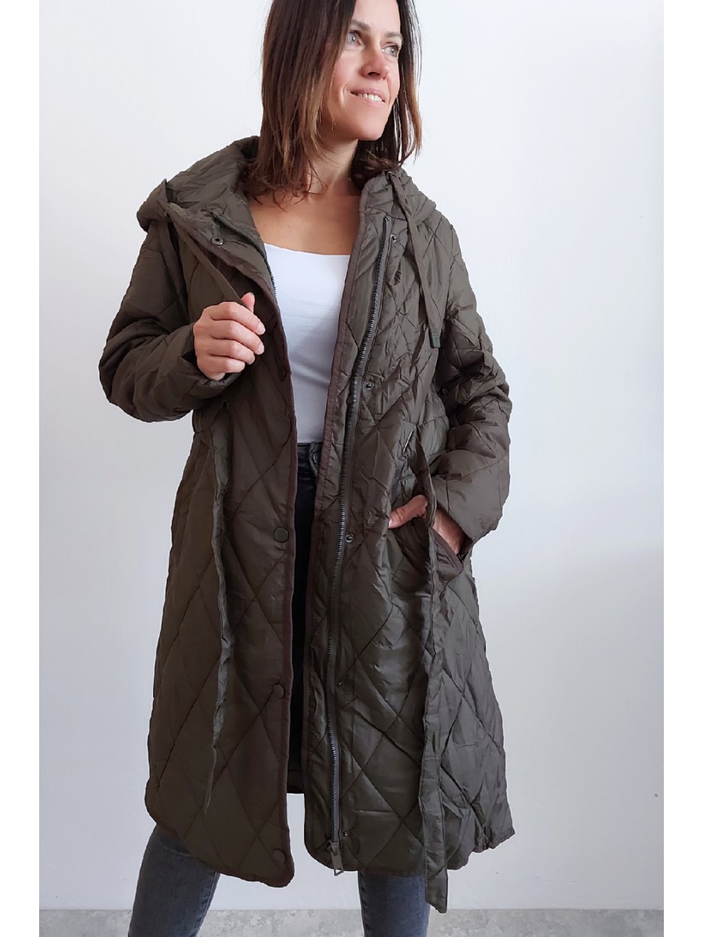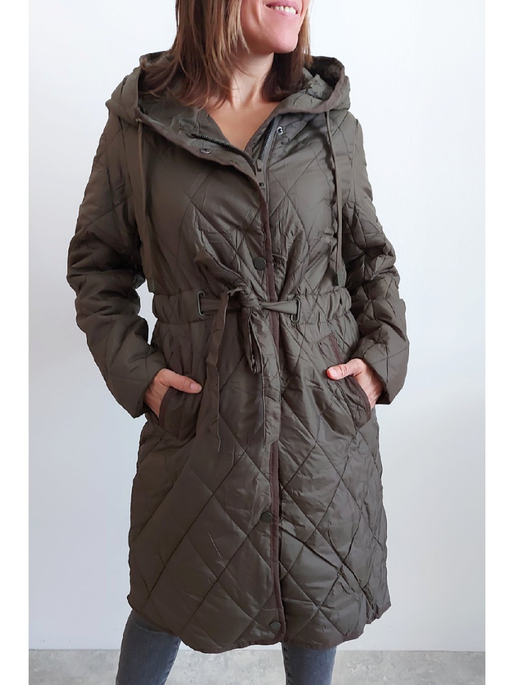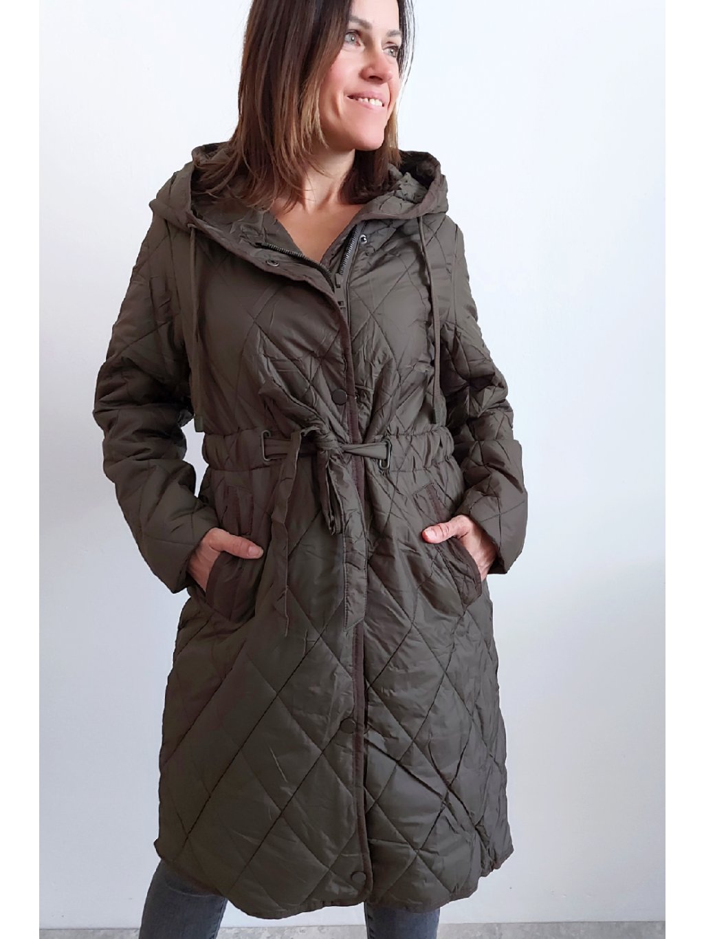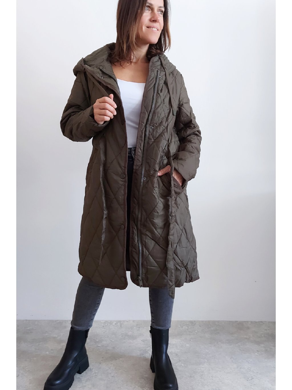 Módní prošívaná bunda. Má kapuci, kterou nelze odepnout. Ta má šňůrky na stažení. Zapínání na zip a druky, V pase šňůrka na stáhnutí, kterou lze uvázat vpředu či vzadu. Přední kapsy. Volnější střih - velikosti odpovídají. Vhodná na podzim či jaro i mírnou zimu. Vel. S focena na vel. XS, výška 156cm.