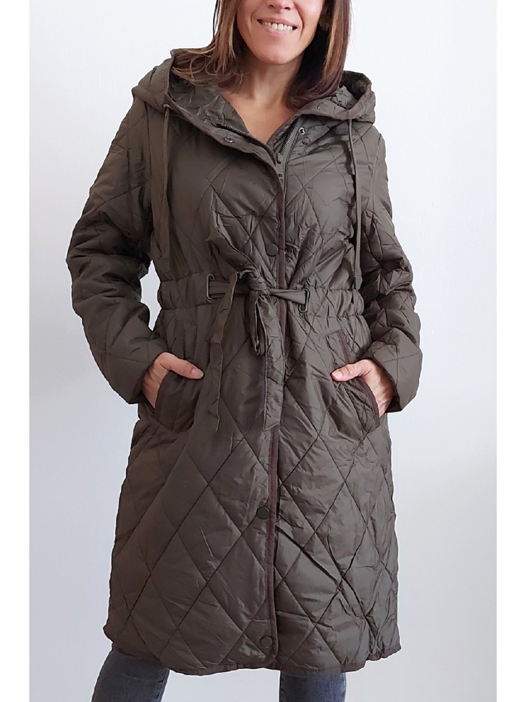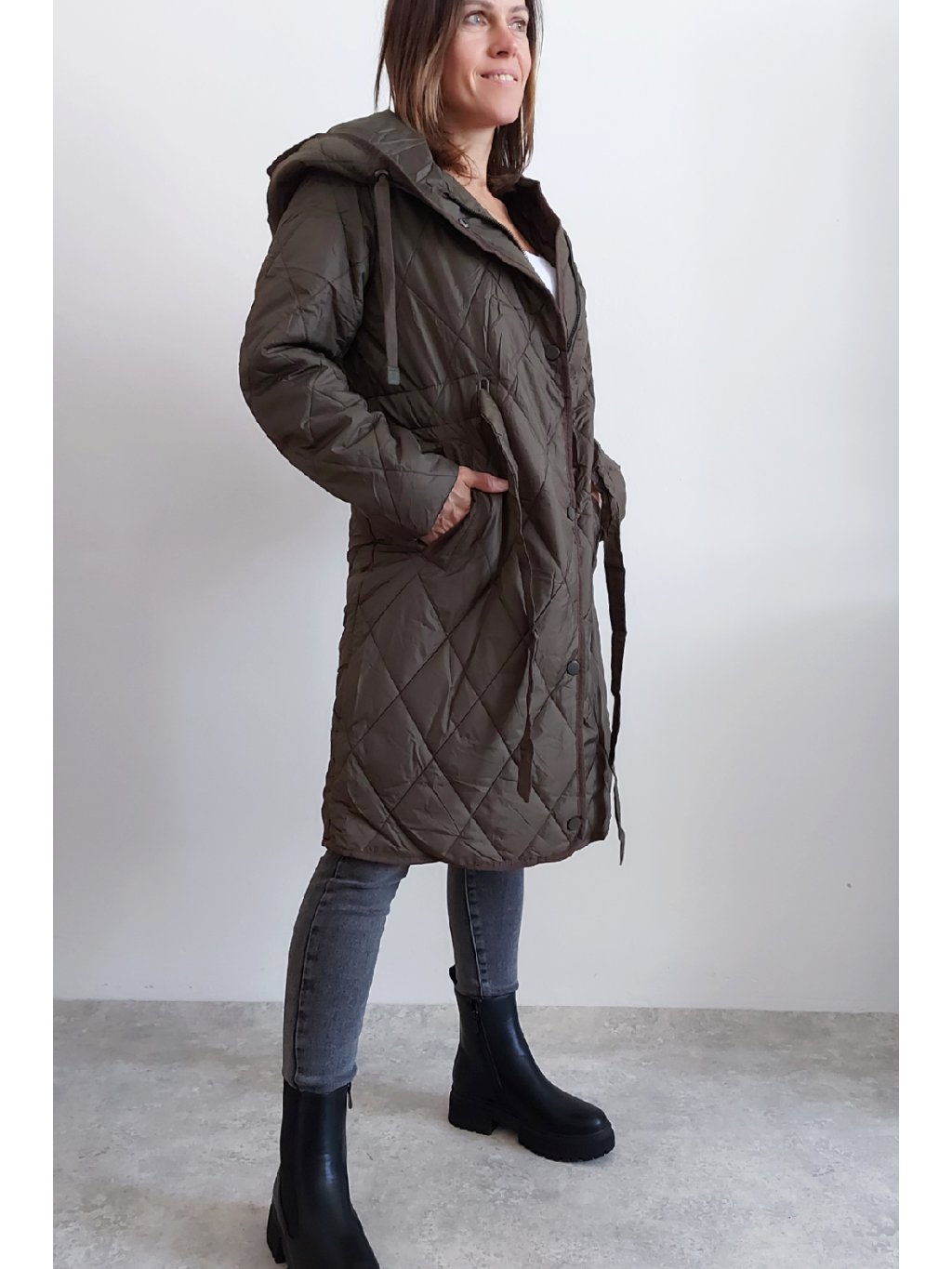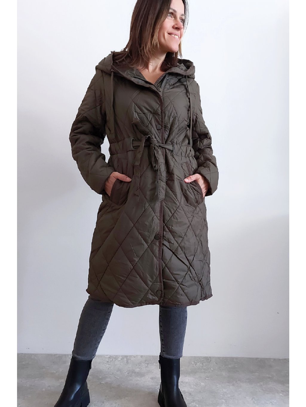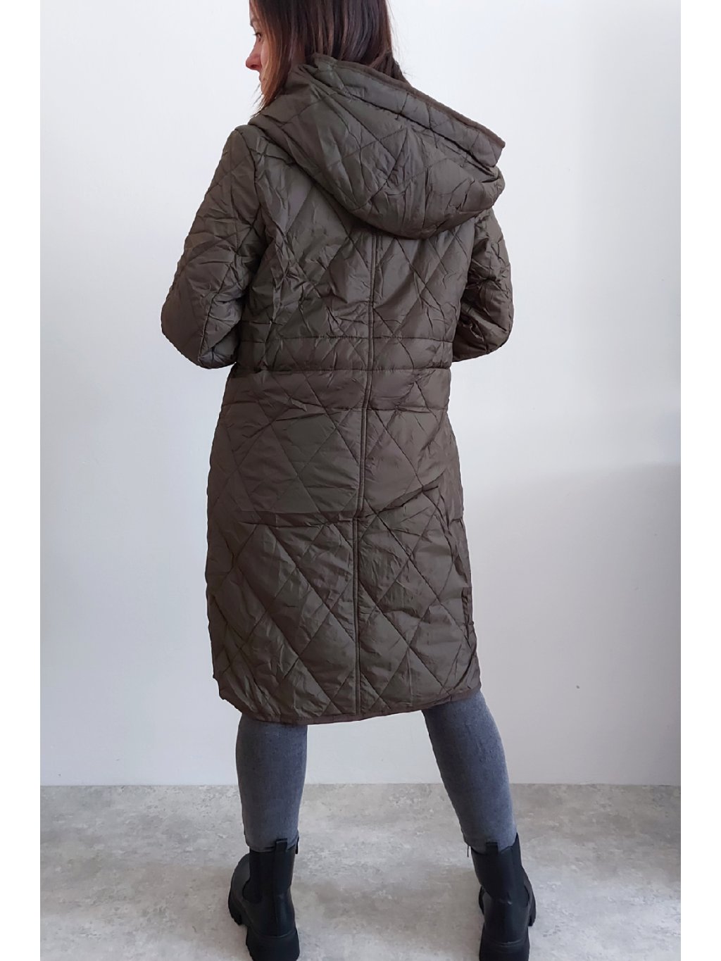 Módní prošívaná bunda. Má kapuci, kterou nelze odepnout. Ta má šňůrky na stažení. Zapínání na zip a druky, V pase šňůrka na stáhnutí, kterou lze uvázat vpředu či vzadu. Přední kapsy. Volnější střih - velikosti odpovídají. Vhodná na podzim či jaro i mírnou zimu. Vel. S focena na vel. XS, výška 156cm.