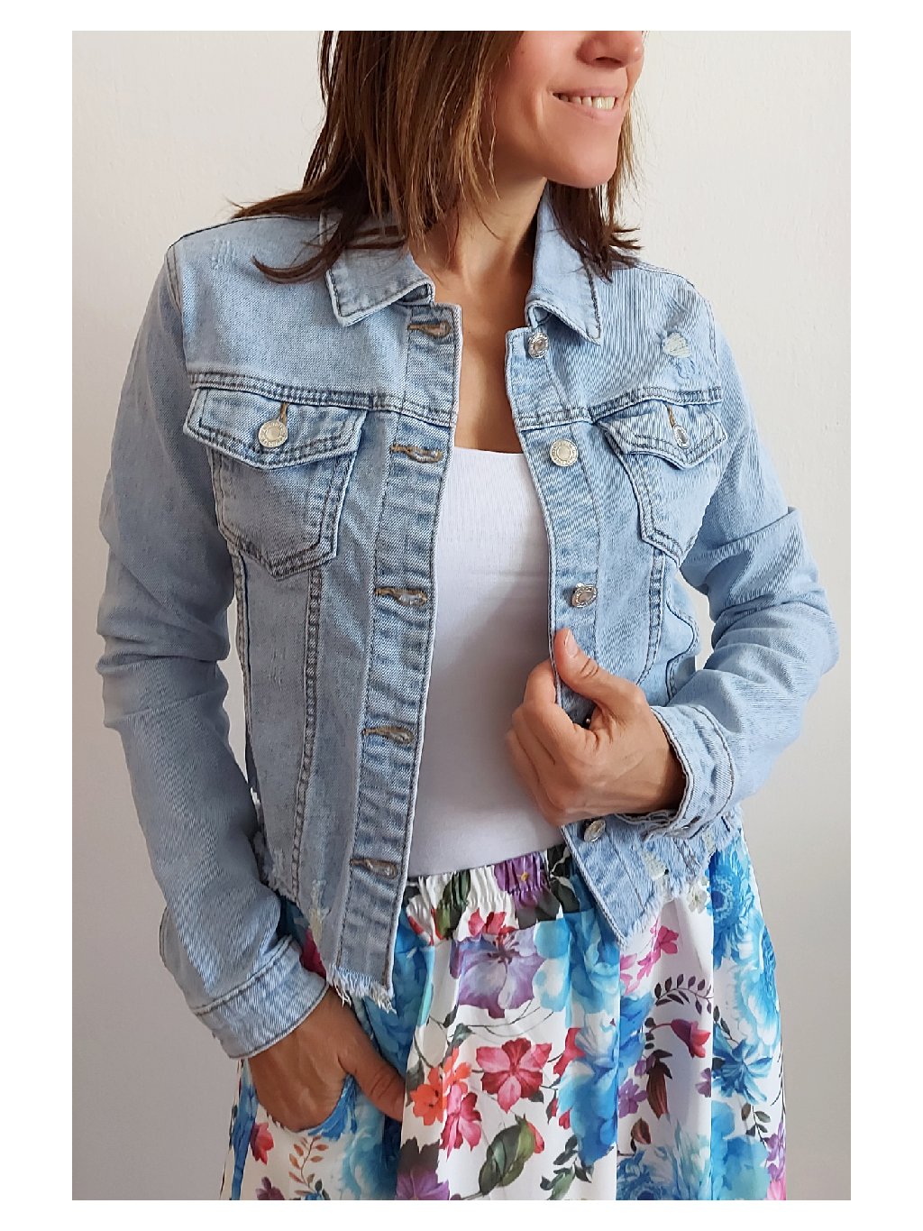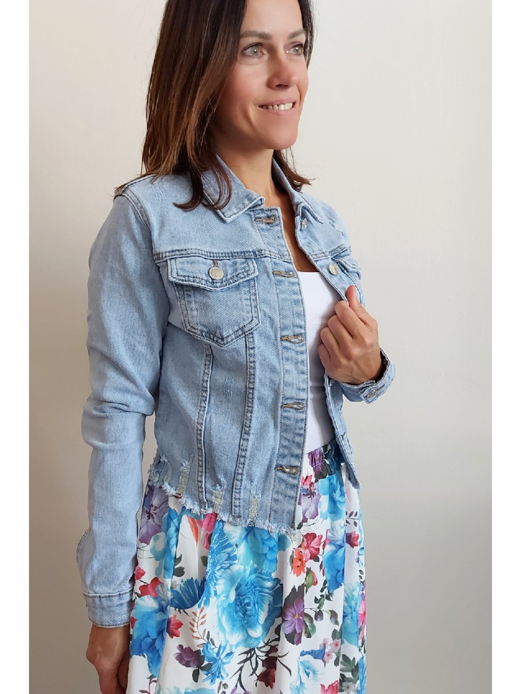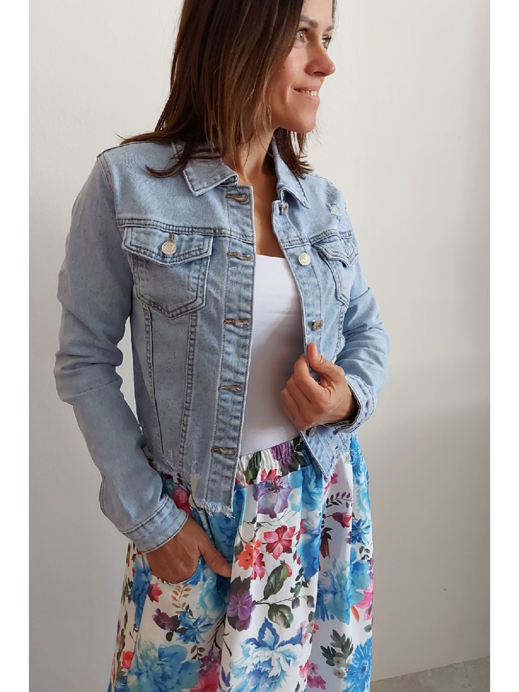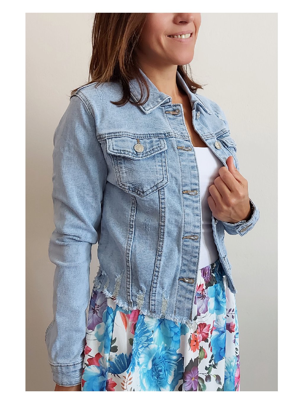 Nádherná džínová bunda ve světlém provedení. Kratší délka, spodní lem je ukončený trháním. Rukávy dlouhé. Místy efektní dření. Top kvalita. Skvěle se hodí k šatům, kalhotám, džínům, sukni. Ideální na jaro/podzim i chladné letní večery. Vel. XS focena na vel. XS.