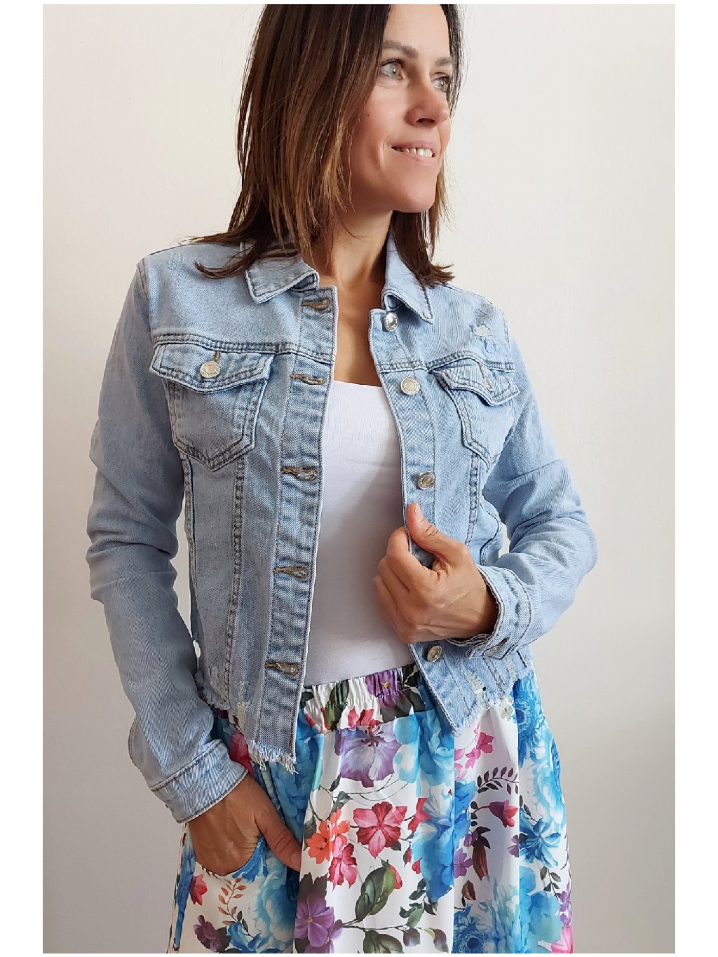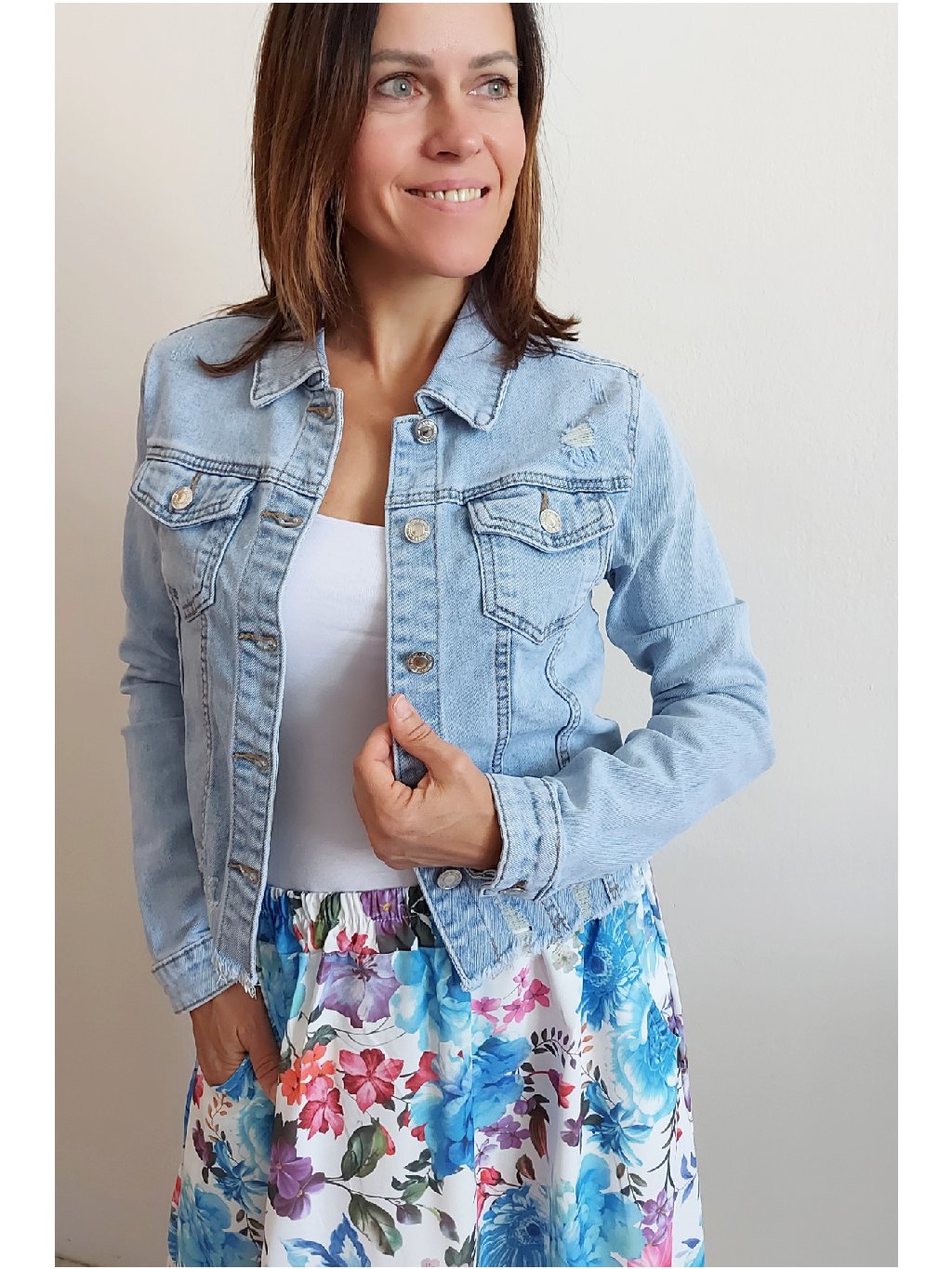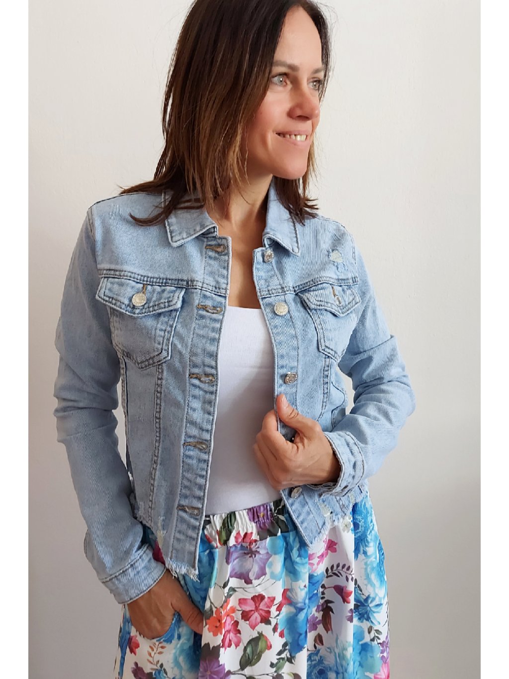 Nádherná džínová bunda ve světlém provedení. Kratší délka, spodní lem je ukončený trháním. Rukávy dlouhé. Místy efektní dření. Top kvalita. Skvěle se hodí k šatům, kalhotám, džínům, sukni. Ideální na jaro/podzim i chladné letní večery. Vel. XS focena na vel. XS.