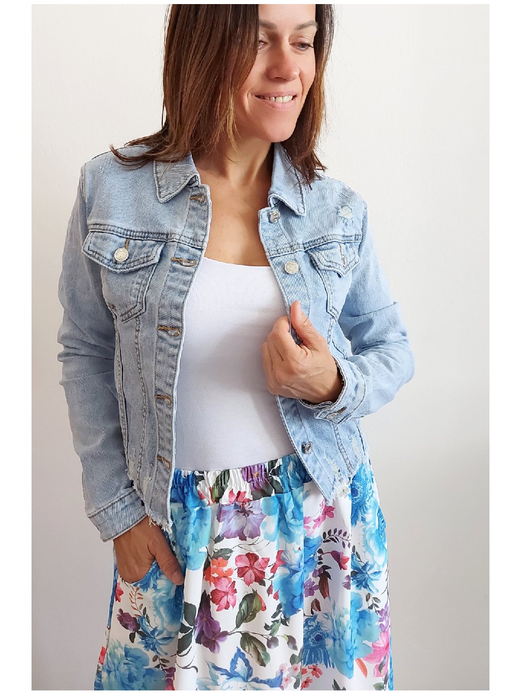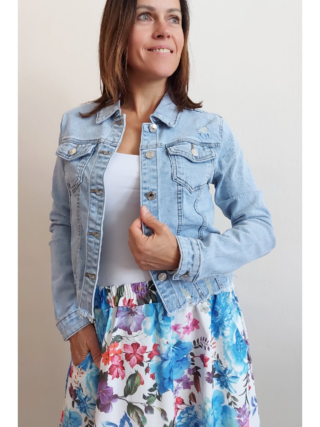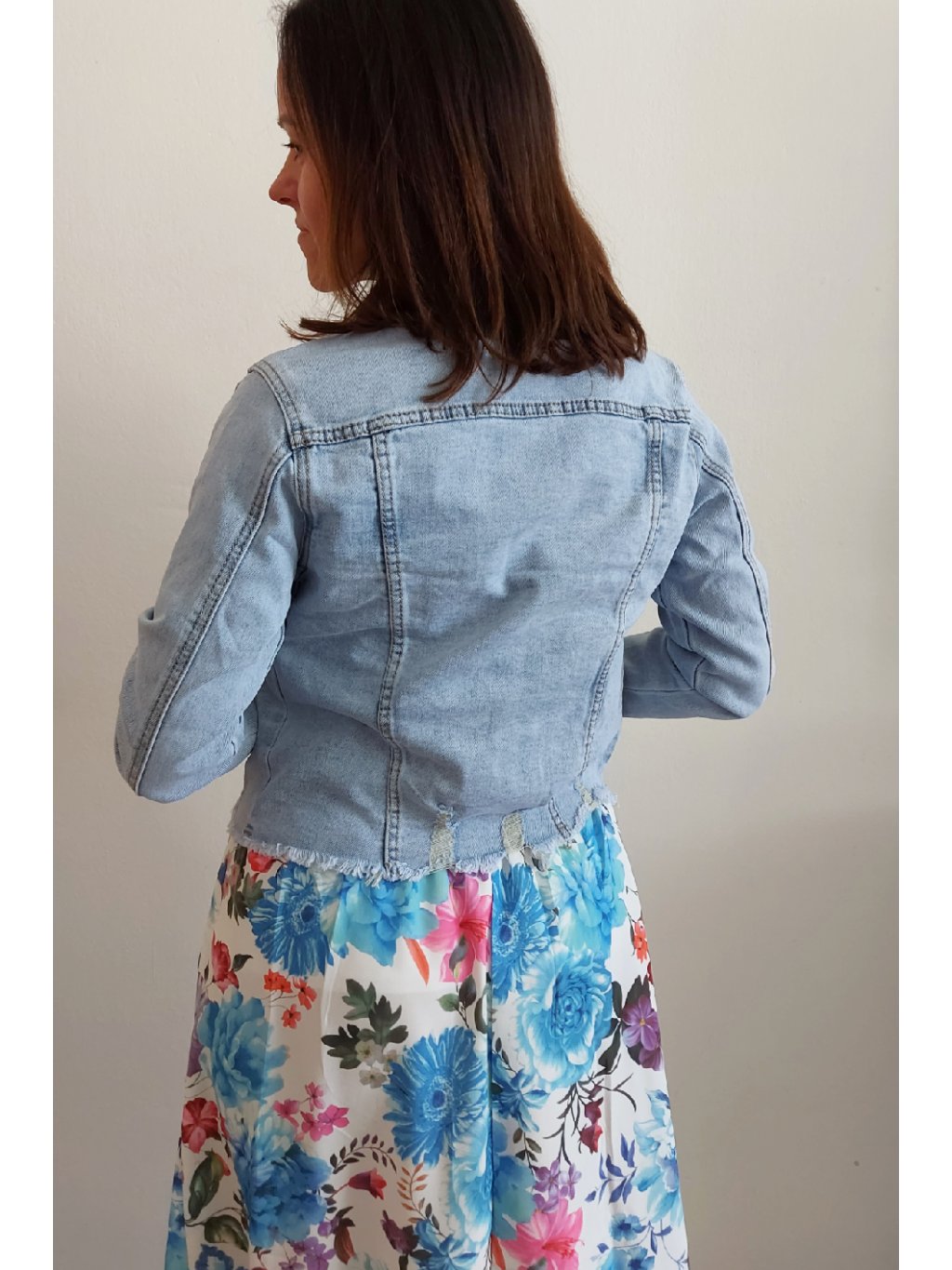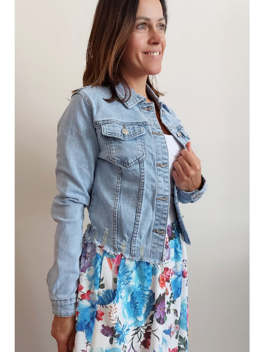 Nádherná džínová bunda ve světlém provedení. Kratší délka, spodní lem je ukončený trháním. Rukávy dlouhé. Místy efektní dření. Top kvalita. Skvěle se hodí k šatům, kalhotám, džínům, sukni. Ideální na jaro/podzim i chladné letní večery. Vel. XS focena na vel. XS.