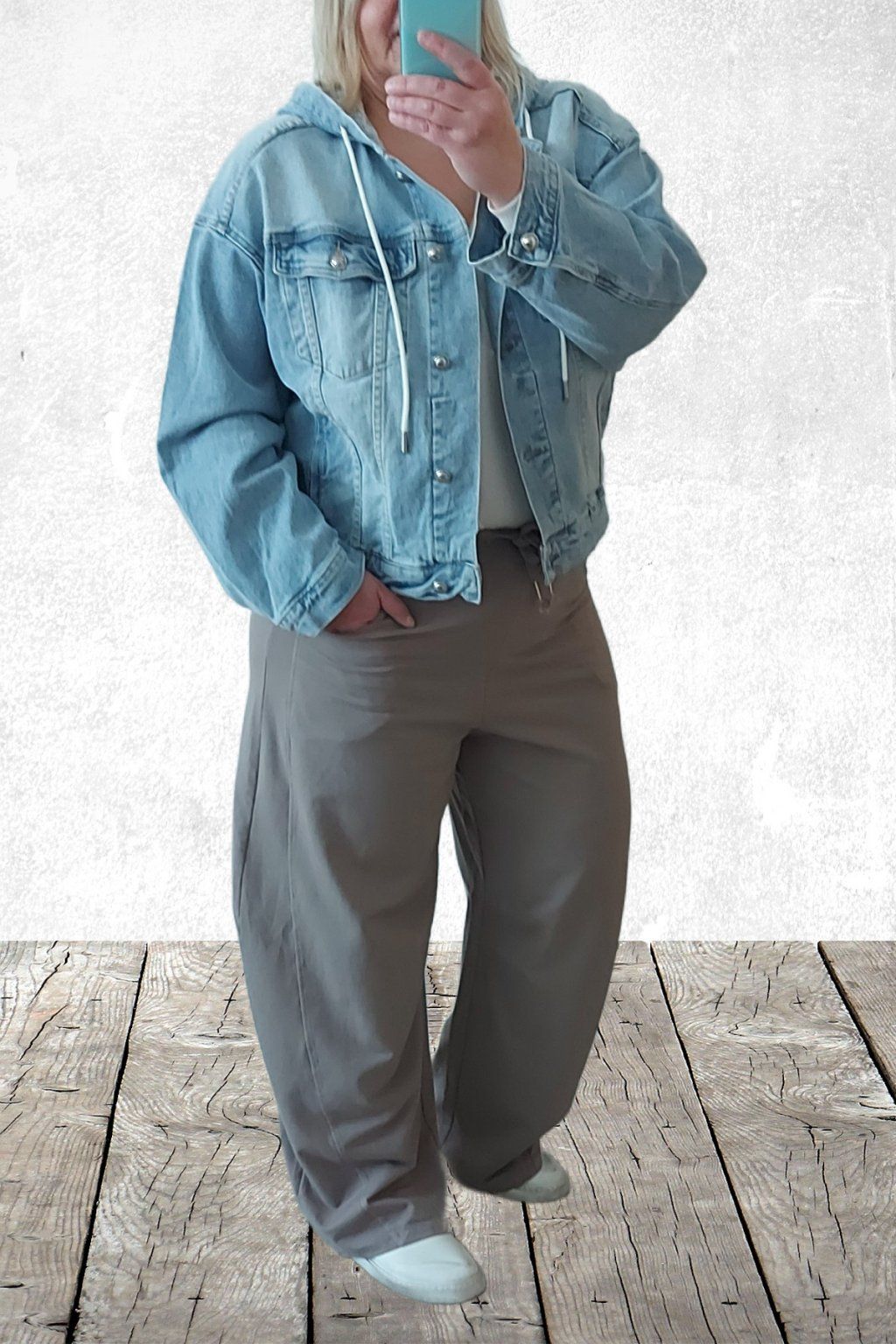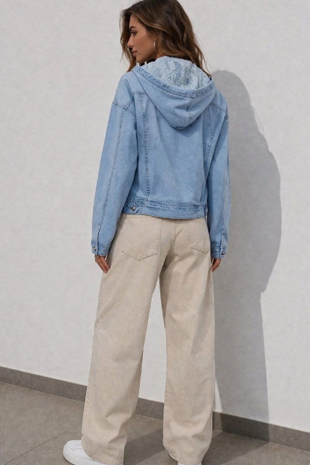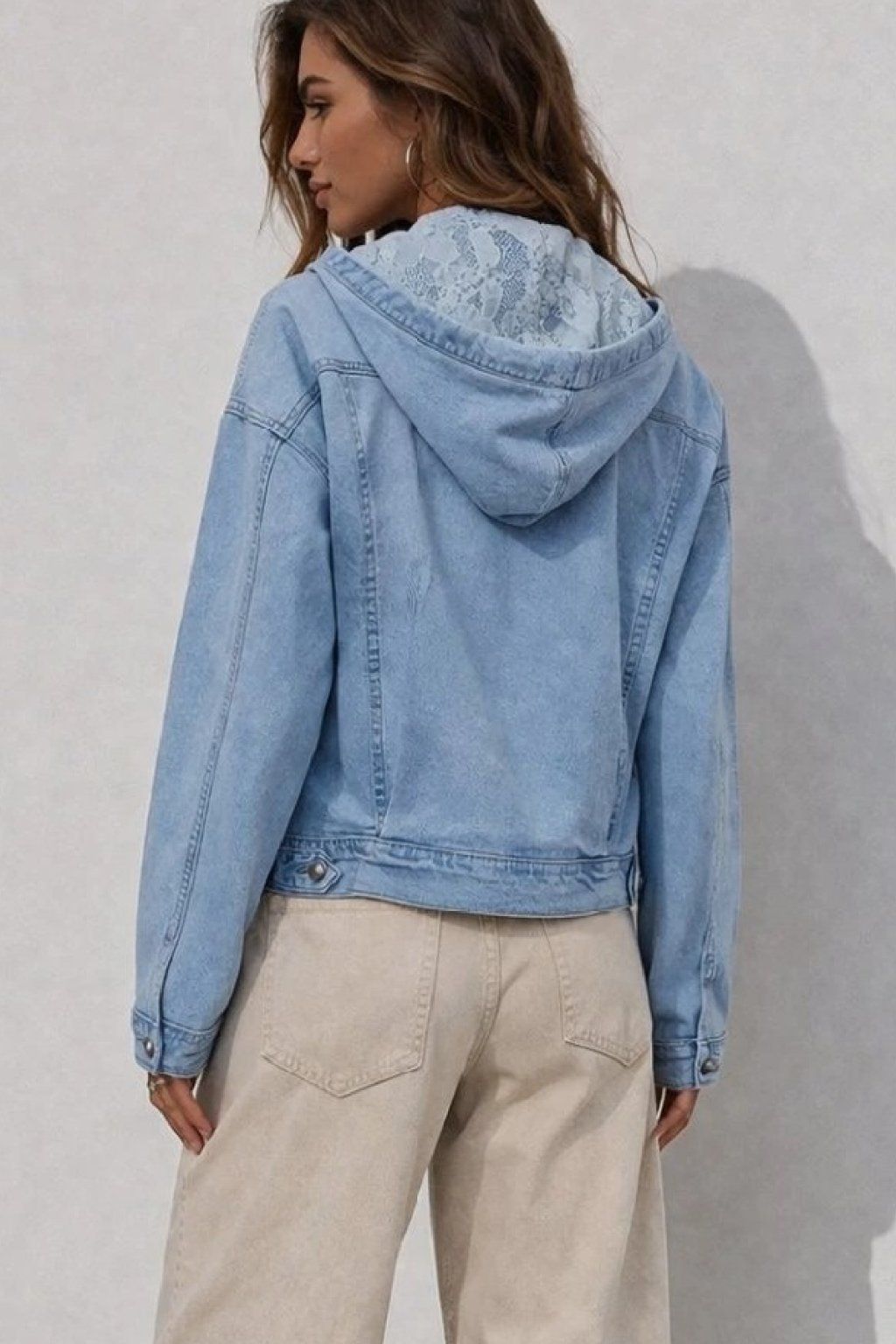Luxusní, vysoce kvalitní džínová bunda s kapucí. Kapuce je uvnitř zdobená krajkovou látkou a má šňůrky pro stažení. Rukávy jsou dlouhé, širší. Přední kapsy. Vzadu má bunda dva výrazné sámky, které ji dodávají efektní vzhled. Lehce oversize střih. Doporučujeme brát o velikost menší než běžně nosíte - bunda je větší. Vel. XL focena a sedí na vel. 2XL (prsa 116cm, pas 104cm, boky 121cm), výška 165cm.