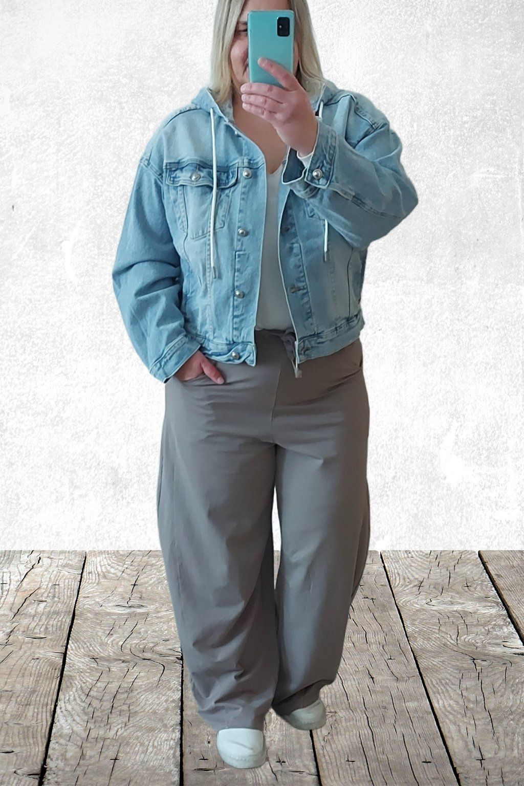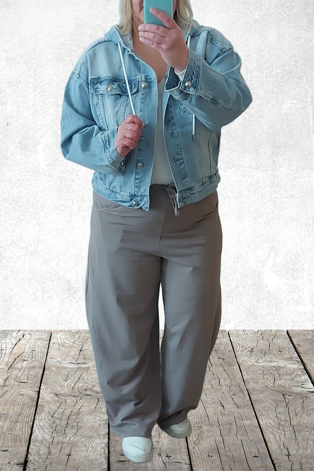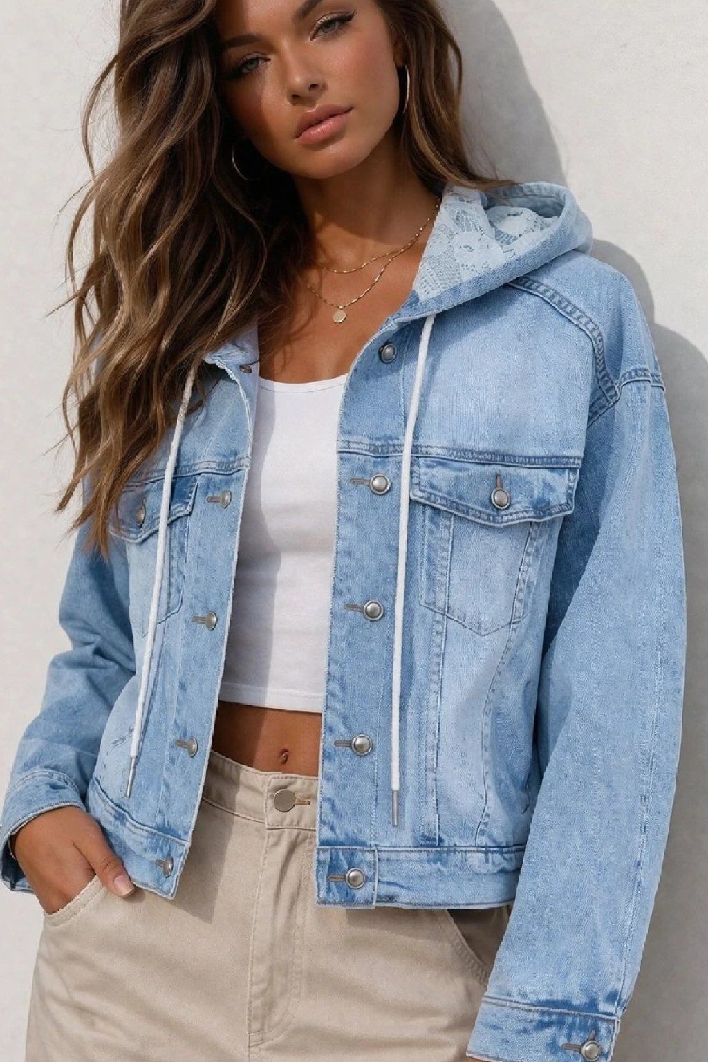 Luxusní, vysoce kvalitní džínová bunda s kapucí. Kapuce je uvnitř zdobená krajkovou látkou a má šňůrky pro stažení. Rukávy jsou dlouhé, širší. Přední kapsy. Vzadu má bunda dva výrazné sámky, které ji dodávají efektní vzhled. Lehce oversize střih. Doporučujeme brát o velikost menší než běžně nosíte - bunda je větší. Vel. XL focena a sedí na vel. 2XL (prsa 116cm, pas 104cm, boky 121cm), výška 165cm.