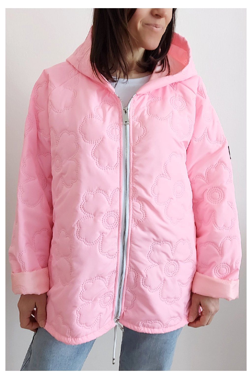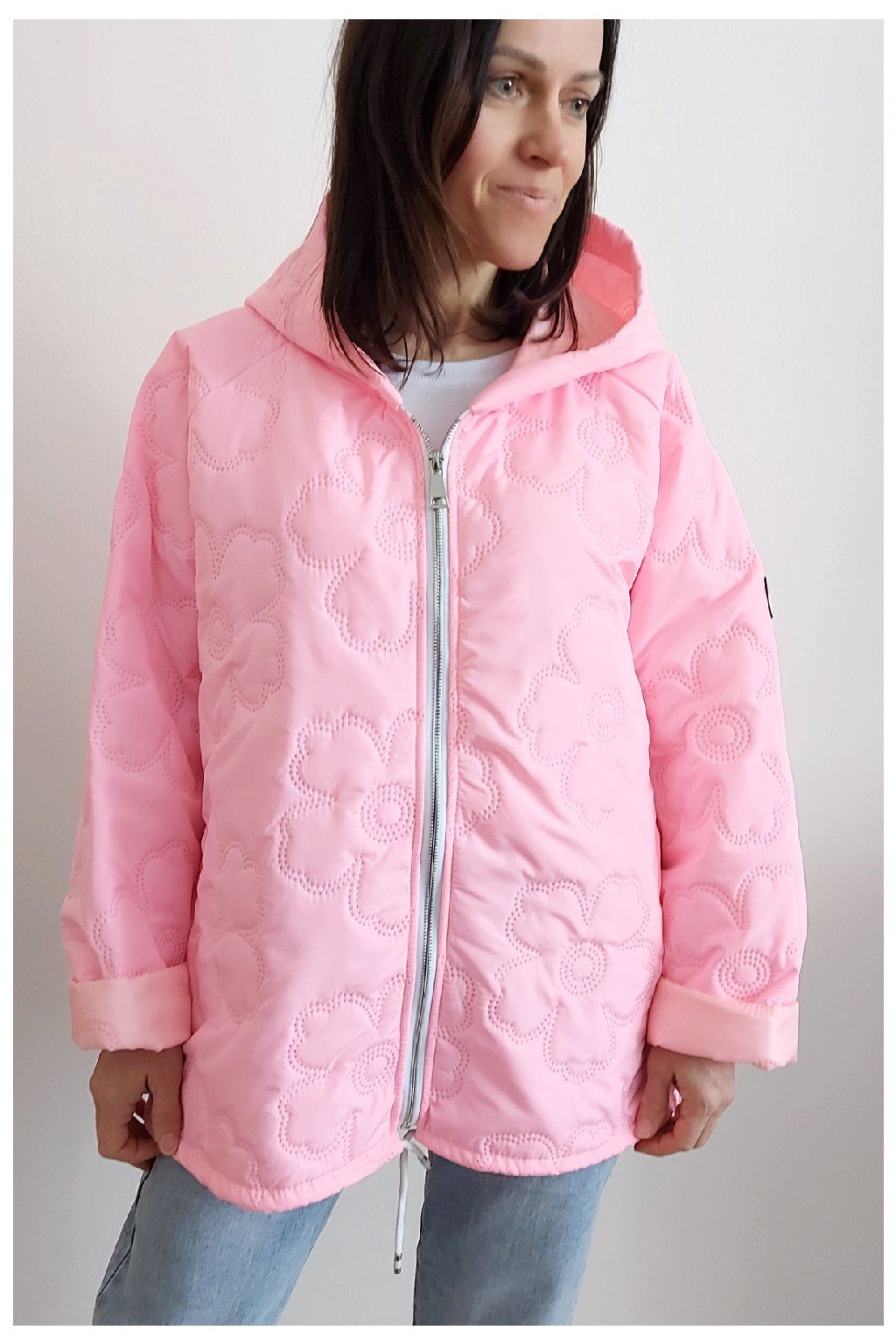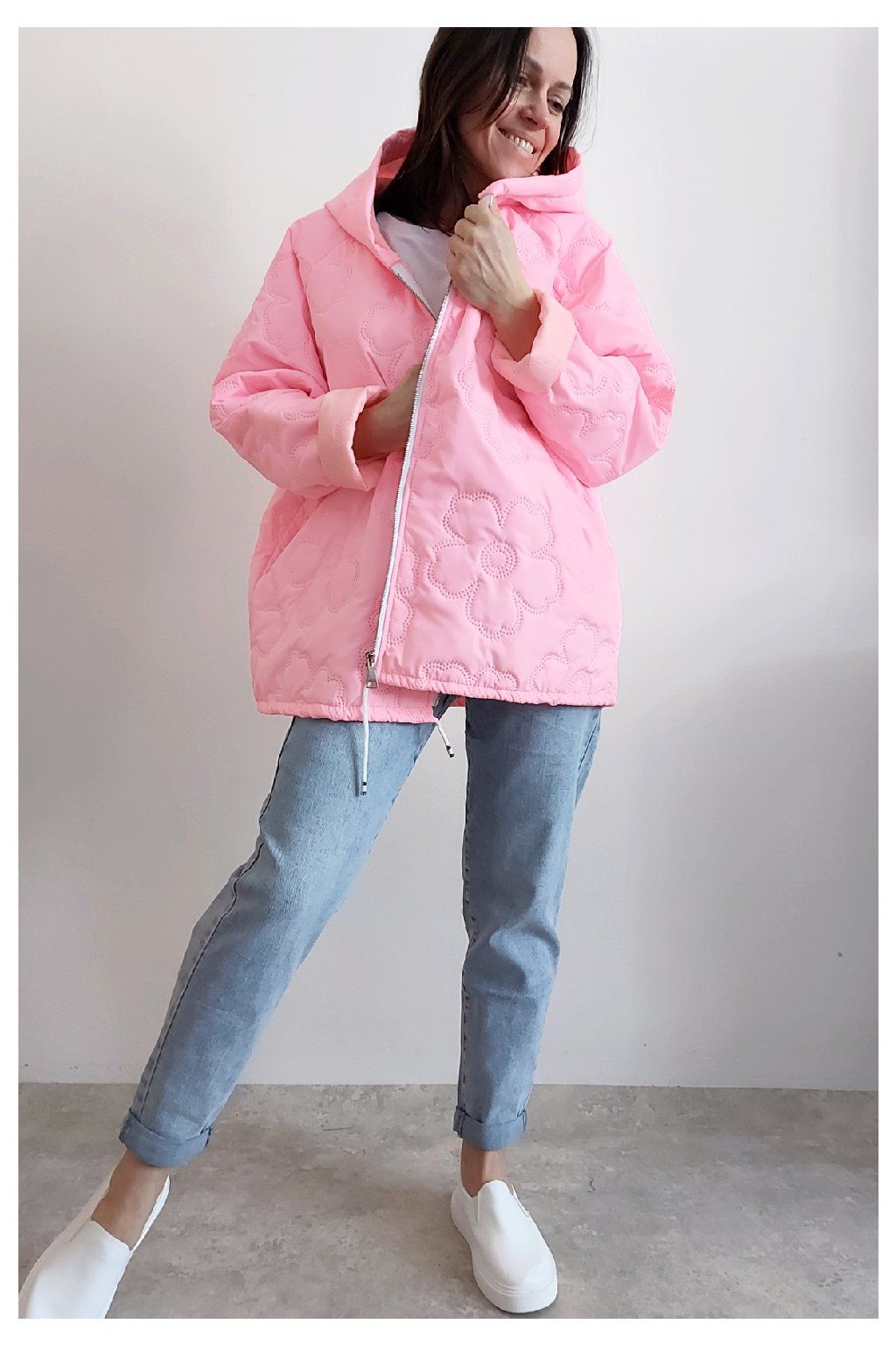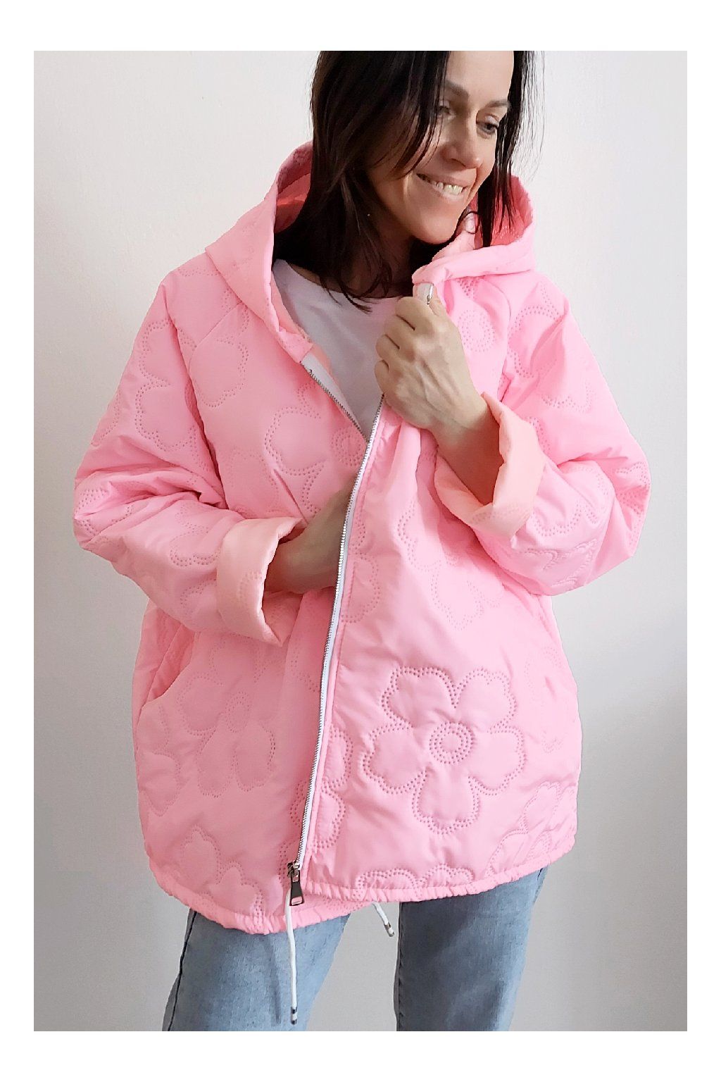 Jarní bunda s kapucí oversize střihu světle růžová