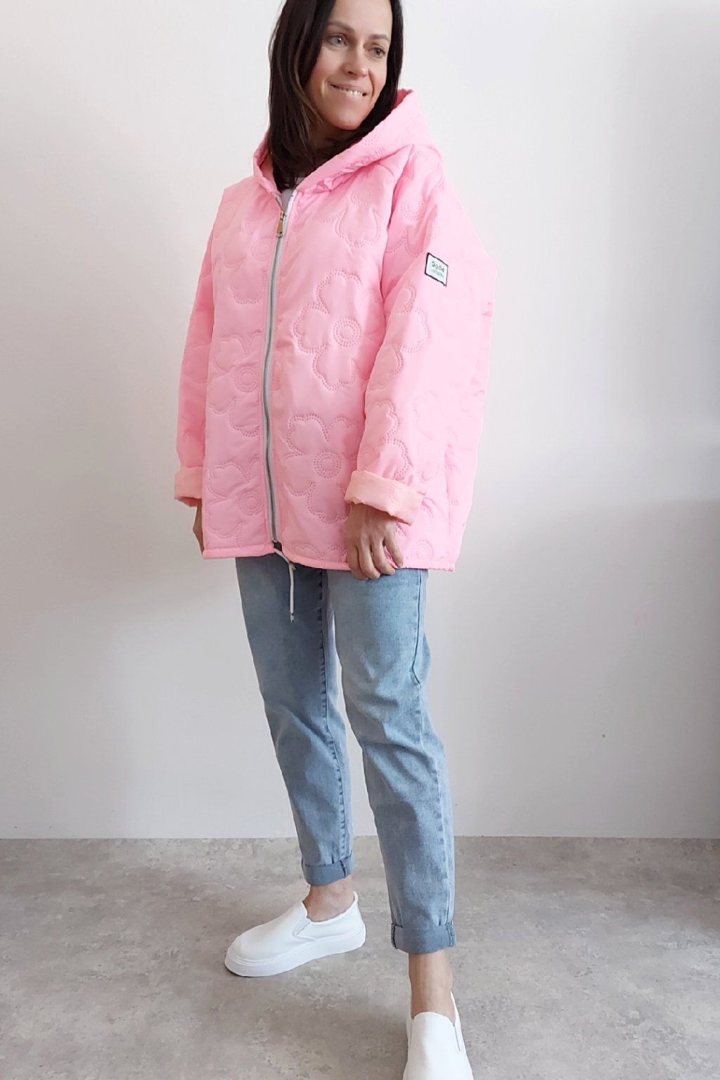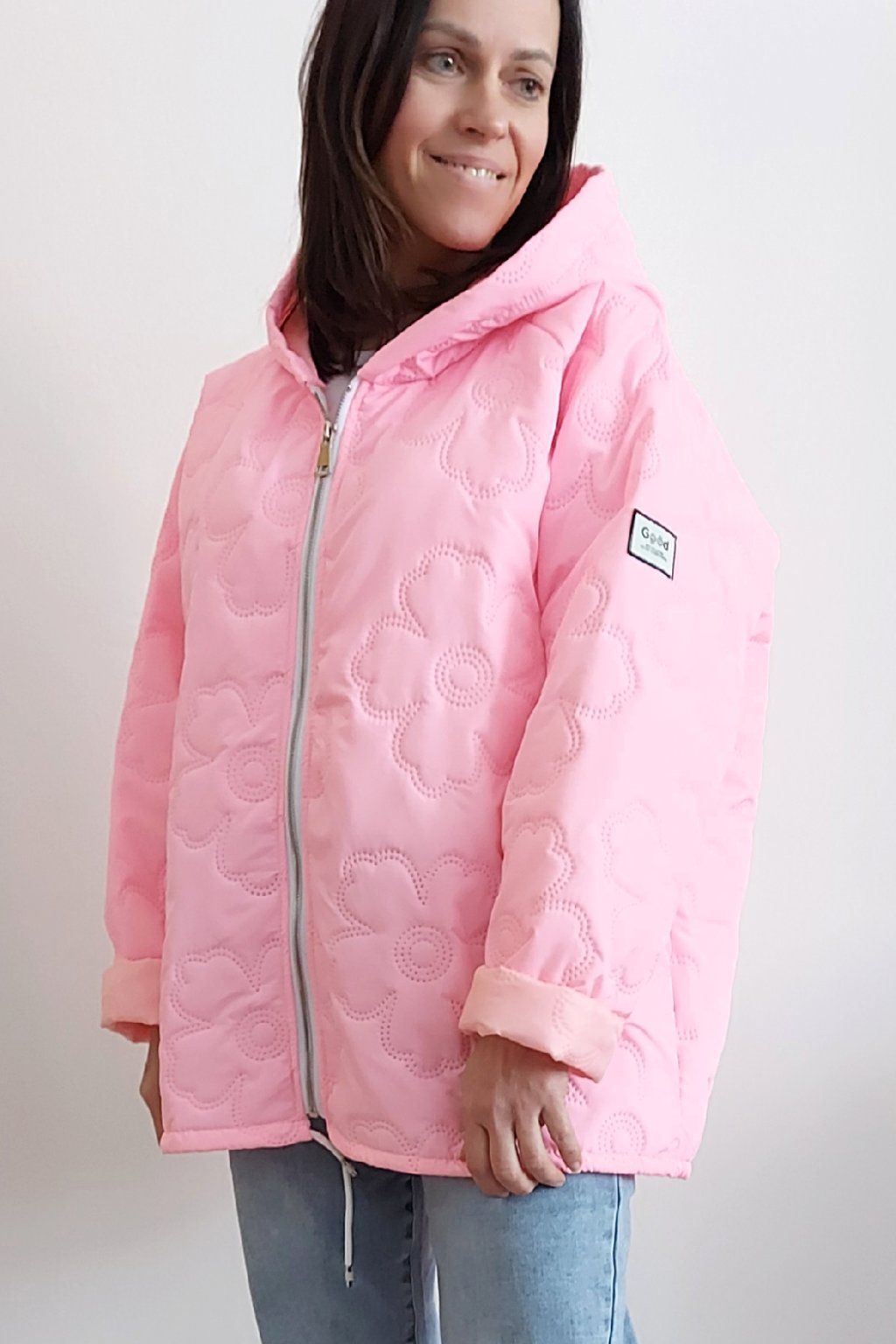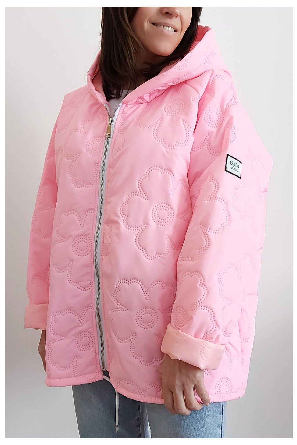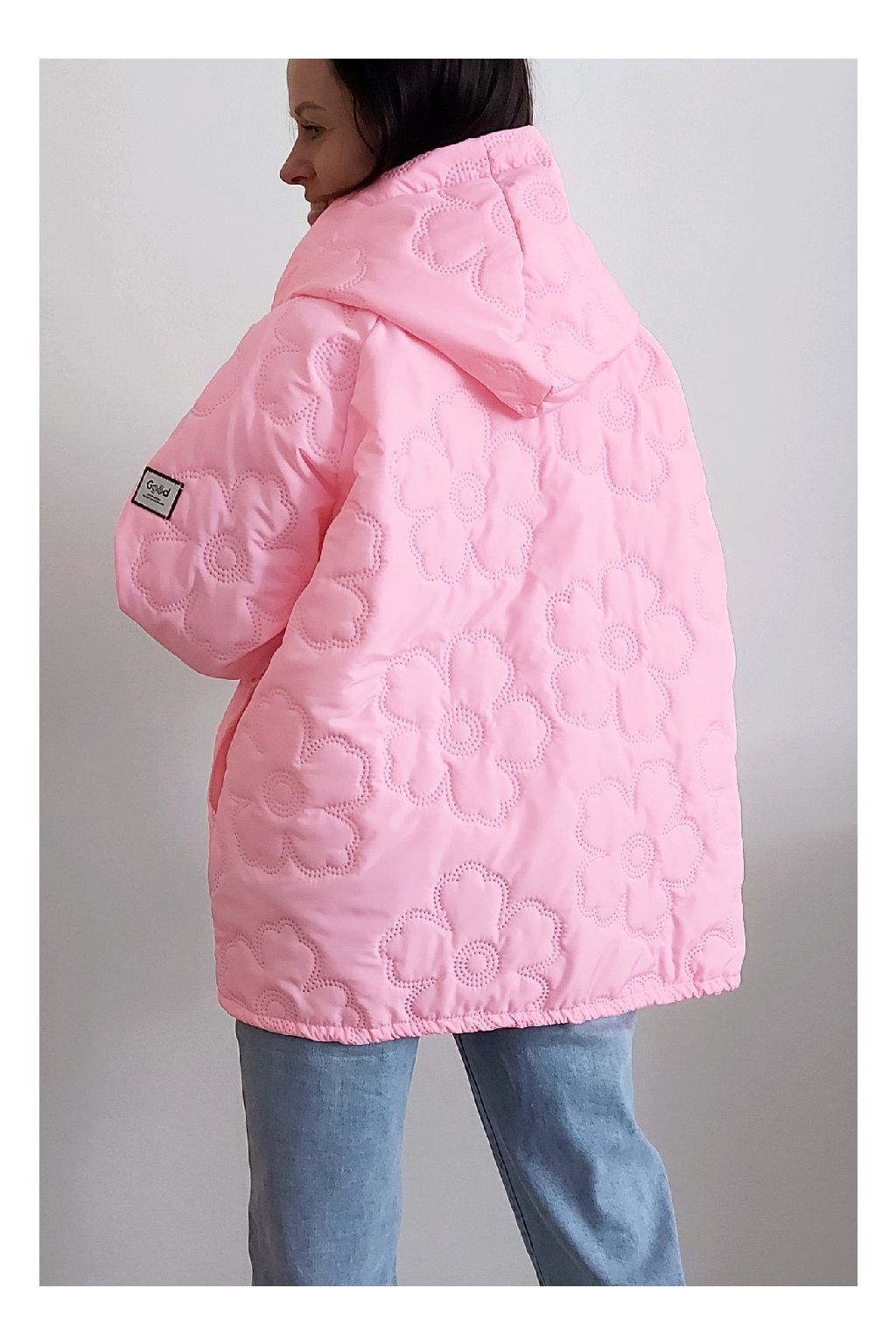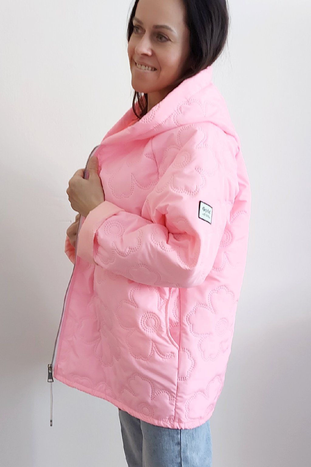 Jarní bunda s kapucí oversize střihu světle růžová