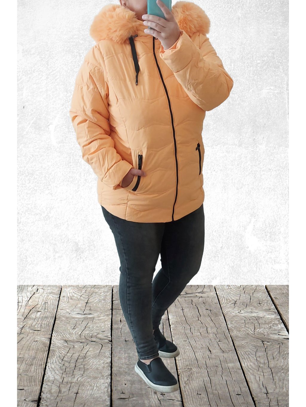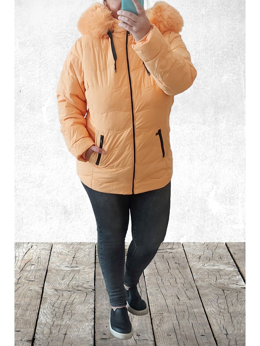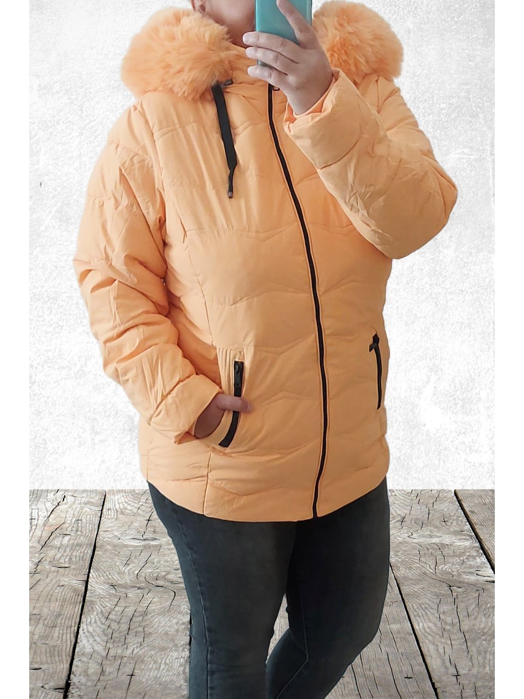 Zimní bunda v kratším provedení v nádherné meruňkové barvě. Má kapuci, kterou lze odepnout zipem a na ní je kožešinka, kterou lze také sundat, je na knoflíky. Přední kapsy, u nich je ozdobný zip. Rukávy jsou dlouhé, ukončené všitým úpletem. Bunda je podšitá a má vatovou výplň. Velikosti jsou o číslo až dvě menší, proto doporučujeme brát velikost větší než běžně nosíte. Vel. S focena na vel. XS výška 156cm a vel. 4XL focena na vel. 2XL (prsa 116cm, boky 119cm), výška 165cm.