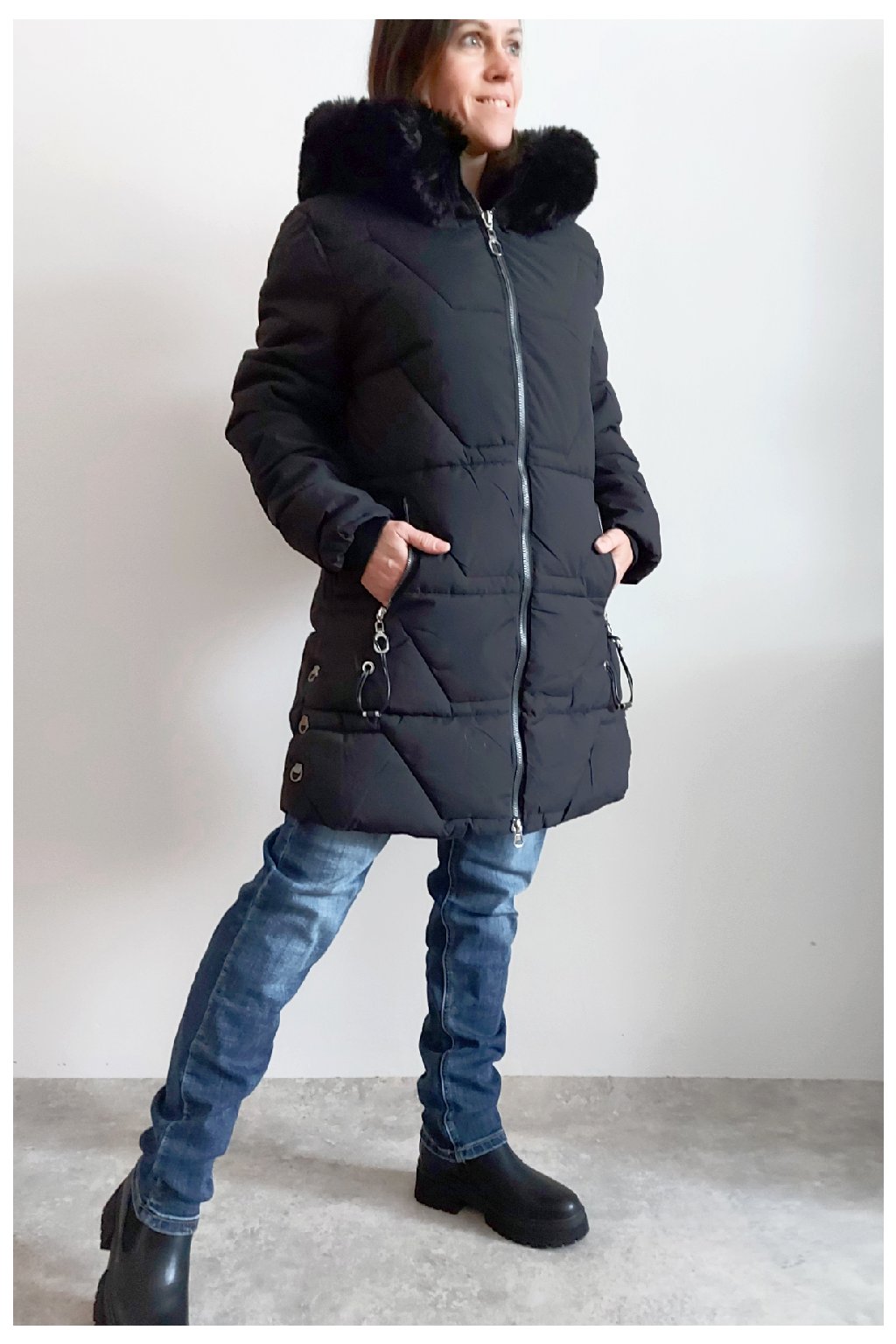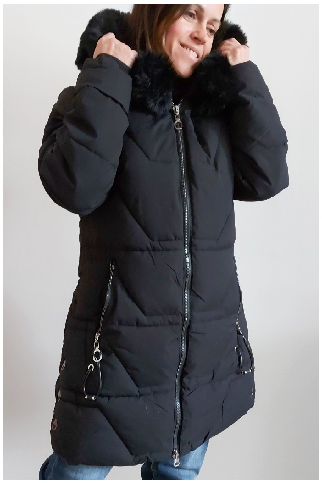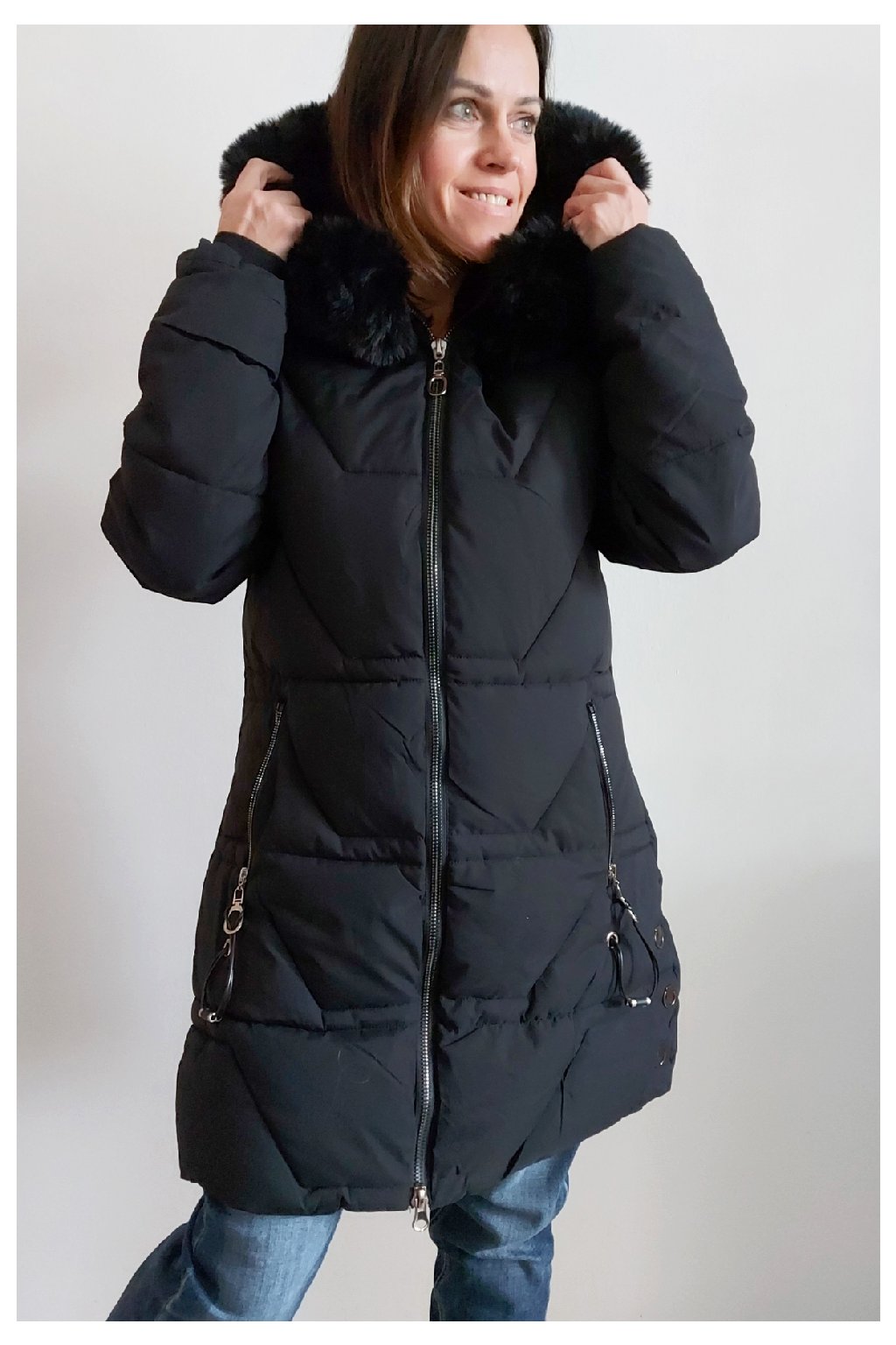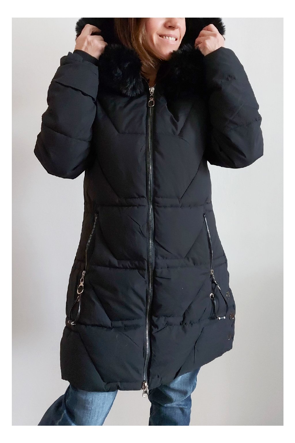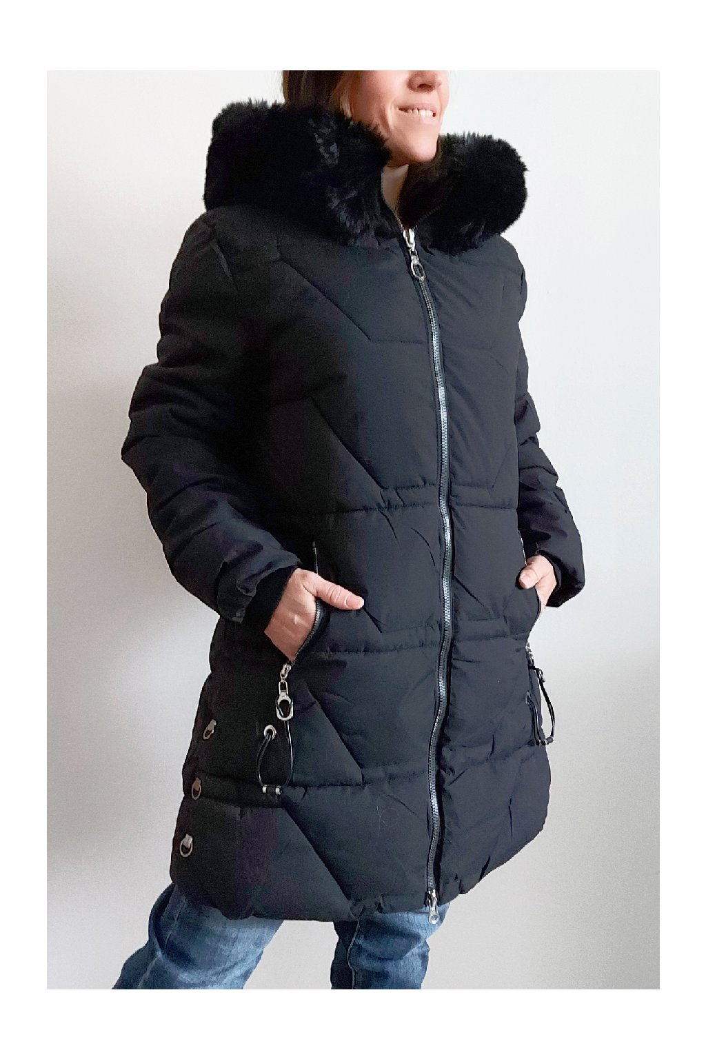 Zimní prošívaná bunda s kapucí. Kapuce nelze odepnout. Na ní je kožešinka, ta je na knoflíky a lze ji sundat. Zapínání na zip. Přední kapsy jsou také uzaviratelné zipem. Po bocích, ve spodní části, jsou ozdobné spony. V rukávech jsou všité úplety - vítr nemá šanci. Bunda máš podšívku. Materiál silný, hodně teploučký. Pozor - velikosti neodpovídají, jsou menší, řiďte se mírami (sedí na vel. M až 3XL). Vel. 3XL focena na vel. XS, výška 156cm a vel. 6XL focena na vel. 2XL (prsa 116cm, boky 120cm), výška 165cm.