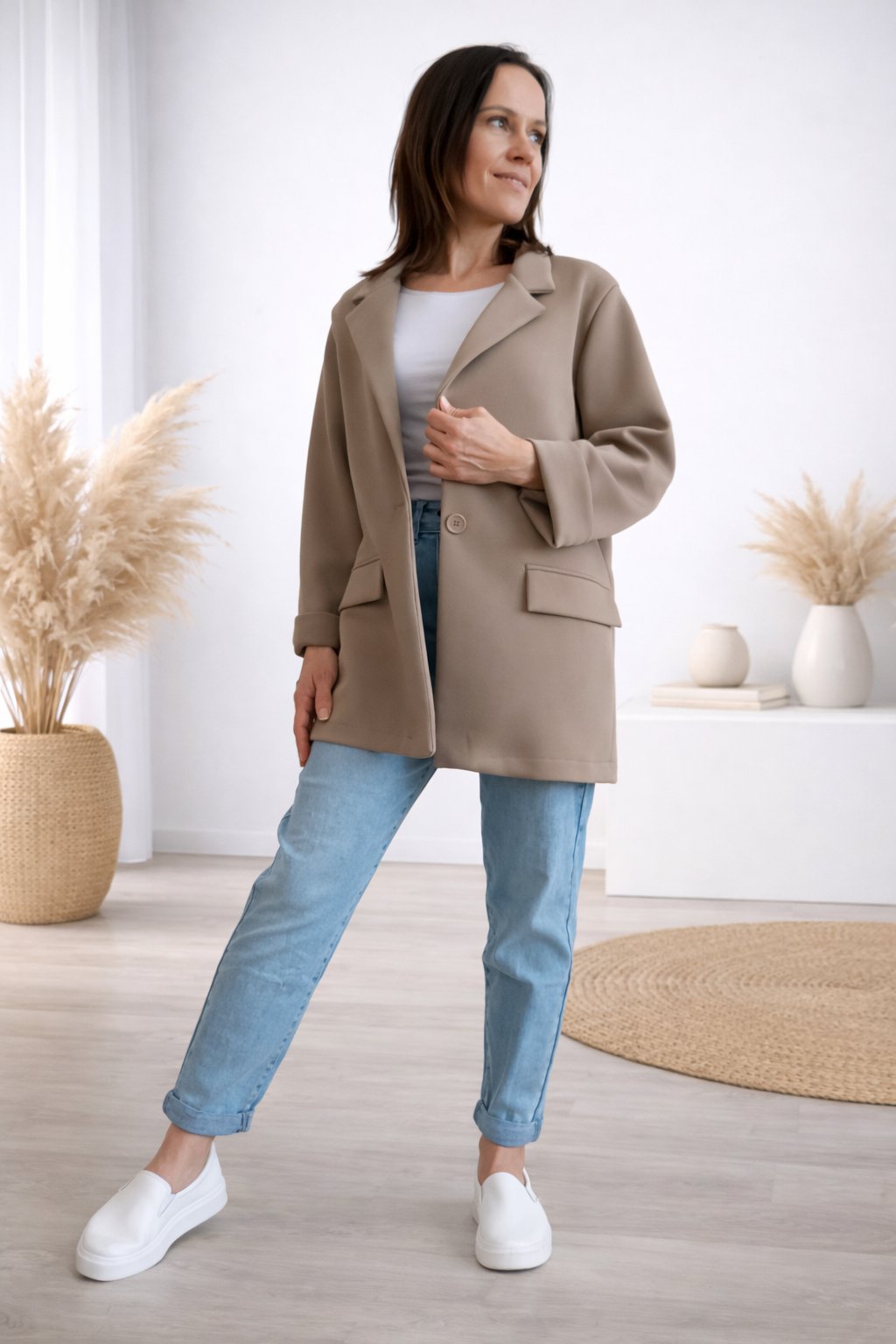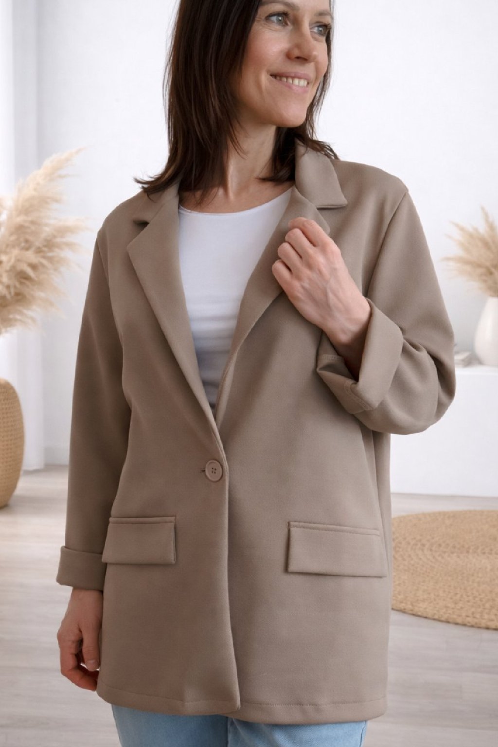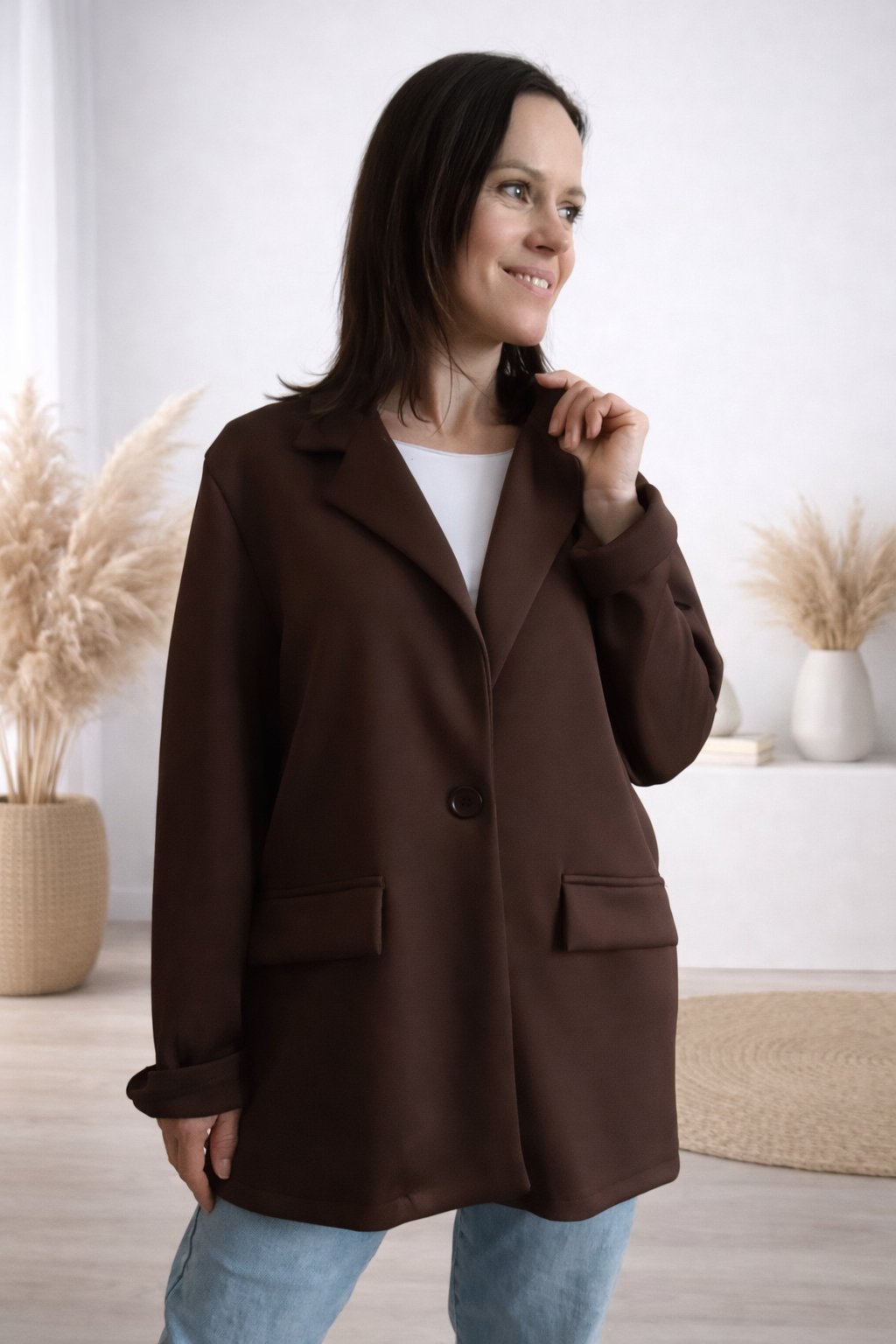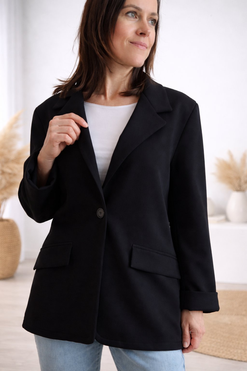Módní sáčko z příjemného materiálu. Zapínání na jeden knoflík. Rukávy dlouhé. Sako je bez kapes, vpředu jen imitace klop kapes. Bez podšívky. Materiál pružný. Foceno na vel. XS, výška 156cm, ale sedne i na vel. 2XL (prsa 116, pas 110cm, boky 120cm), výška 165cm.