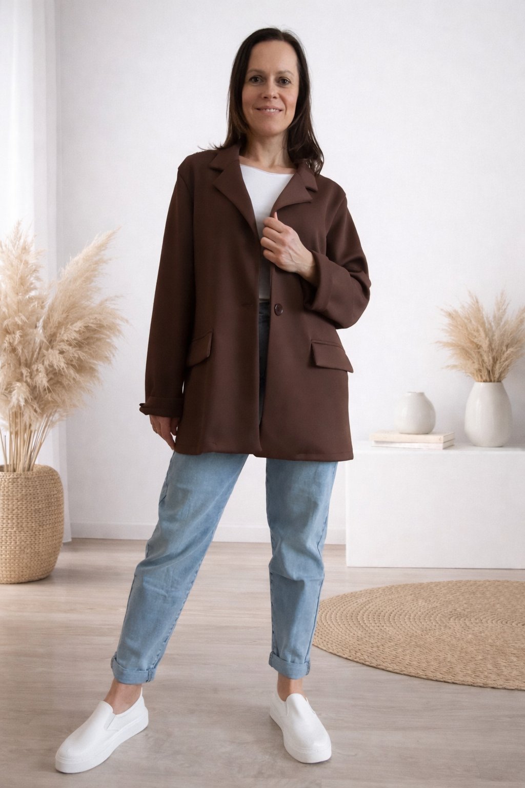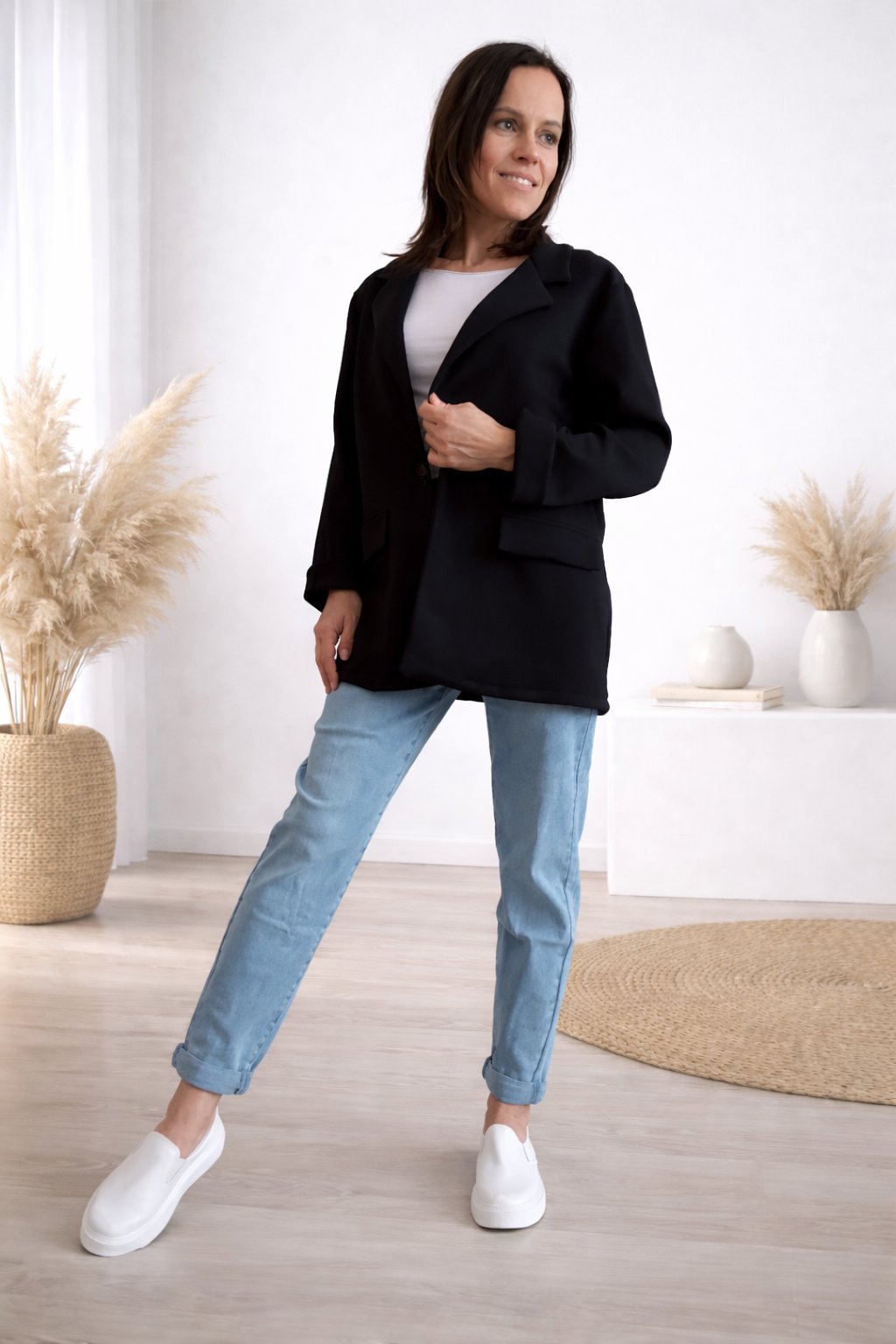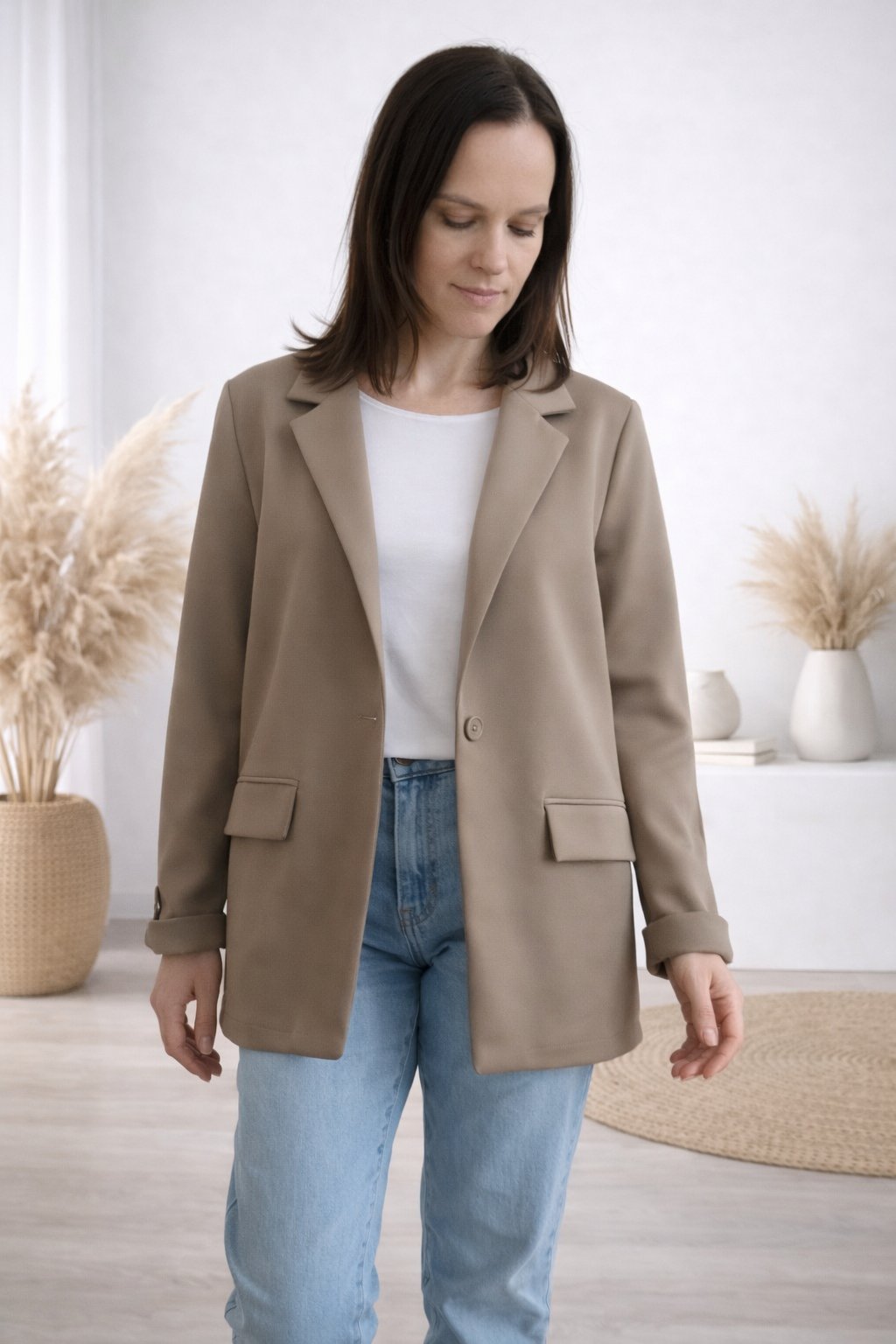 Módní sáčko z příjemného materiálu. Zapínání na jeden knoflík. Rukávy dlouhé. Sako je bez kapes, vpředu jen imitace klop kapes. Bez podšívky. Materiál pružný. Foceno na vel. XS, výška 156cm, ale sedne i na vel. 2XL (prsa 116, pas 110cm, boky 120cm), výška 165cm.