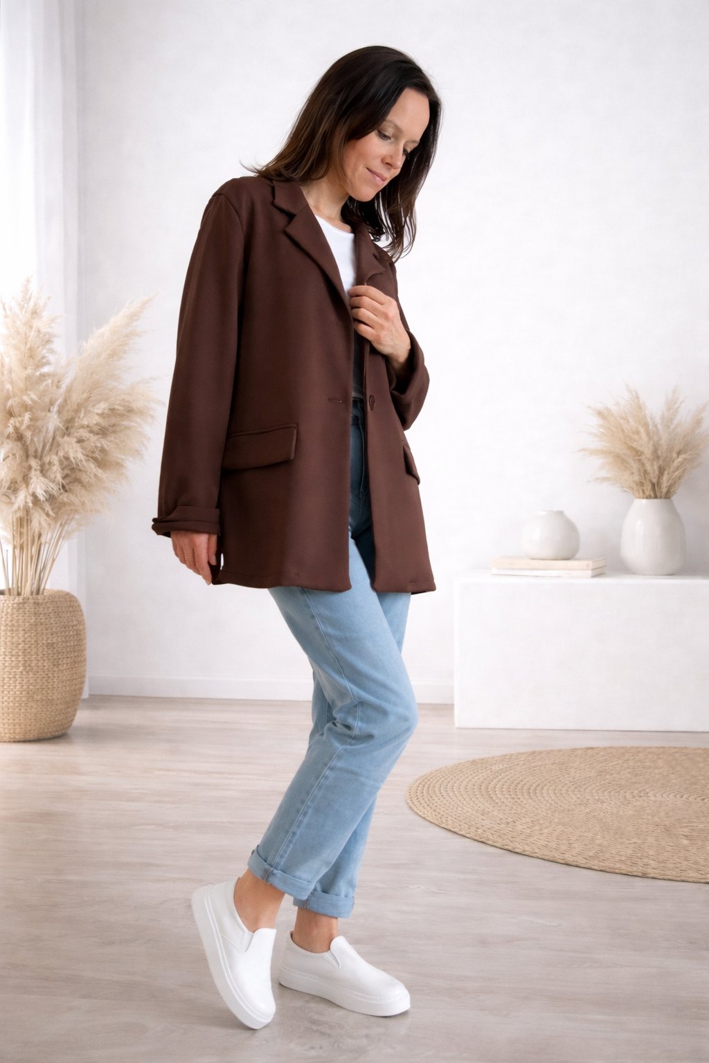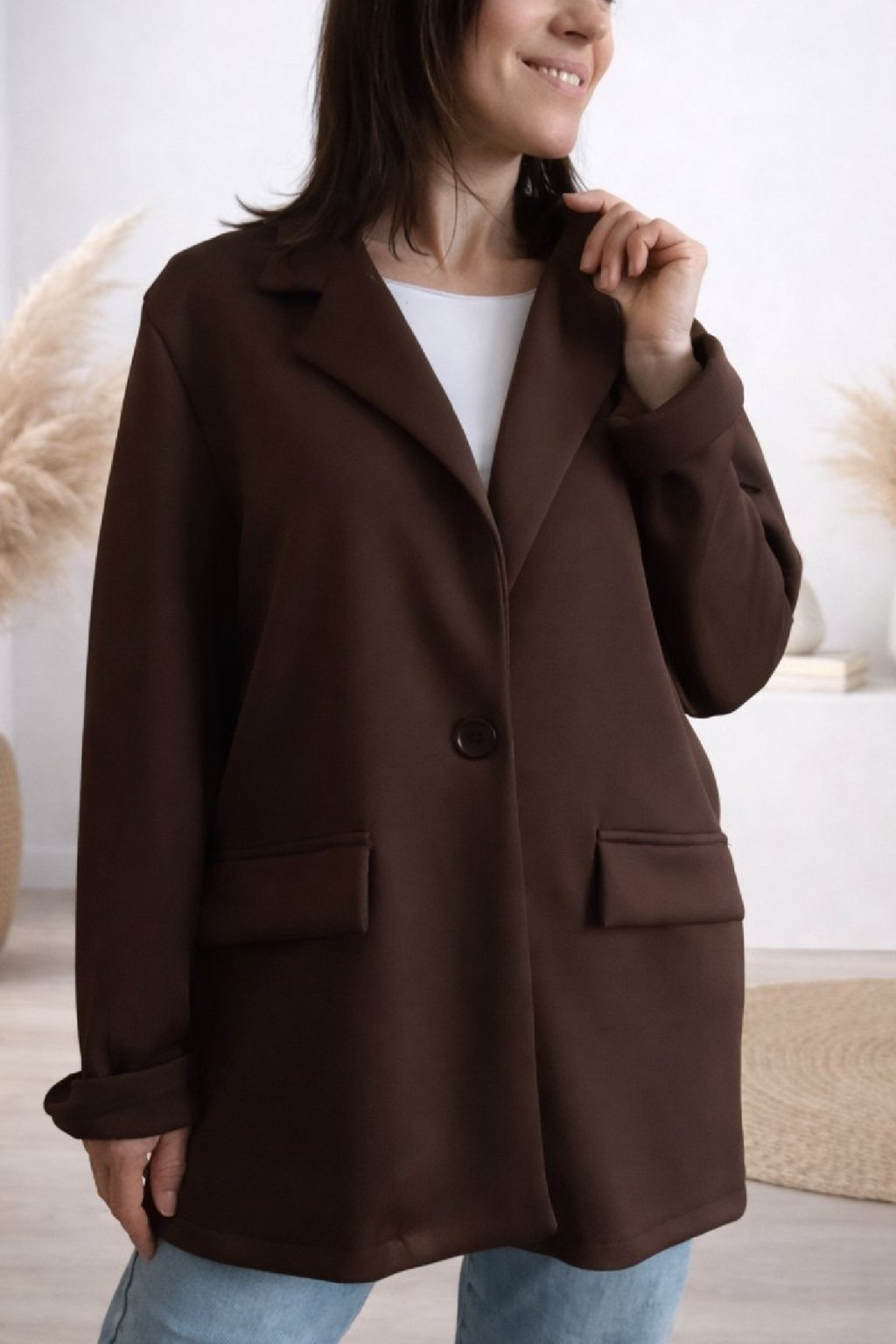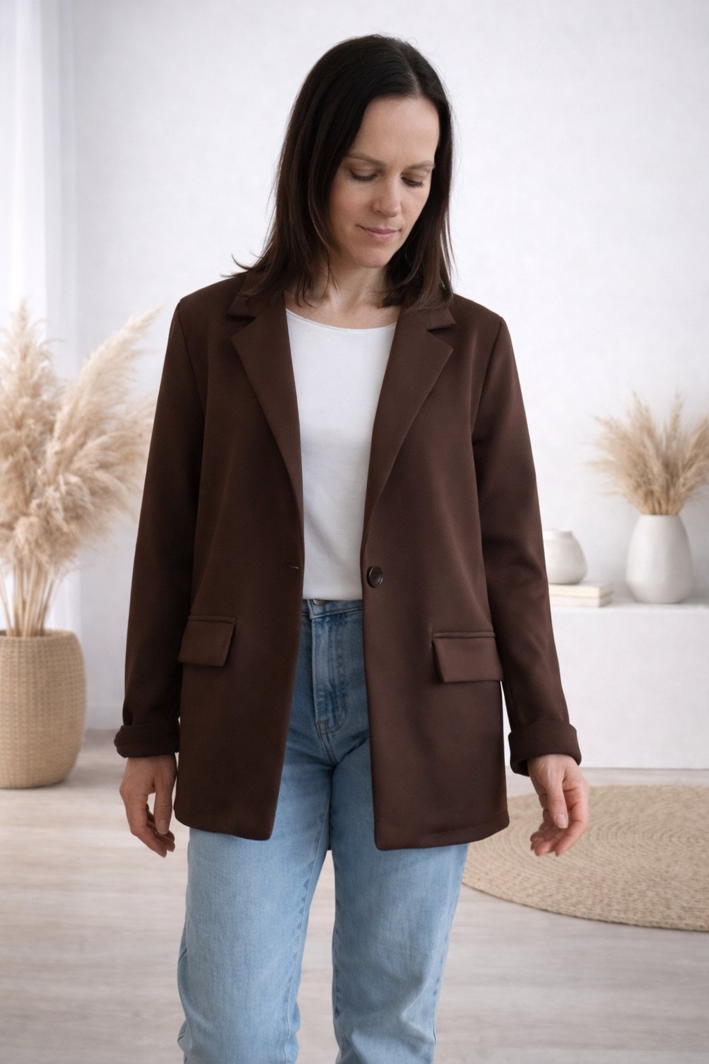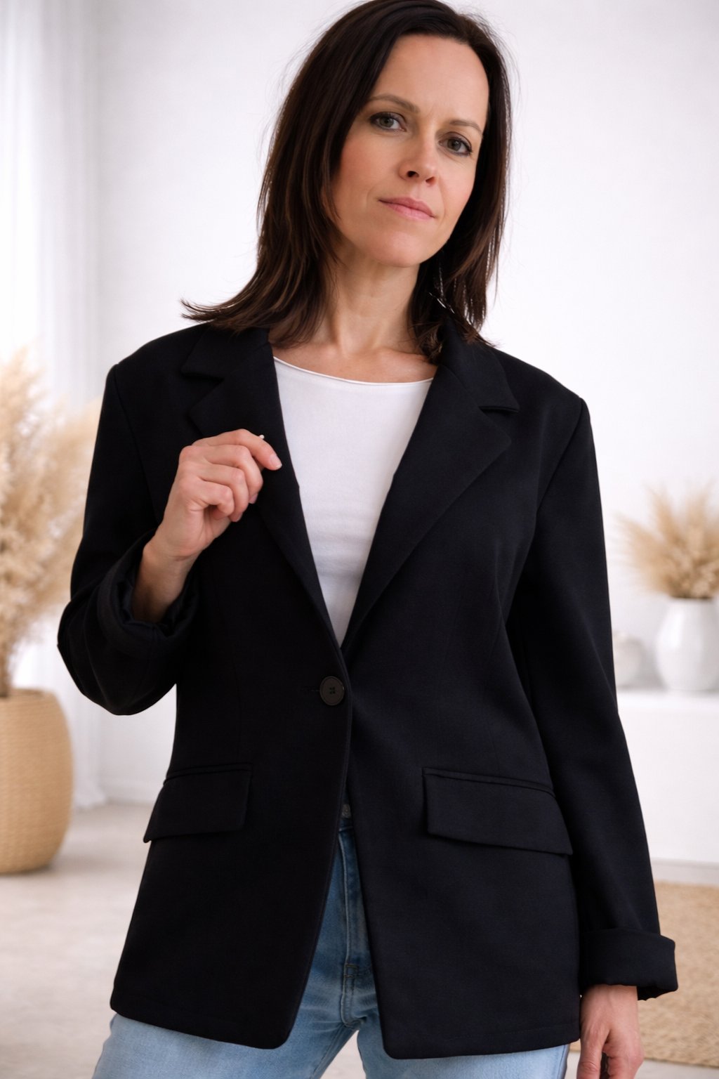 Módní sáčko z příjemného materiálu. Zapínání na jeden knoflík. Rukávy dlouhé. Sako je bez kapes, vpředu jen imitace klop kapes. Bez podšívky. Materiál pružný. Foceno na vel. XS, výška 156cm, ale sedne i na vel. 2XL (prsa 116, pas 110cm, boky 120cm), výška 165cm.