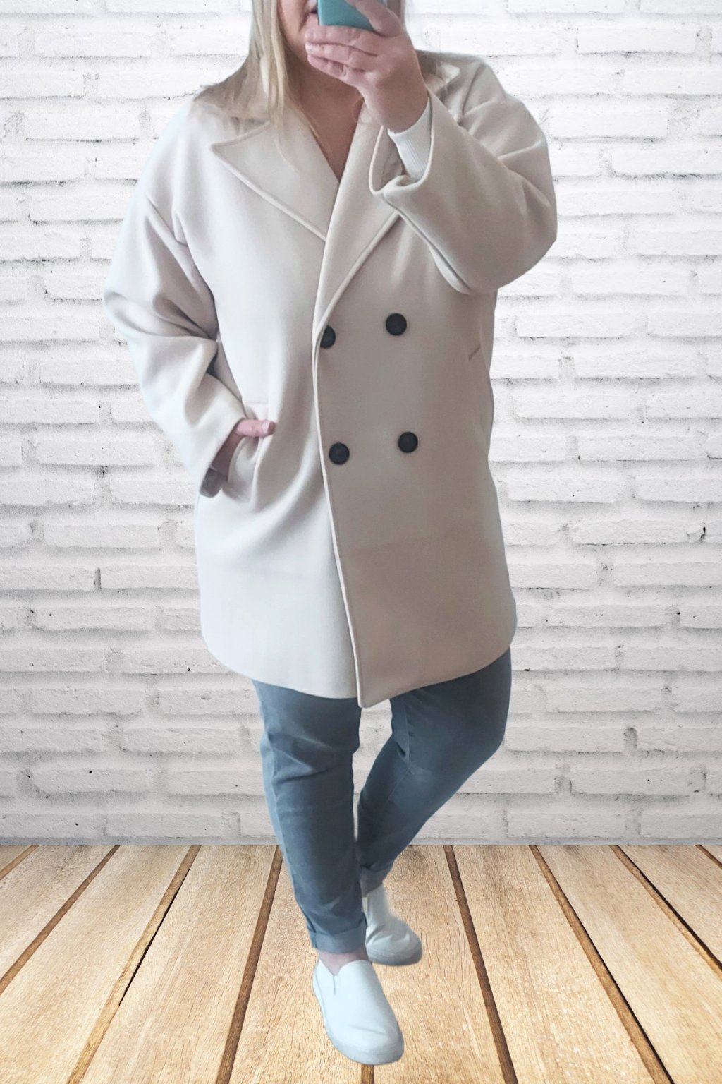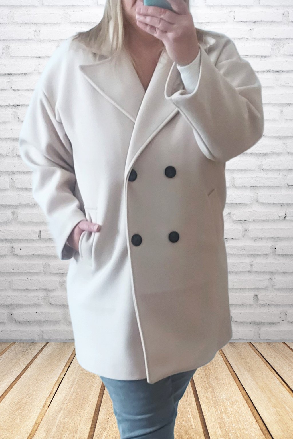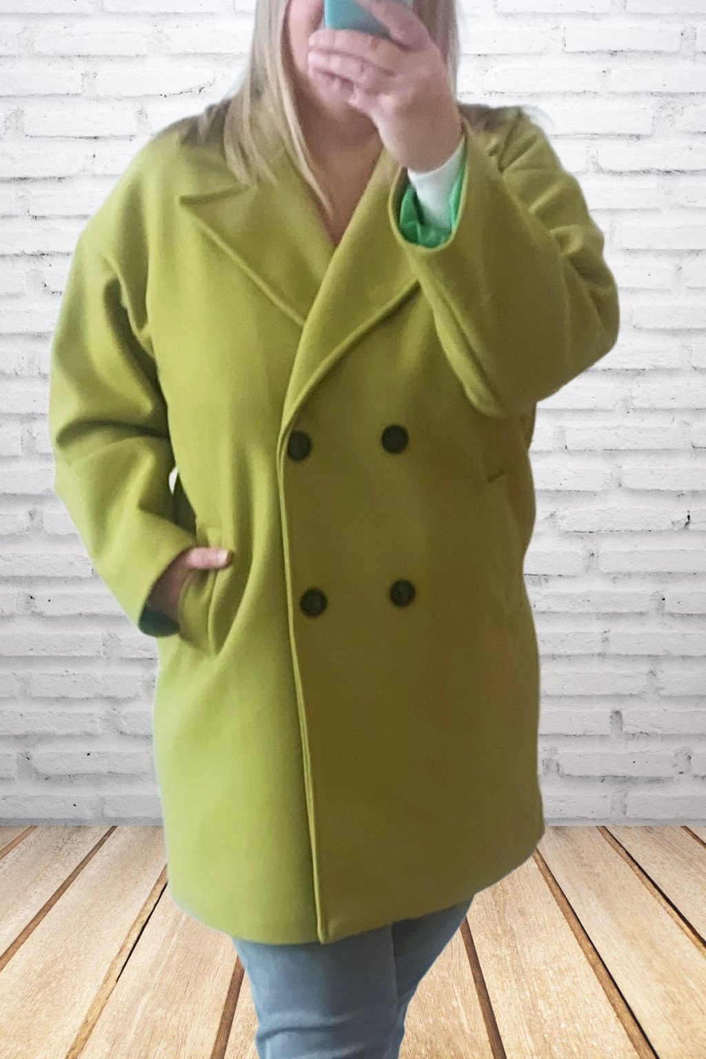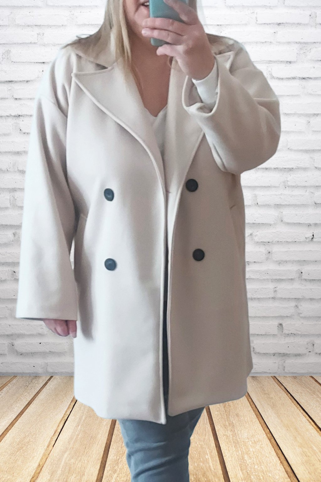 Módní kabát prémiové kvality. Dvouřadé knoflíky, přední kapsy. Kabát má podšívku. Rukávy dlouhé. Oversize - rovný střih. Prvotřídní materiál. Foceno i na vel. 2XL (prsa 116cm, boky 120cm), výška 165cm.
