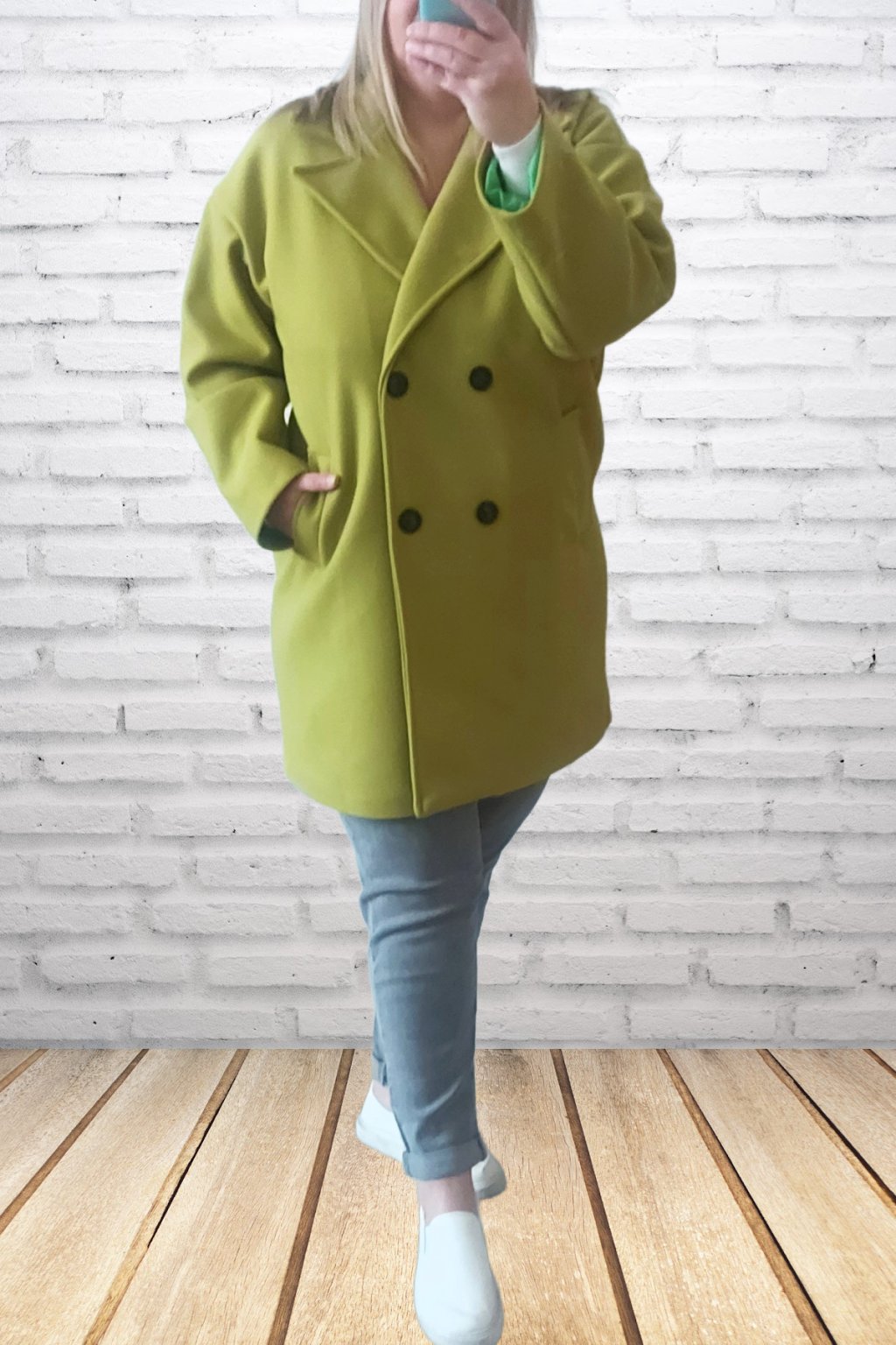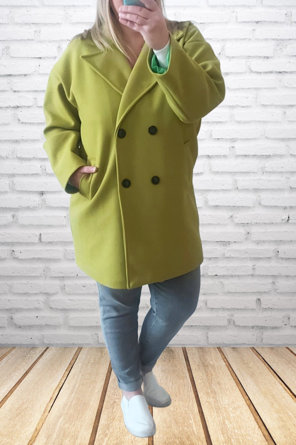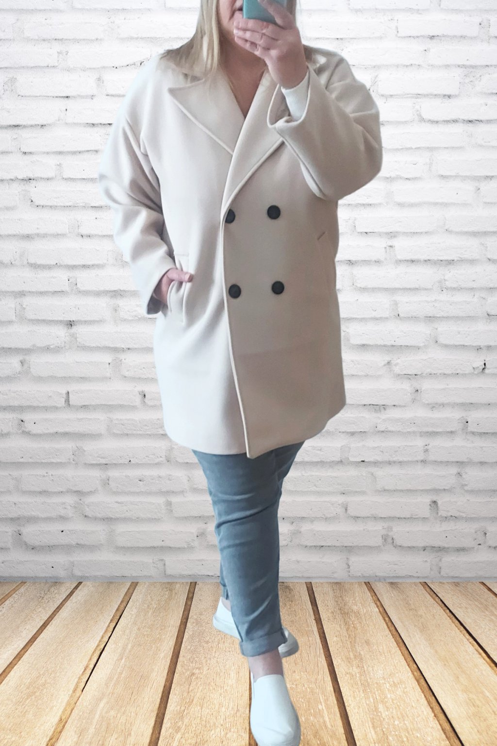 Módní kabát prémiové kvality. Dvouřadé knoflíky, přední kapsy. Kabát má podšívku. Rukávy dlouhé. Oversize - rovný střih. Prvotřídní materiál. Foceno i na vel. 2XL (prsa 116cm, boky 120cm), výška 165cm.