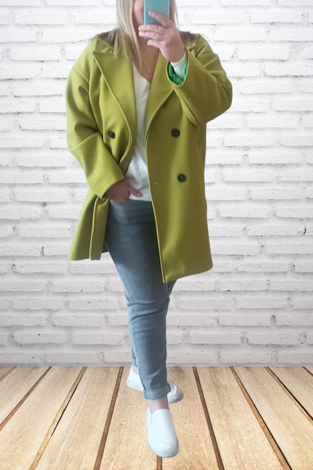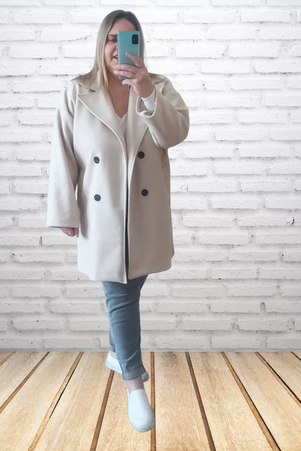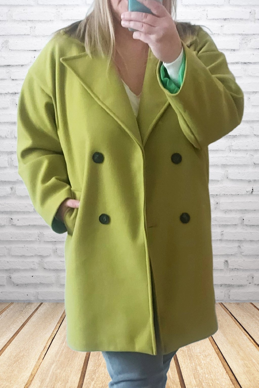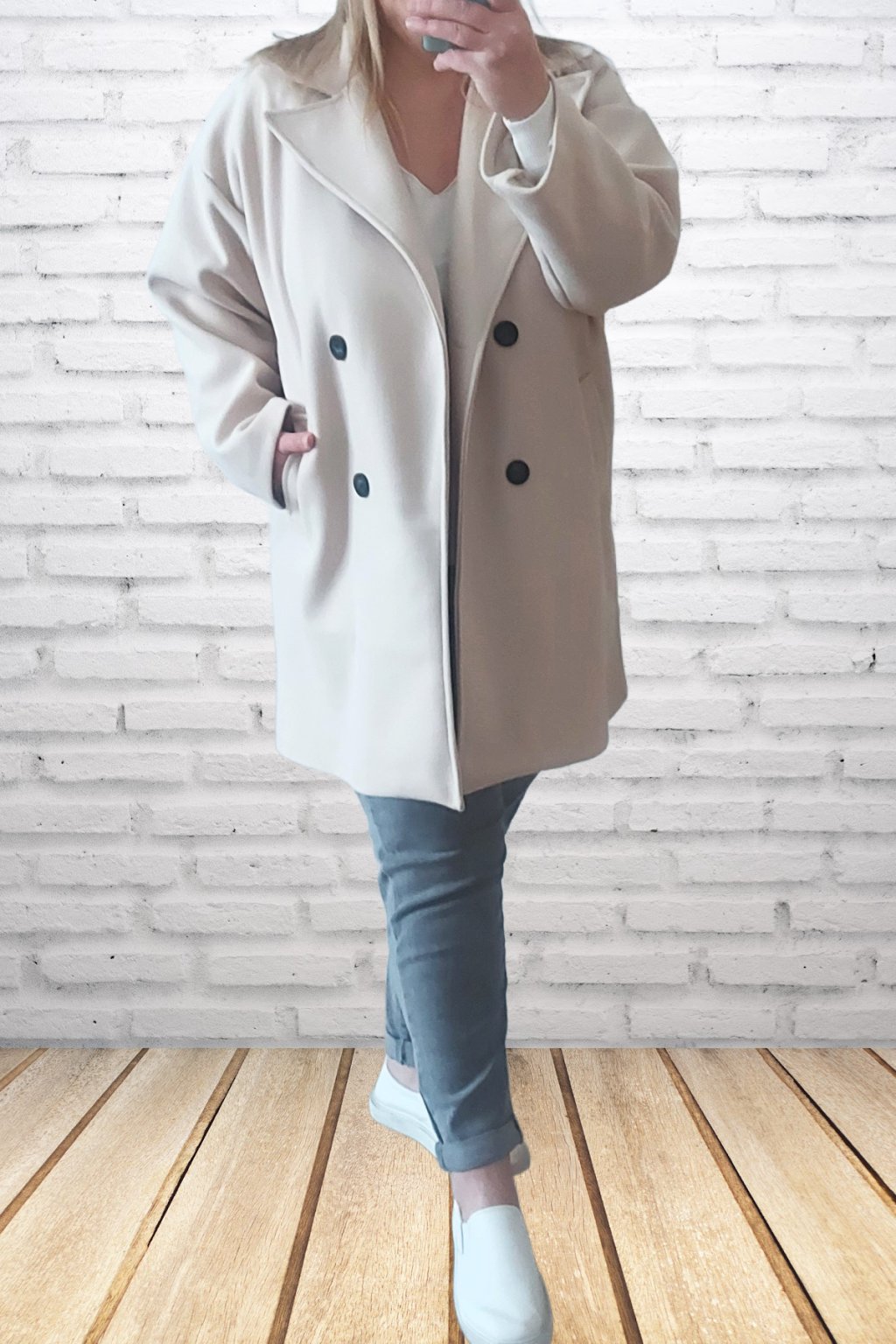 Módní kabát prémiové kvality. Dvouřadé knoflíky, přední kapsy. Kabát má podšívku. Rukávy dlouhé. Oversize - rovný střih. Prvotřídní materiál. Foceno i na vel. 2XL (prsa 116cm, boky 120cm), výška 165cm.