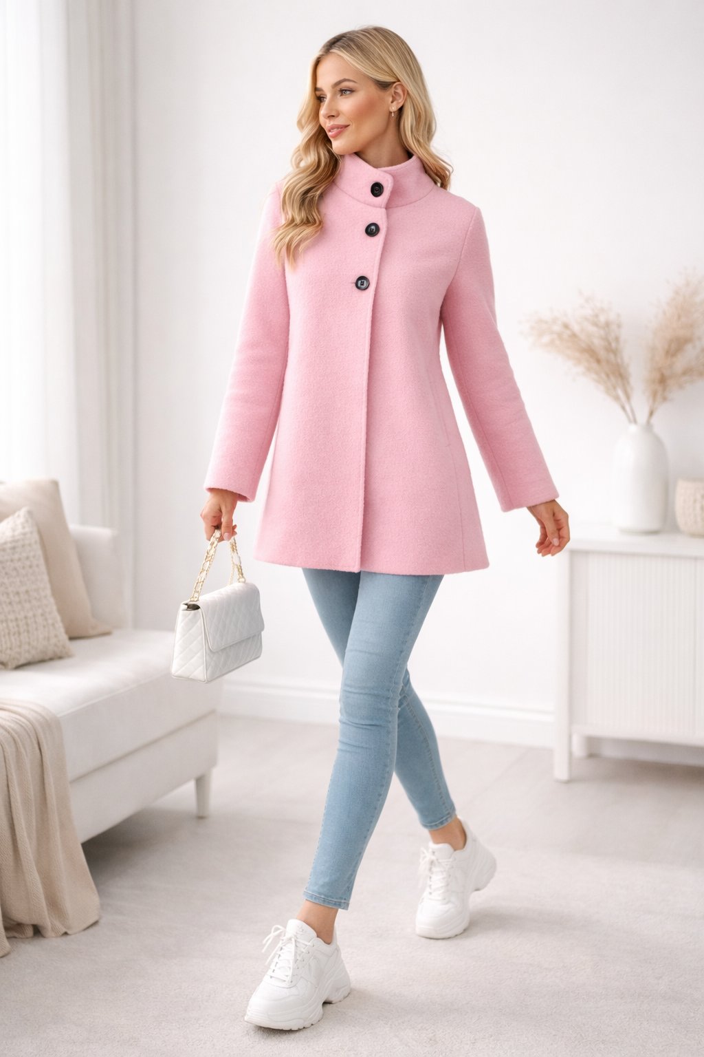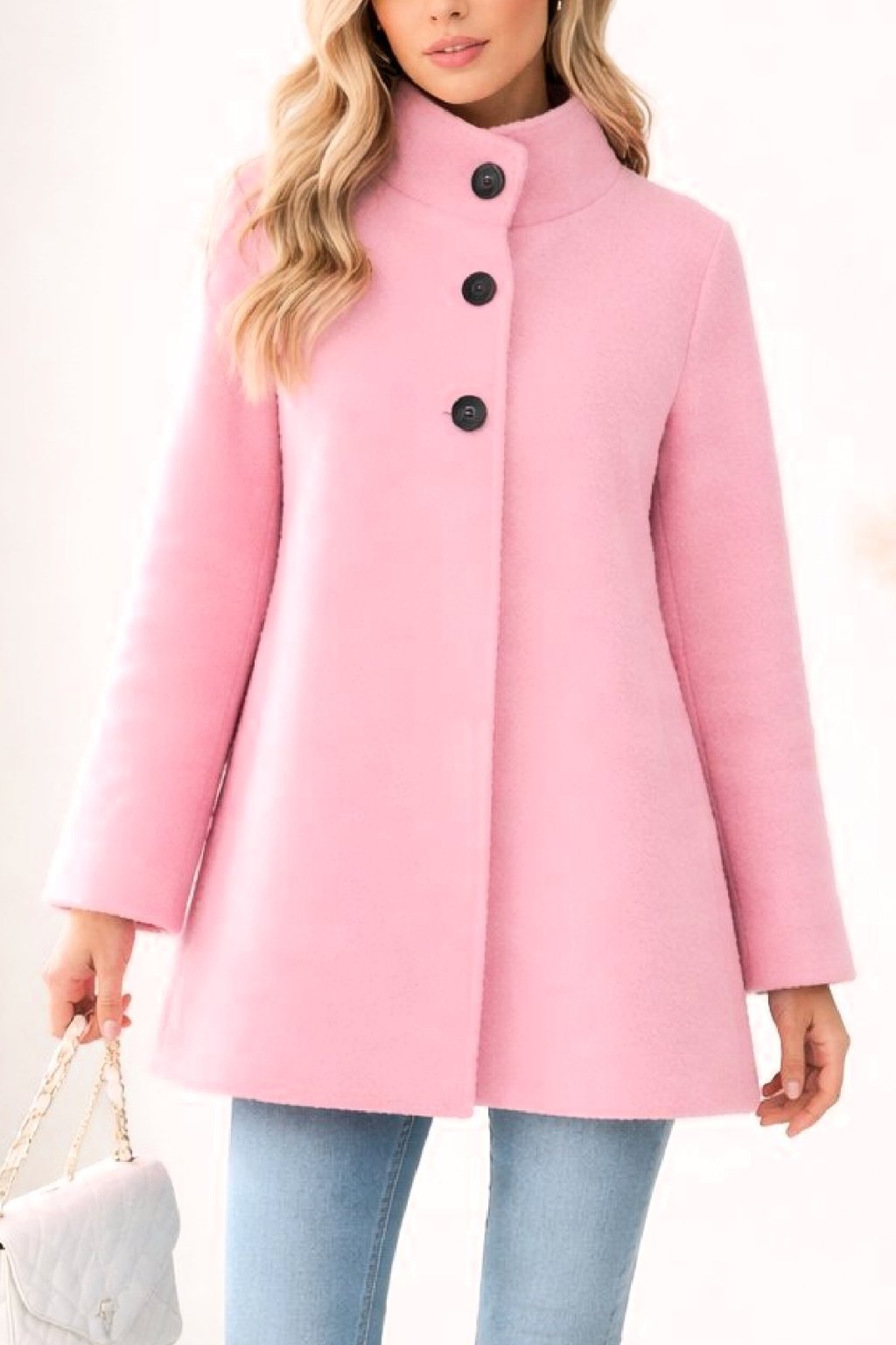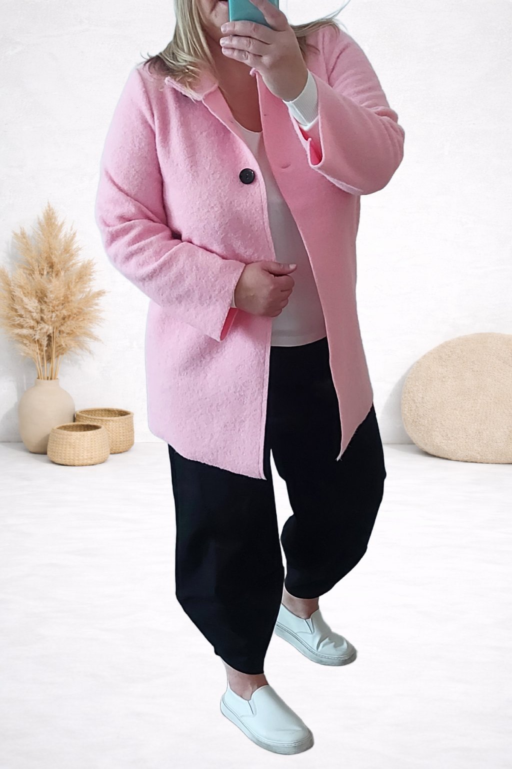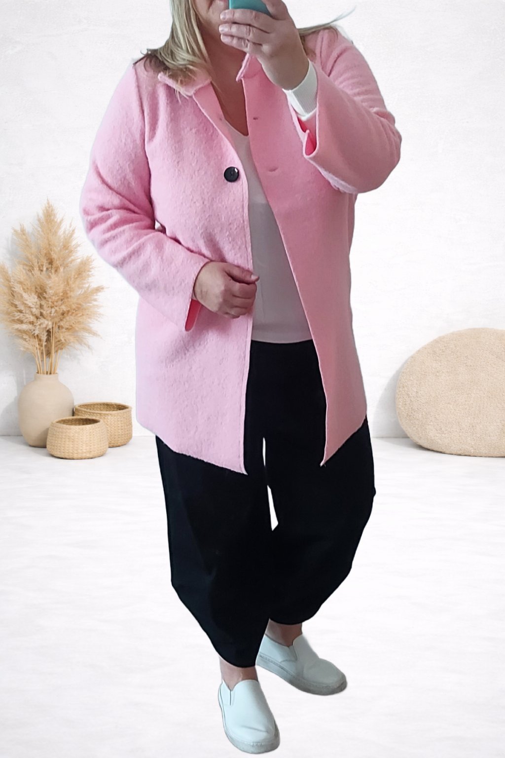 Trendy kabátek mírně áčkového střihu. Zapínání na knoflíky pouze v horní části. Menší stojáček, rukávy dlouhé. Bez kapes. Materiál s malými nopky, příjemný. Po obvodu pouze zastřiženo - švy nejsou zapošité. Bez podšívky. Ideální na jaro a podzim.