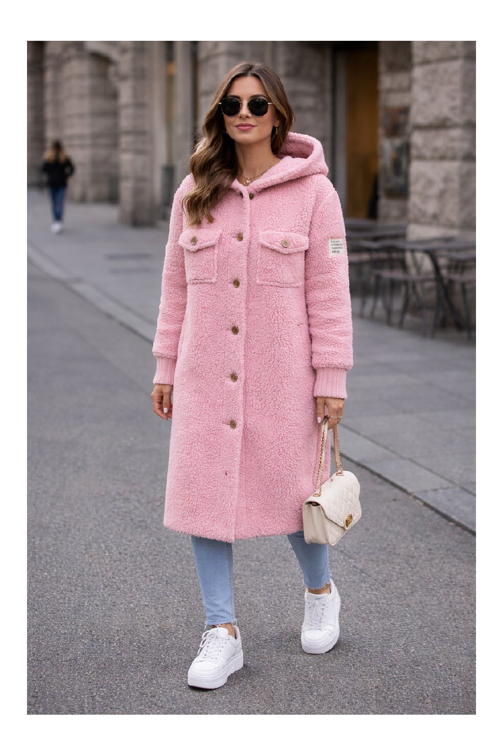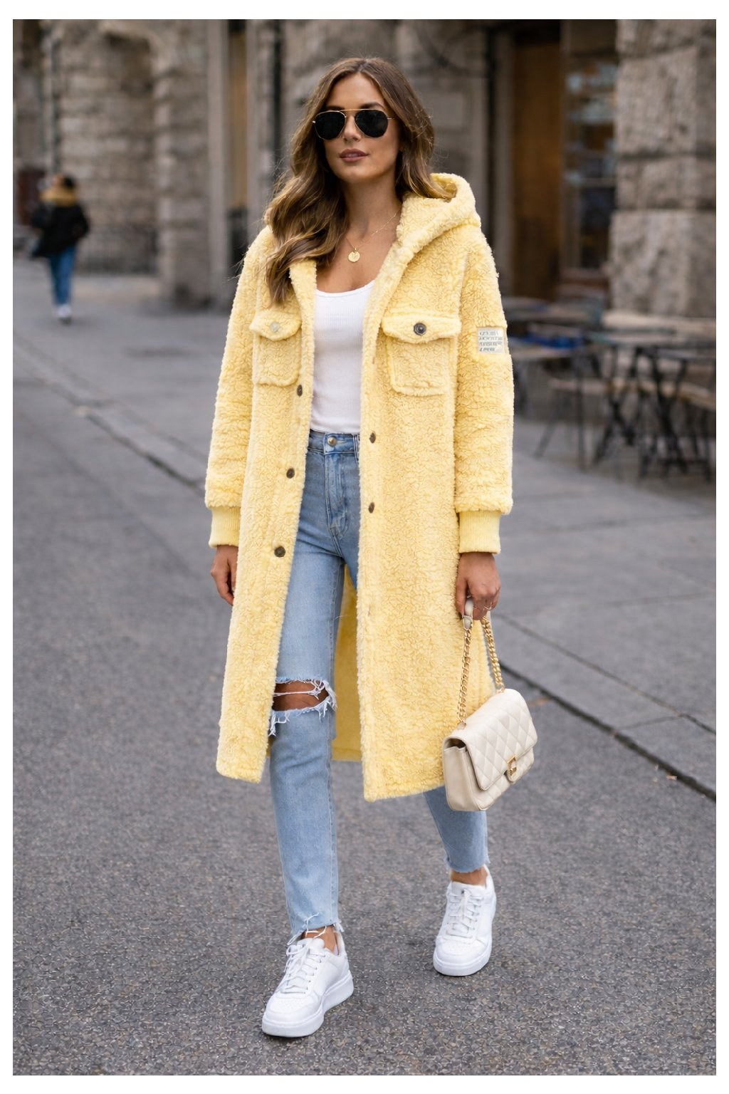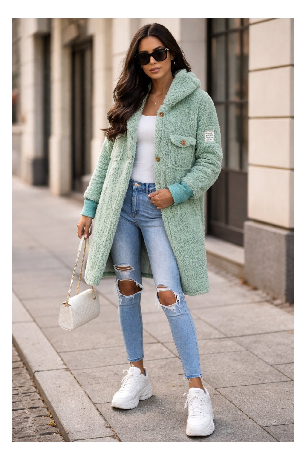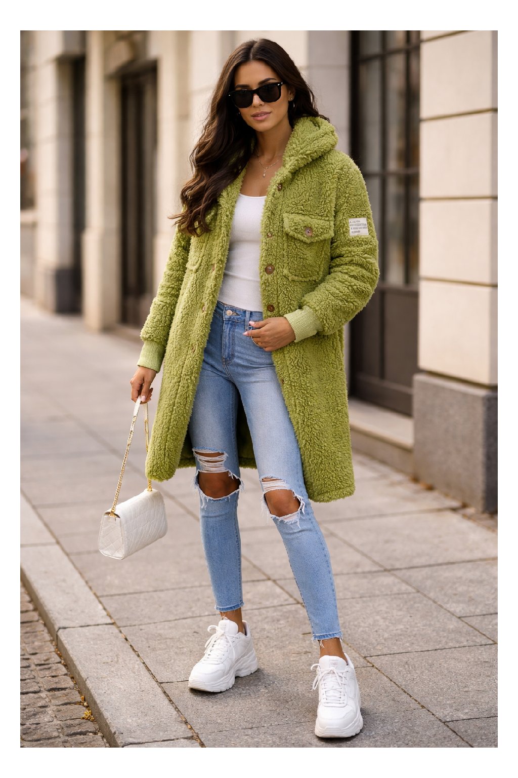 Trendy chlupatý huňatý kabátek s kapucí. Celopropínací na knoflíky. Dvě náprsní kapsy funkční, ale knoflíky jsou na ozdobu. Na jednom z rukávu ozdobná nášivka. Rukávy dlouhé ukončené delším úpletem obepínajícím ruku. Materiál měkký, hebký, velmi příjemný a pružný. Bez podšívky
