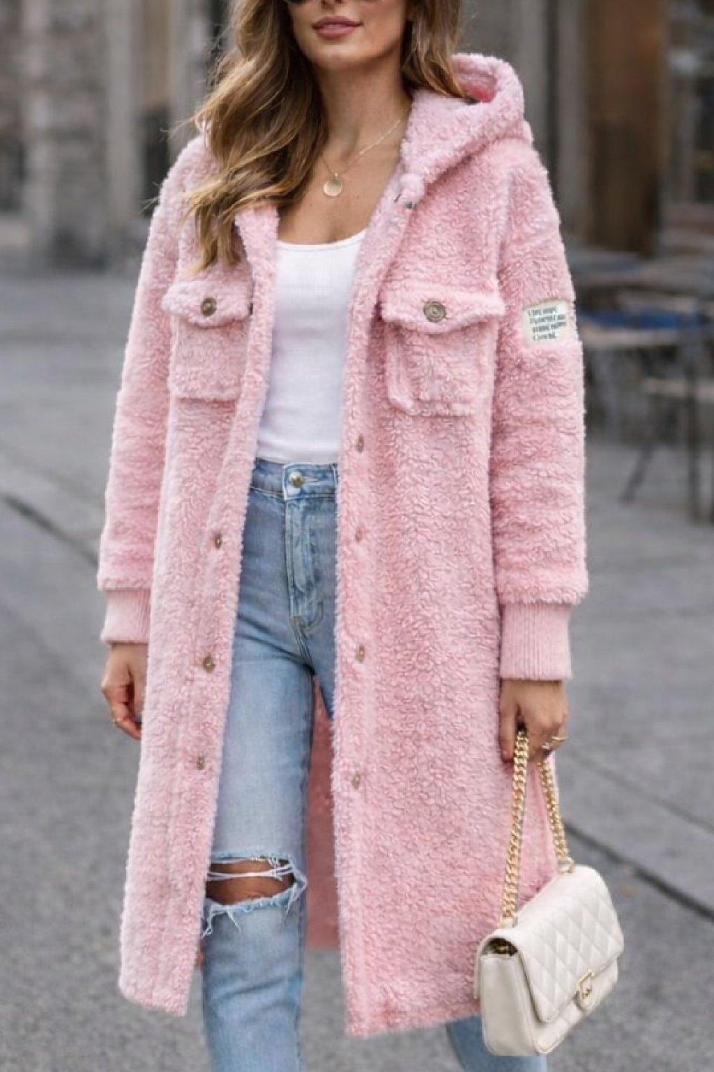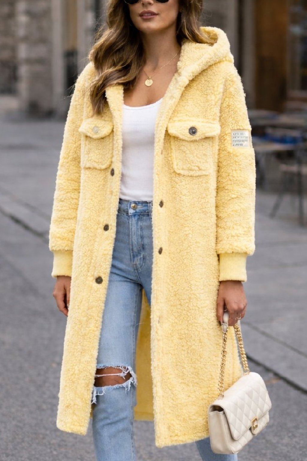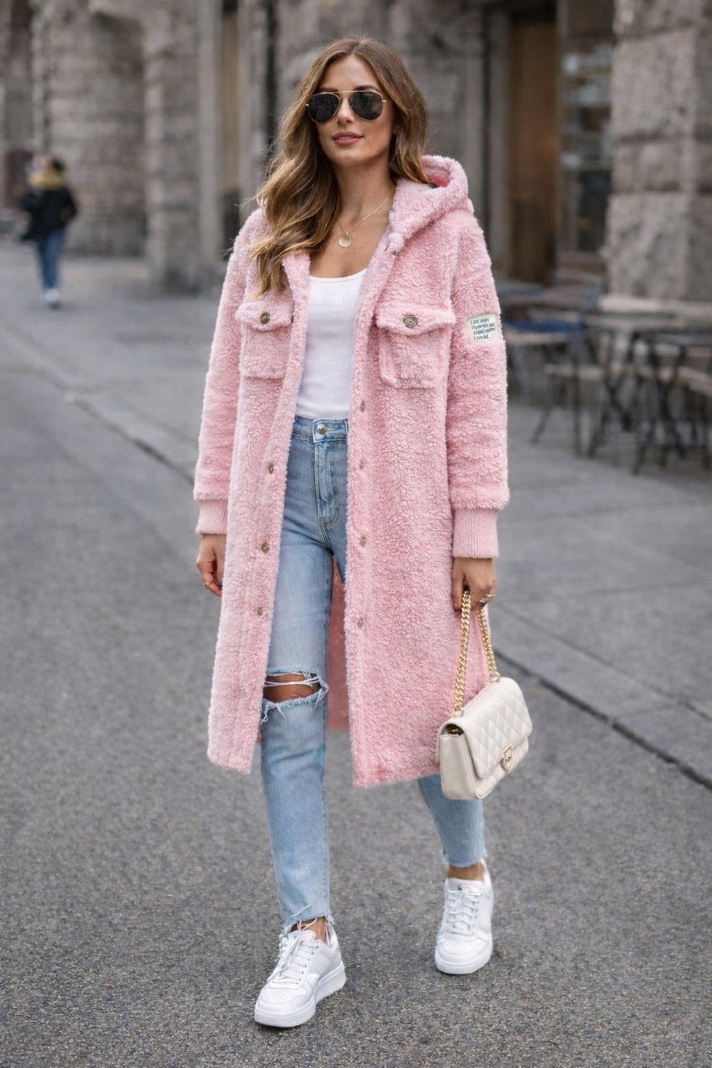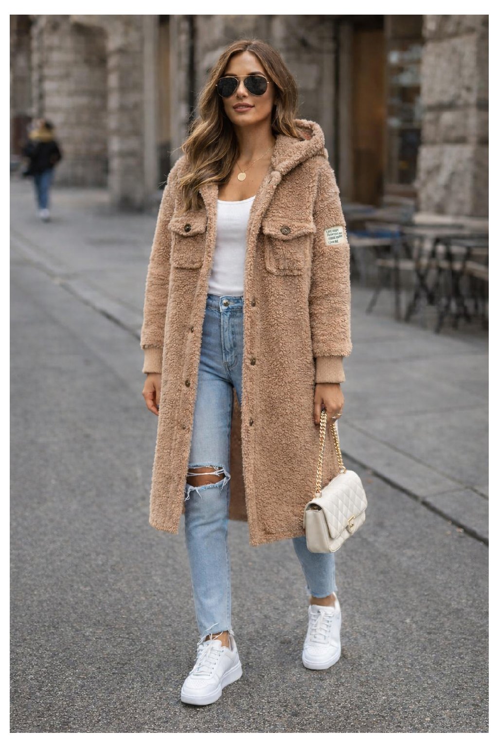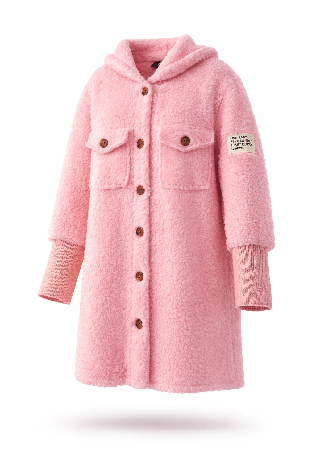 Trendy chlupatý huňatý kabátek s kapucí. Celopropínací na knoflíky. Dvě náprsní kapsy funkční, ale knoflíky jsou na ozdobu. Na jednom z rukávu ozdobná nášivka. Rukávy dlouhé ukončené delším úpletem obepínajícím ruku. Materiál měkký, hebký, velmi příjemný a pružný. Bez podšívky