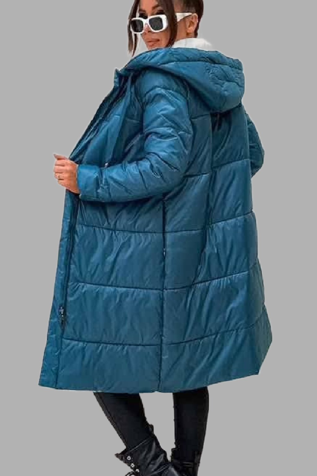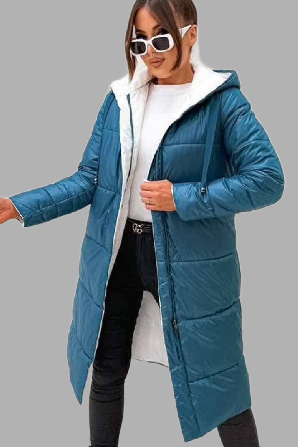 Zimní oboustranný bundokabát. Má kapuci, kterou nelze odepnout. Zapínání na zip. Boční kapsy jsou také na zip. Z jedné strany je bunda v nádherné petrolej barvě, z druhé strany v krémovém provedení. Velikosti odpovídají. Vel. S focena na vel. XS, výška 156cm.