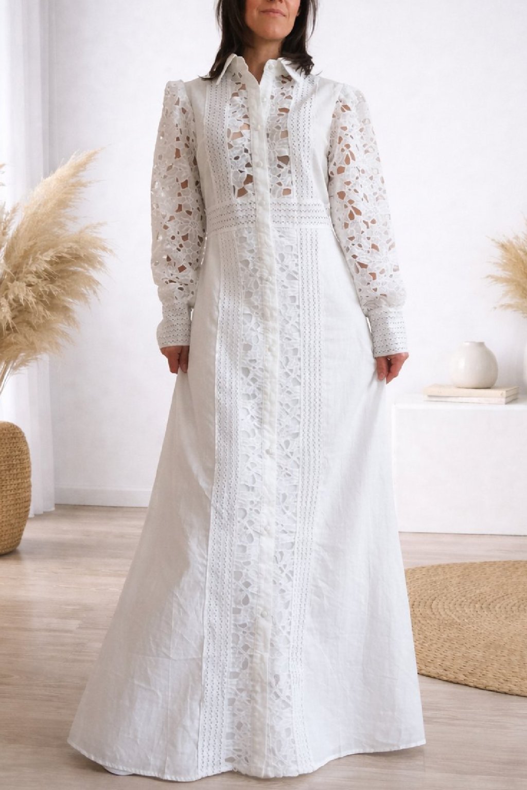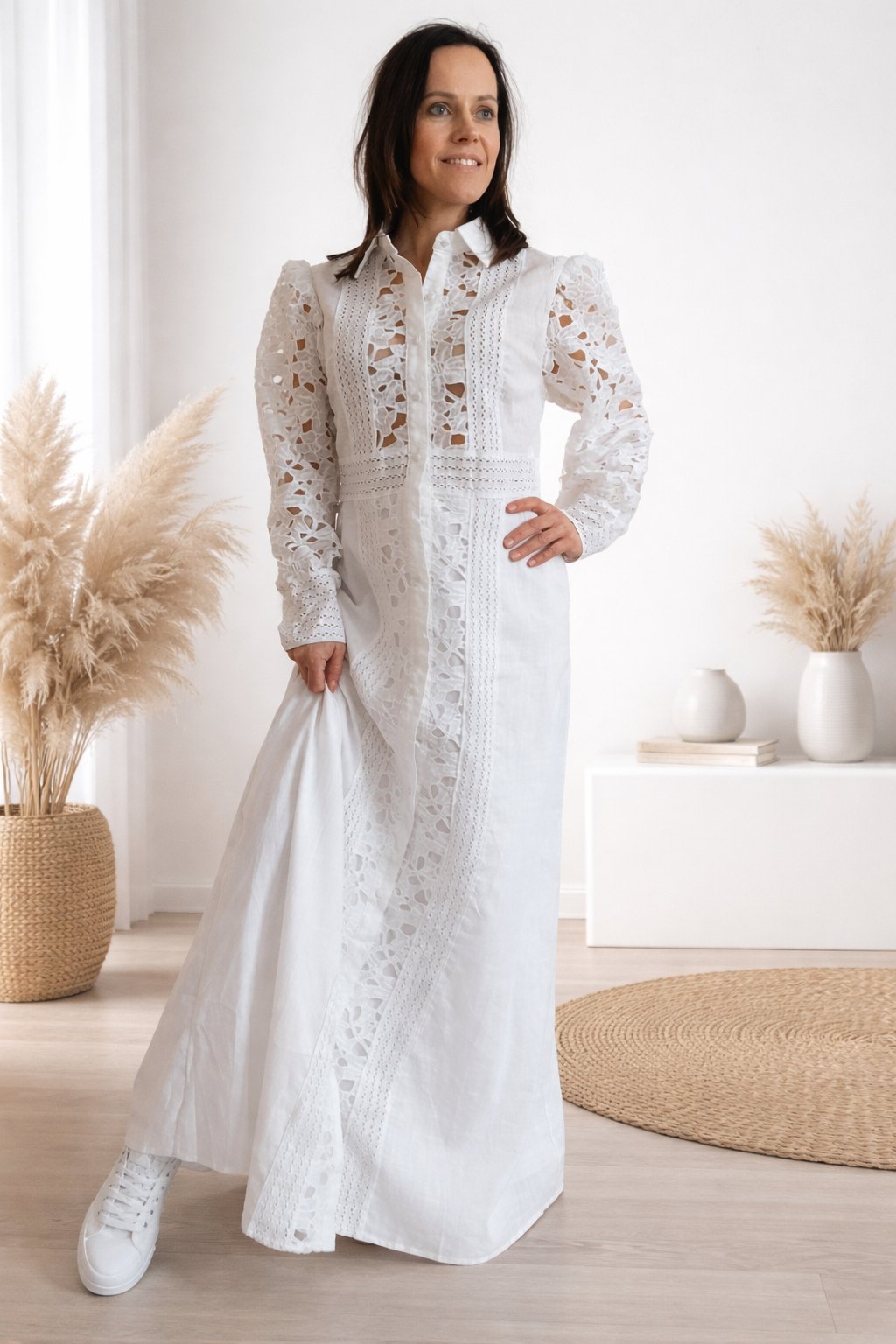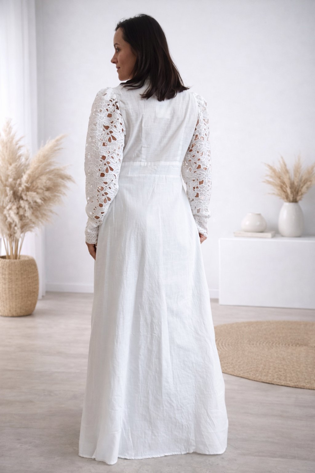 Nádherné dlouhé šaty v antickém stylu. Zapínání po celé délce na knoflíky. Mají límeček. Rukávy jsou dlouhé - děrované s výšivkou a ukončené zapínáním na knoflíčky. Výšivka a děrování je i na předním dílu celých šatů. V pase projmuté. Od pasu dolů je pod šaty podšívka. Do pasu nahoru podšité nejsou a je s tím třeba počítat a využít třeba bílý top či spodní prádlo. Materiál jakoby plátěný, prodyšný není pružný. Foceno na vel. XS, výška 156cm.