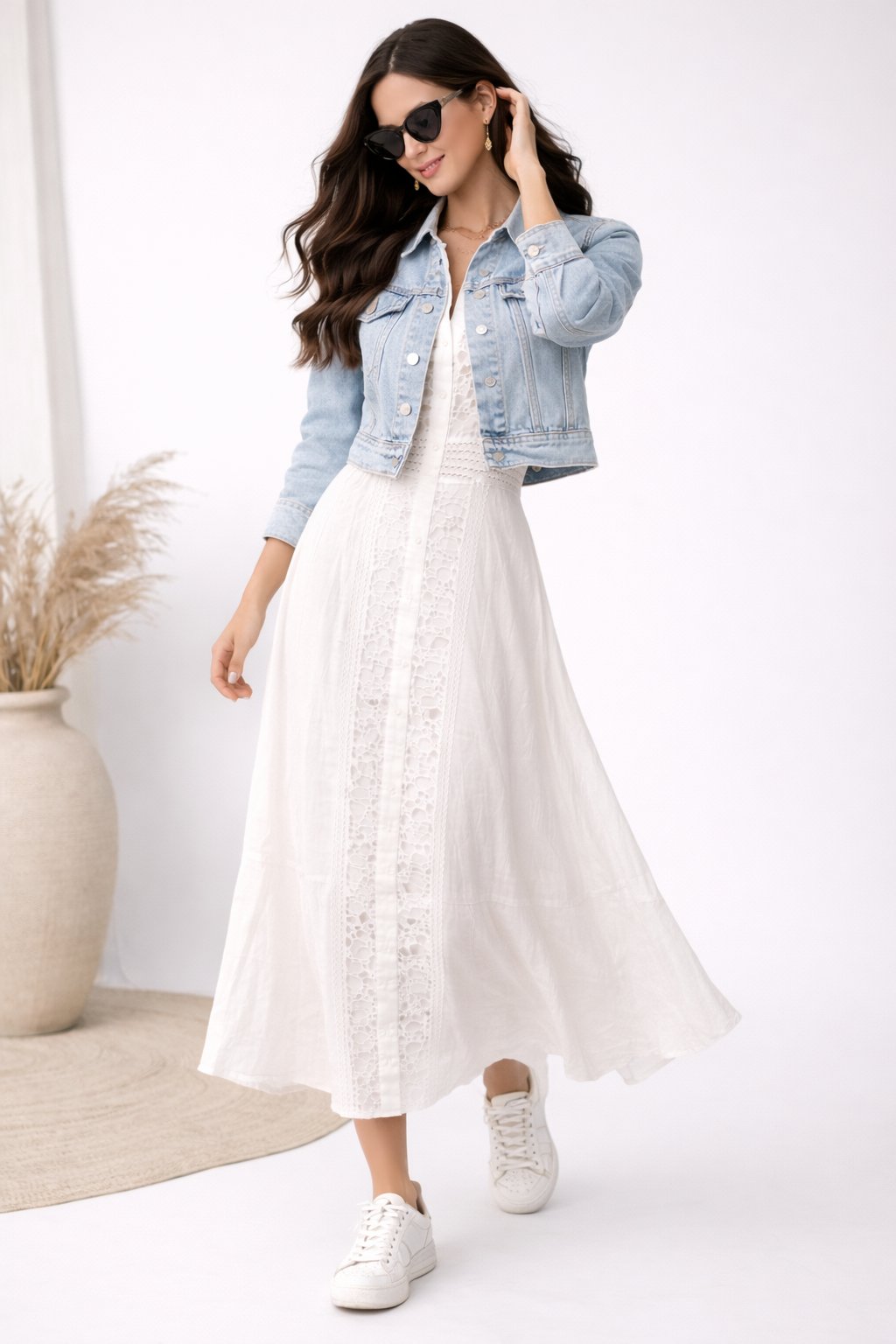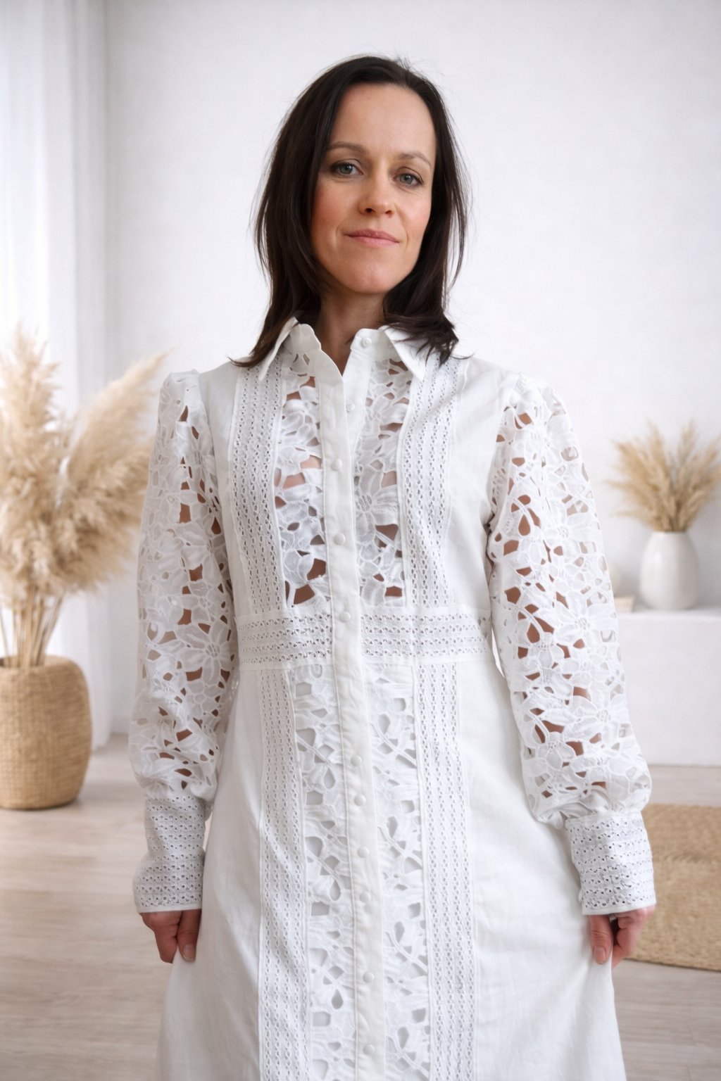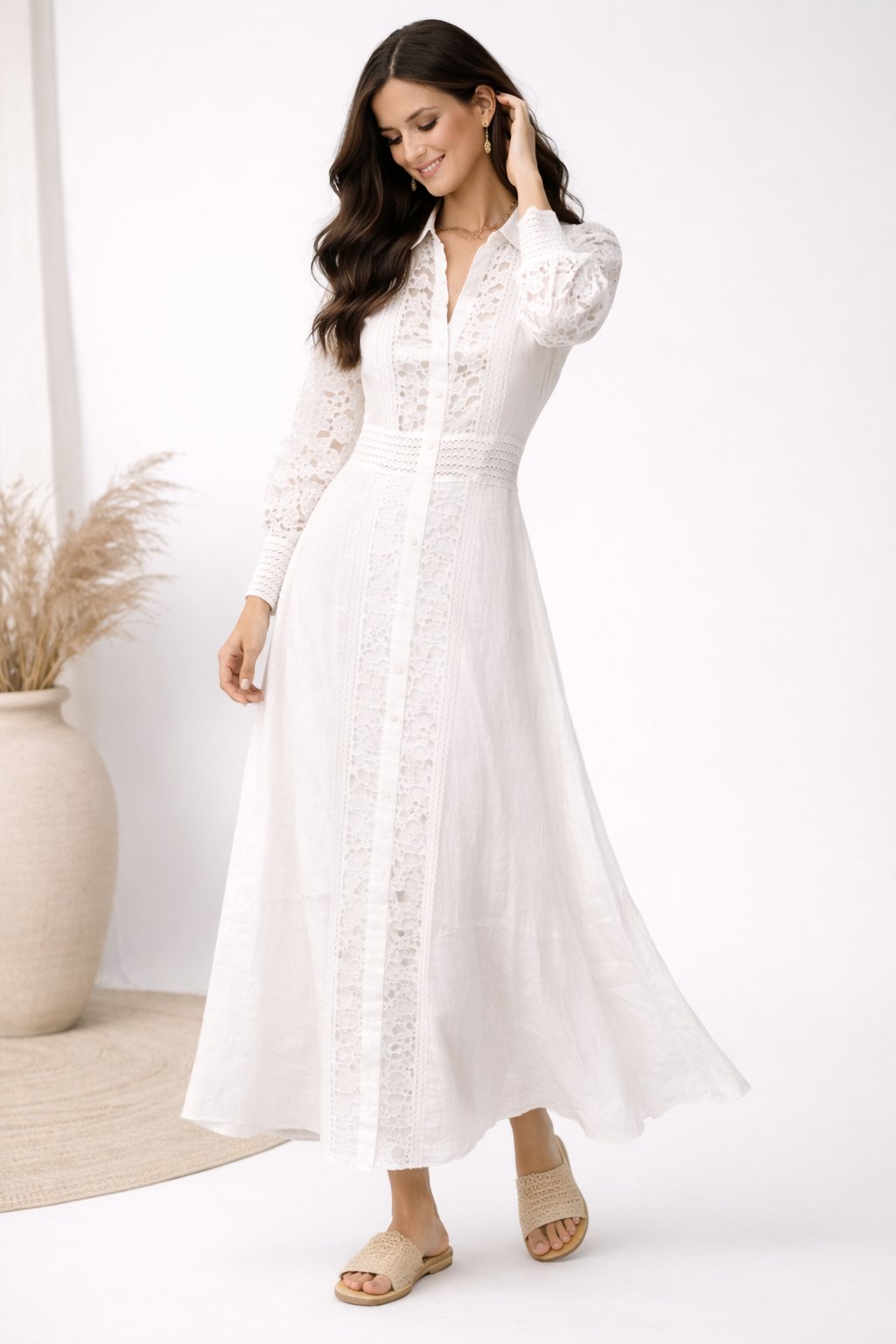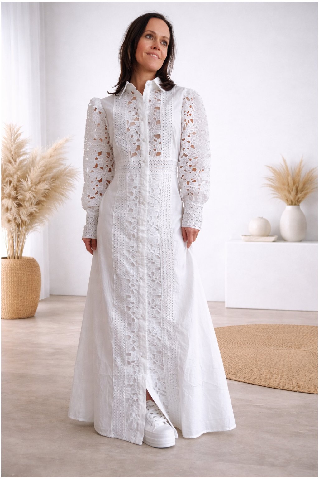 Nádherné dlouhé šaty v antickém stylu. Zapínání po celé délce na knoflíky. Mají límeček. Rukávy jsou dlouhé - děrované s výšivkou a ukončené zapínáním na knoflíčky. Výšivka a děrování je i na předním dílu celých šatů. V pase projmuté. Od pasu dolů je pod šaty podšívka. Do pasu nahoru podšité nejsou a je s tím třeba počítat a využít třeba bílý top či spodní prádlo. Materiál jakoby plátěný, prodyšný není pružný. Foceno na vel. XS, výška 156cm.