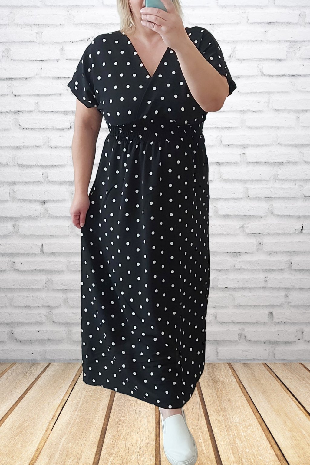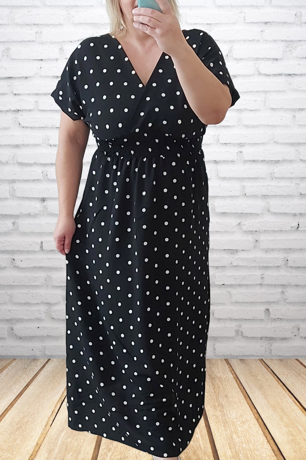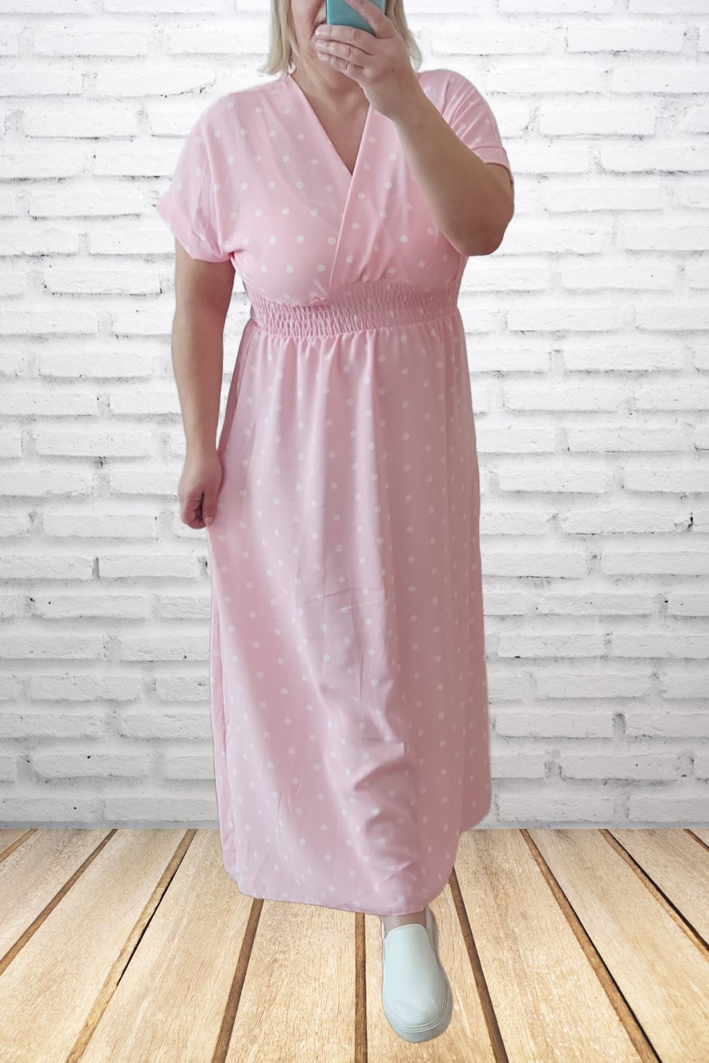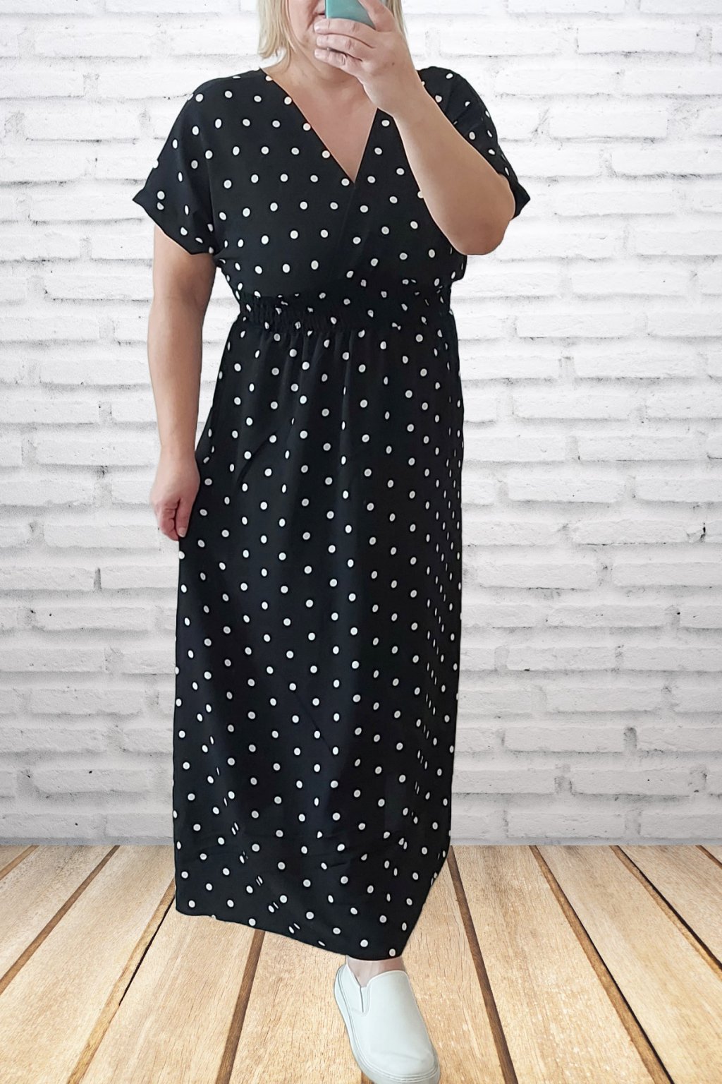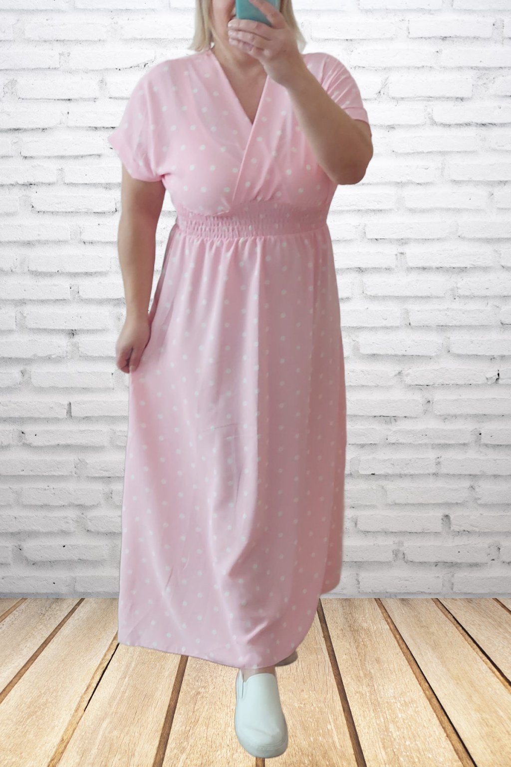 Dlouhé letní šaty s motivem puntíků. Véčkový výstřih vpředu i vzadu. Vzadu je navíc ve výstřihu i vázací šňůrka. Rukávy krátké. Pod prsy gumka, která se přizpůsobí obvodu. Na přední straně je tato gumka jako širší žabičkování, vzadu klasická. Bez kapes. Bez podšívky, ale nejsou průhledné. Materiál lehký, prodyšný a pružný. Foceno na vel. 2XL (prsa 116cm, boky 120cm), výška 165cm.