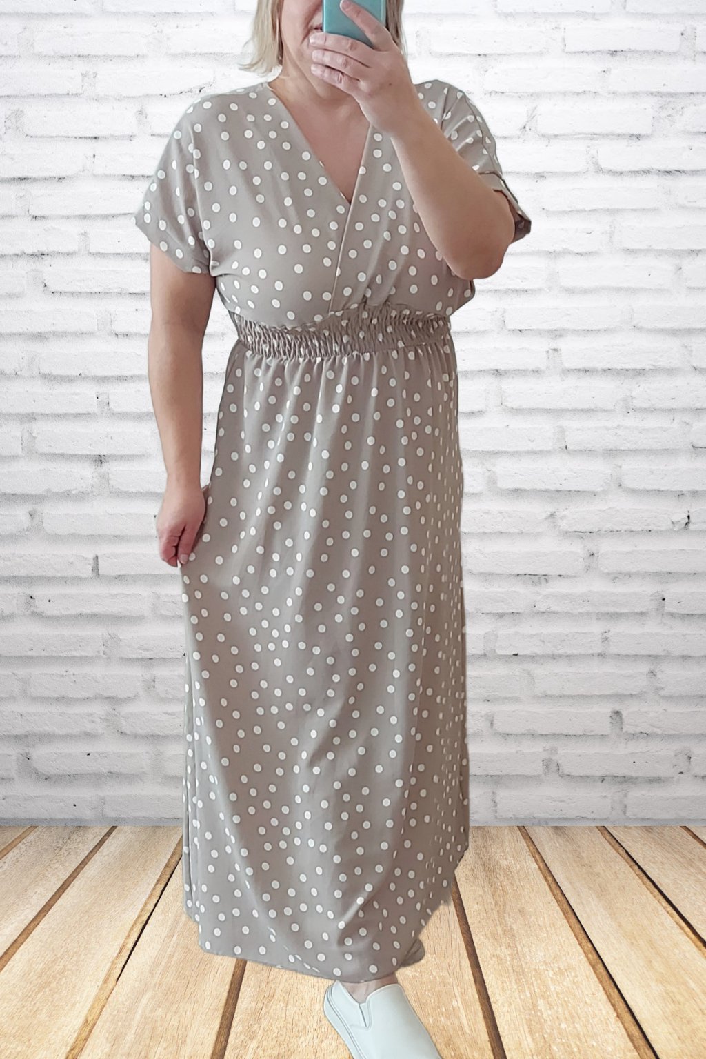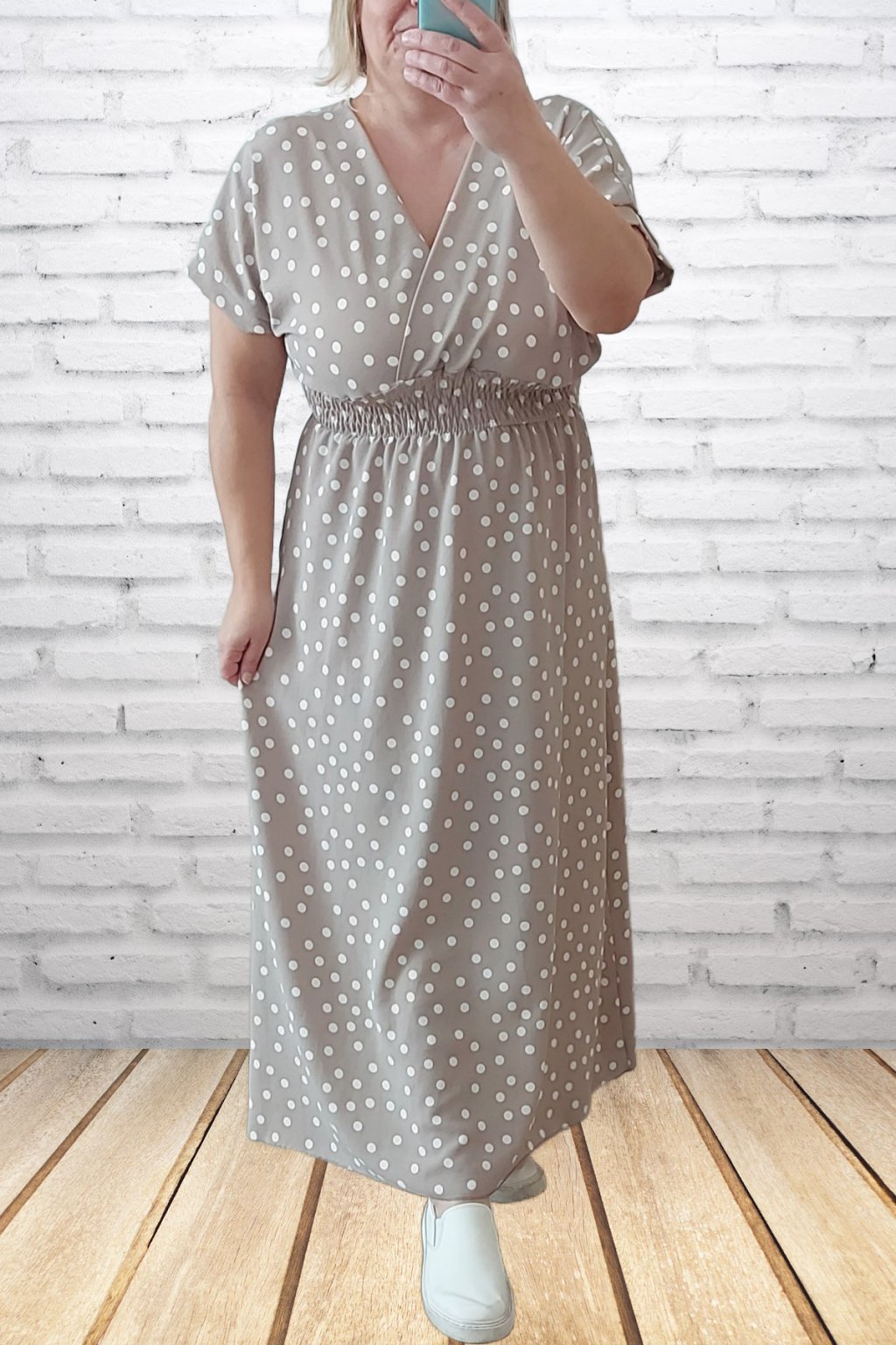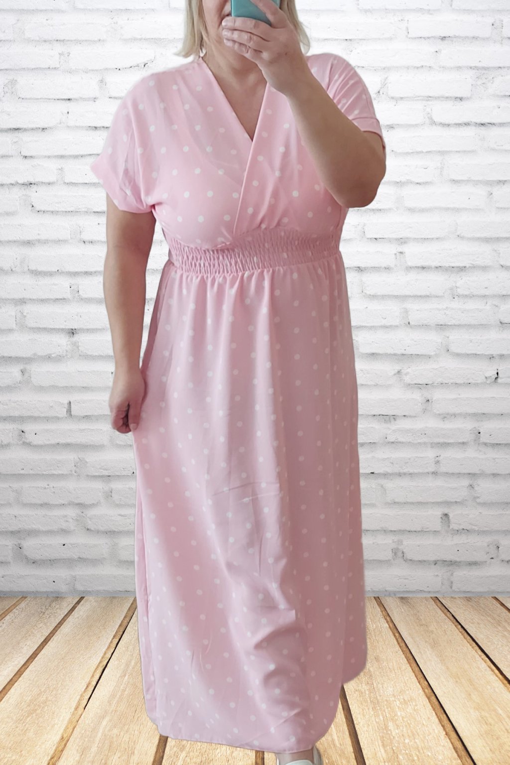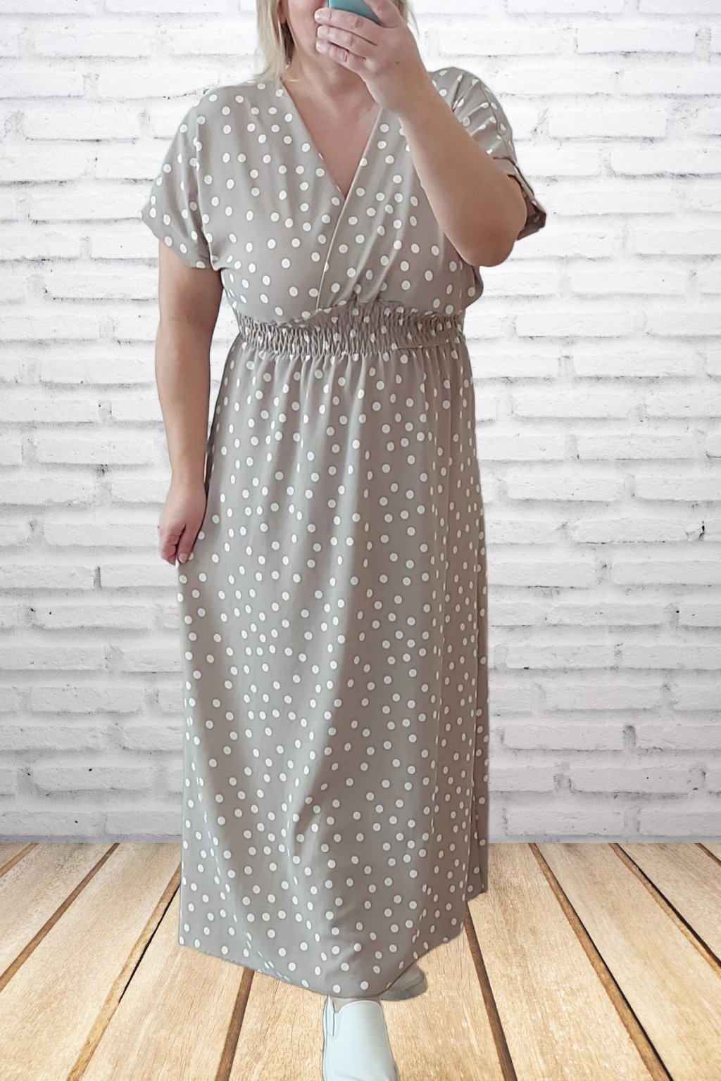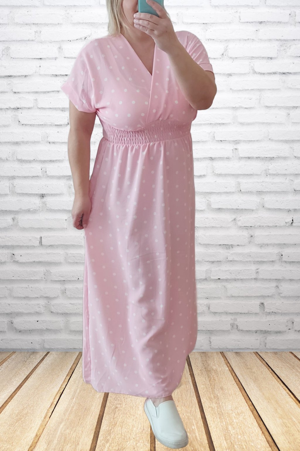Dlouhé letní šaty s motivem puntíků. Véčkový výstřih vpředu i vzadu. Vzadu je navíc ve výstřihu i vázací šňůrka. Rukávy krátké. Pod prsy gumka, která se přizpůsobí obvodu. Na přední straně je tato gumka jako širší žabičkování, vzadu klasická. Bez kapes. Bez podšívky, ale nejsou průhledné. Materiál lehký, prodyšný a pružný. Foceno na vel. 2XL (prsa 116cm, boky 120cm), výška 165cm.